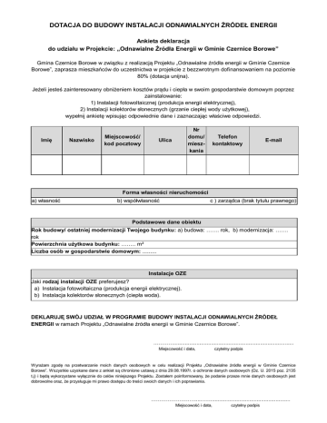 DOTACJA DO BUDOWY INSTALACJI ODNAWIALNYCH ŹRÓDEŁ ENERGII Ankieta deklaracja do udziału w Projekcie: „Odnawialne Źródła Energii w Gminie Czernice Borowe” Gmina Czernice Borowe w związku z realizacją Projektu „Odnawialne źródła energii w Gminie Czernice Borowe”, zaprasza mieszkańców do uczestnictwa w projekcie z bezzwrotnym dofinansowaniem na poziomie 80% (dotacja unijna). Jeżeli jesteś zainteresowany obniżeniem kosztów prądu i ciepła w swoim gospodarstwie domowym poprzez zainstalowanie: 1) Instalacji fotowoltaicznej (produkcja energii elektrycznej), 2) Instalacji kolektorów słonecznych (grzanie ciepłej wody użytkowej), wypełnij ankietę wpisując odpowiednie dane i zaznaczając właściwe odpowiedzi. Imię Nazwisko Miejscowość/ kod pocztowy Nr domu/ mieszkania Ulica Telefon kontaktowy E-mail Forma własności nieruchomości a) własność b) współwłasność c ) zarządca (brak tytułu prawnego) Podstawowe dane obiektu Rok budowy/ ostatniej modernizacji Twojego budynku: a) budowa: ……. rok, b) modernizacja: ……. rok Powierzchnia użytkowa budynku: .……. m² Liczba osób w gospodarstwie domowym: ......... Instalacje OZE Jaki rodzaj instalacji OZE preferujesz? a) Instalacja fotowoltaiczna (produkcja energii elektrycznej). b) Instalacja kolektorów słonecznych (ciepła woda). DEKLARUJĘ SWÓJ UDZIAŁ W PROGRAMIE BUDOWY INSTALACJI ODNAWIALNYCH ŹRÓDEŁ ENERGII w ramach Projektu „Odnawialne źródła energii w Gminie Czernice Borowe”. …………................................................................................... Miejscowość i data, czytelny podpis Wyrażam zgodę na przetwarzanie moich danych osobowych w celu realizacji Projektu „Odnawialne źródła energii w Gminie Czernice Borowe”. Wszystkie uzyskane dane z ankiet są chronione ustawą z dnia 29.08.1997r. o ochronie danych osobowych (Dz. U. 2015 poz. 2135 t.j) i będą wykorzystane wyłącznie do celów niniejszego Projektu. Zostałem poinformowany, że podanie przeze mnie danych osobowych jest dobrowolne oraz, że przysługuje mi prawo dostępu do treści swoich danych i ich poprawiania. ………………………...……....................................................... Miejscowość i data, czytelny podpis
