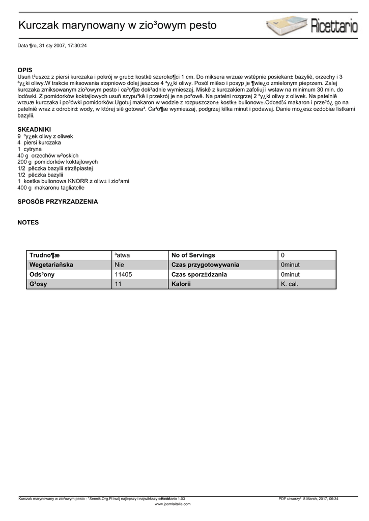 Kurczak marynowany w zio³owym pesto Data ¶ro, 31 sty 2007, 17:30:24 OPIS Usuñ t³uszcz z piersi kurczaka i pokrój w grub± kostkê szeroko¶ci 1 cm. Do miksera wrzuæ wstêpnie posiekan± bazyliê, orzechy i 3 ³y¿ki oliwy.W trakcie miksowania stopniowo dolej jeszcze 4 ³y¿ki oliwy. Posól miêso i posyp je ¶wie¿o zmielonym pieprzem. Zalej kurczaka zmiksowanym zio³owym pesto i ca³o¶æ dok³adnie wymieszaj. Miskê z kurczakiem zafoliuj i wstaw na minimum 30 min. do lodówki. Z pomidorków koktajlowych usuñ szypu³kê i przekrój je na po³owê. Na patelni rozgrzej 2 ³y¿ki oliwy z oliwek. Na patelniê wrzuæ kurczaka i po³ówki pomidorków.Ugotuj makaron w wodzie z rozpuszczon± kostk± bulionow±.Odced¼ makaron i prze³ó¿ go na patelniê wraz z odrobin± wody, w której siê gotowa³. Ca³o¶æ wymieszaj, podgrzej kilka minut i podawaj. Danie mo¿esz ozdobiæ listkami bazylii. SK£ADNIKI 9 ³y¿ek oliwy z oliwek 4 piersi kurczaka 1 cytryna 40 g orzechów w³oskich 200 g pomidorków koktajlowych 1/2 pêczka bazylii strzêpiastej 1/2 pêczka bazylii 1 kostka bulionowa KNORR z oliw± i zio³ami 400 g makaronu tagliatelle SPOSÓB PRZYRZADZENIA NOTES Trudno¶æ ³atwa No of Servings 0 Wegetariañska Nie Czas przygotowywania 0minut Ods³ony 11405 Czas sporz±dzania 0minut G³osy 11 Kalorii K. cal. Kurczak marynowany w zio³owym pesto - *Sennik.Org.Pl twój najlepszy i najwiêkszy sennik! Ricettario 1.03 www.joomlaitalia.com PDF utworzy³ 8 March, 2017, 06:34