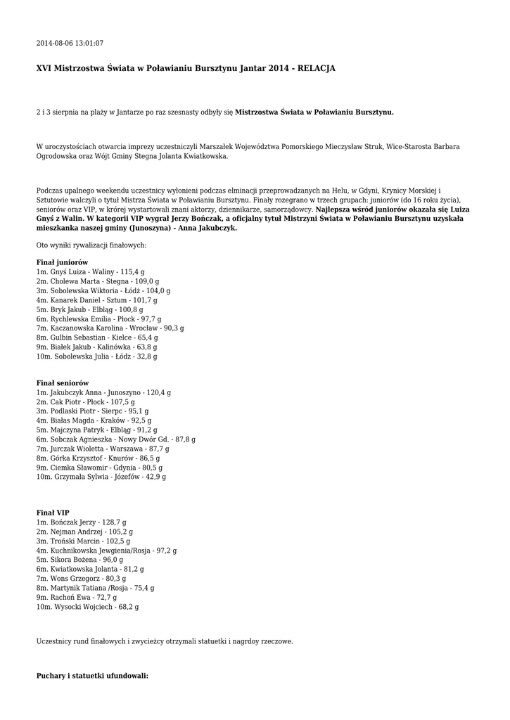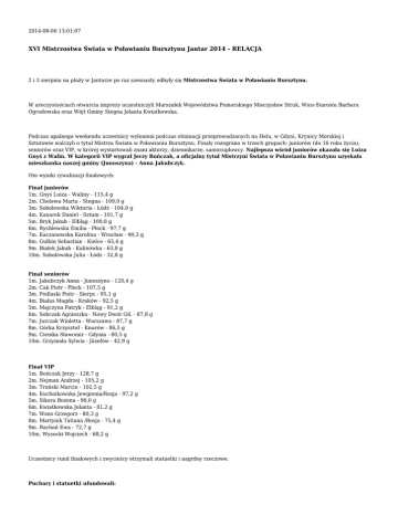 2014-08-06 13:01:07 XVI Mistrzostwa Świata w Poławianiu Bursztynu Jantar 2014 - RELACJA 2 i 3 sierpnia na plaży w Jantarze po raz szesnasty odbyły się Mistrzostwa Świata w Poławianiu Bursztynu. W uroczystościach otwarcia imprezy uczestniczyli Marszałek Województwa Pomorskiego Mieczysław Struk, Wice-Starosta Barbara Ogrodowska oraz Wójt Gminy Stegna Jolanta Kwiatkowska. Podczas upalnego weekendu uczestnicy wyłonieni podczas elminacji przeprowadzanych na Helu, w Gdyni, Krynicy Morskiej i Sztutowie walczyli o tytuł Mistrza Świata w Poławianiu Bursztynu. Finały rozegrano w trzech grupach: juniorów (do 16 roku życia), seniorów oraz VIP, w krórej wystartowali znani aktorzy, dziennikarze, samorządowcy. Najlepsza wśród juniorów okazała się Luiza Gnyś z Walin. W kategorii VIP wygrał Jerzy Bończak, a oficjalny tytuł Mistrzyni Świata w Poławianiu Bursztynu uzyskała mieszkanka naszej gminy (Junoszyna) - Anna Jakubczyk. Oto wyniki rywalizacji finałowych: Finał juniorów 1m. Gnyś Luiza - Waliny - 115,4 g 2m. Cholewa Marta - Stegna - 109,0 g 3m. Sobolewska Wiktoria - Łódż - 104,0 g 4m. Kanarek Daniel - Sztum - 101,7 g 5m. Bryk Jakub - Elbląg - 100,8 g 6m. Rychlewska Emilia - Płock - 97,7 g 7m. Kaczanowska Karolina - Wrocław - 90,3 g 8m. Gulbin Sebastian - Kielce - 65,4 g 9m. Białek Jakub - Kalinówka - 63,8 g 10m. Sobolewska Julia - Łódz - 32,8 g Finał seniorów 1m. Jakubczyk Anna - Junoszyno - 120,4 g 2m. Cak Piotr - Płock - 107,5 g 3m. Podlaski Piotr - Sierpc - 95,1 g 4m. Białas Magda - Kraków - 92,5 g 5m. Majczyna Patryk - Elbląg - 91,2 g 6m. Sobczak Agnieszka - Nowy Dwór Gd. - 87,8 g 7m. Jurczak Wioletta - Warszawa - 87,7 g 8m. Górka Krzysztof - Knurów - 86,5 g 9m. Ciemka Sławomir - Gdynia - 80,5 g 10m. Grzymała Sylwia - Józefów - 42,9 g Finał VIP 1m. Bończak Jerzy - 128,7 g 2m. Nejman Andrzej - 105,2 g 3m. Troński Marcin - 102,5 g 4m. Kuchnikowska Jewgienia/Rosja - 97,2 g 5m. Sikora Bożena - 96,0 g 6m. Kwiatkowska Jolanta - 81,2 g 7m. Wons Grzegorz - 80,3 g 8m. Martynik Tatiana /Rosja - 75,4 g 9m. Rachoń Ewa - 72,7 g 10m. Wysocki Wojciech - 68,2 g Uczestnicy rund finałowych i zwycieżcy otrzymali statuetki i nagrdoy rzeczowe. Puchary i statuetki ufundowali: Marszałek Województwa Pomorskiego Mieczysław Struk Dyrektor Polskiego Radia Programu Pierwszego Kamil Dąbrowa Starostwo Powiatowe w Nowym Dworze Gdańskim Gmina Stegna Prezes Lokalnej Organizacji Turystycznej Roman Gaik Firma „Champion” Nowy Dwór Gdański Nagrody ufundowali: Urząd Marszałkowski Województwa Pomorskiego Portal Internetowy „www.mierzeja.pl” P.H.U „Medal” Olsztyn PKS Elbląg Firma „My Amber” Sztutowo Firma „Enjoy” Warszawa O.W Krakus Stegna Program Pierwszy Polskiego Radia Lokalna Organizacja Turystyczna “Jantarowe Wybrzeże” Podczas trwania Mistrzostw, oprócz zmagań w poszukiwaniu bursztynu na mieszkańców i turystów czekało wiele atrakcji. Na plaży odbywały się rodzinne zawody family Cup. Dzieci zabawiali szczudlarze, kaluni i magik. Obyło się także bolonowe show. Wieczorami odbywały sie koncery i pokaz sztucznych ogni. Na Letniej Scenie Radiowej Jedynki wystąpiły zespoły Deja Vu, BE MY, Steamlove, Shata Qś oraz gościnnie Liroy. Rozegrano także czwarty konkurs eliminacyjny wyborów Bursztynowej Miss Polski . Osiem dziewcząt z całej Polski walczyło o prawo startu w Wielkim Finale oraz o cenne nagrody. Kandydatki zaprezentowały się w czterech wyjściach konkursowych: -w kolekcji letniej -w jedno i dwu częściowych strojach kąpielowych -w wyjściu sponsorowanym Jury tytuł Bursztynowej Miss Polski Jantar 2014 przyznało Pani Alicji Ładzie z Kępek, równocześnie publiczność mianowała ją Bursztynową Miss Publiczności. Nadano również następujące tytuły komplementarne: -Bursztynową Miss Polski Uroda 2014 została Milena Suchowiecka z Warszawy -Bursztynową Miss Polski Fantazja 2014 została Aleksandra Grysz z Iławy -Bursztynową Miss Polski Slim Express 2014 została Patrycja Daszkiewicz z Giżycka Imprezę poprowadził znany komentator sportowy Rafał Patyra. XVI Mistrzostwa w Poławianiu Bursztynu odbyły się pod patronatem: Polskiego Radia Program Pierwszy; Marszałka Senatu Bogdana Borusewicza; Marszałka woj. pomorskiego Mieczysława Struk; Burmistrza Helu Mirosław Wądołowski; Radia Gdańsk Relację foto z imprezy można zobaczyć tutaj, klikając na link: 1. dzień - sobota 2. dzień - niedziela Relację telewizyjną TVreginalna24.pl można zobaczyć tutaj. Relację z wyborów Bursztynowej Miss można zobaczyć tutaj. O Mistrzostwa wspomniały także media: Teleexpress Panorama TVP Gdańsk Informacje o artykule Autor: Zredagował(a): Data powstania: 06.08.2014 13:01 Data ostatniej modyfikacji: 06.08.2014 13:11 Liczba wyświetleń: Wydrukowano z serwisu: Wydrukowano dnia: 196 stegna.pl 2017-03-08 07:31:26