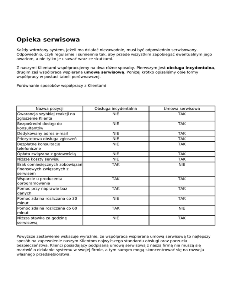 Opieka serwisowa Każdy wdrożony system, jeżeli ma działać niezawodnie, musi być odpowiednio serwisowany. Odpowiednio, czyli regularnie i sumiennie tak, aby przede wszystkim zapobiegać ewentualnym jego awariom, a nie tylko je usuwać wraz ze skutkami. Z naszymi Klientami współpracujemy na dwa różne sposoby. Pierwszym jest obsługa incydentalna, drugim zaś współpraca wspierana umową serwisową. Poniżej krótko opisaliśmy obie formy współpracy w postaci tabeli porównawczej. Porównanie sposobów współpracy z Klientami Nazwa pozycji Gwarancja szybkiej reakcji na zgłoszenie Klienta Bezpośredni dostęp do konsultantów Dedykowany adres e-mail Priorytetowa obsługa zgłoszeń Bezpłatne konsultacje telefoniczne Opłata związana z gotowością Niższe koszty serwisu Brak comiesięcznych zobowiązań finansowych związanych z serwisem Wsparcie u producenta oprogramowania Pomoc przy naprawie baz danych Pomoc zdalna rozliczana co 30 minut Pomoc zdalna rozliczana co 60 minut Niższa stawka za godzinę serwisową Obsługa incydentalna NIE Umowa serwisowa TAK NIE TAK NIE NIE NIE TAK TAK TAK NIE NIE TAK TAK TAK NIE TAK TAK TAK TAK NIE TAK TAK NIE NIE TAK Powyższe zestawienie wskazuje wyraźnie, że współpraca wspierana umową serwisową to najlepszy sposób na zapewnienie naszym Klientom najwyższego standardu obsługi oraz poczucia bezpieczeństwa. Klienci posiadający podpisaną umowę serwisową z naszą firmą nie muszą się martwić o działanie systemu w swojej firmie, a tym samym mogą skoncentrować się na rozwoju własnego przedsiębiorstwa. Powered by TCPDF (www.tcpdf.org)