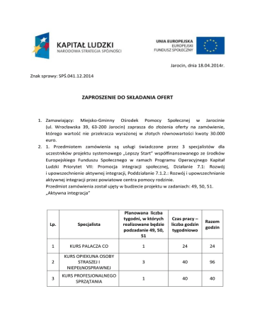Jarocin, dnia 18.04.2014r. Znak sprawy: SPŚ.041.12.2014 ZAPROSZENIE DO SKŁADANIA OFERT 1. Zamawiający: Miejsko-Gminny Ośrodek Pomocy Społecznej w Jarocinie (ul. Wrocławska 39, 63-200 Jarocin) zaprasza do złożenia oferty na zamówienie, którego wartość nie przekracza wyrażonej w złotych równowartości kwoty 30.000 euro. 2. 1. Przedmiotem zamówienia są usługi świadczone przez 3 specjalistów dla uczestników projektu systemowego „Lepszy Start” współfinansowanego ze środków Europejskiego Funduszu Społecznego w ramach Programu Operacyjnego Kapitał Ludzki Priorytet VII: Promocja integracji społecznej, Działanie 7.1: Rozwój i upowszechnienie aktywnej integracji, Poddziałanie 7.1.2.: Rozwój i upowszechnianie aktywnej integracji przez powiatowe centra pomocy rodzinie. Przedmiot zamówienia został ujęty w budżecie projektu w zadaniach: 49, 50, 51. „Aktywna integracja” Lp. Specjalista Planowana liczba tygodni, w których realizowane będzie podzadanie 49, 50, 51 1 KURS PALACZA CO 1 24 24 2 KURS OPIEKUNA OSOBY STRASZEJ I NIEPEŁNOSPRAWNEJ 3 40 96 3 KURS PROFESJONALNEGO SPRZĄTANIA 1 40 40 Czas pracy – liczba godzin tygodniowo Razem godzin 2. 2. Szczegółowy opis przedmiotu zamówienia: Lp. Specjalista 1 KURS PALACZA CO 2 KURS OPIEKUNA OSOBY STRASZEJ I NIEPEŁNOSPRAWNEJ 3 KURS PROFESJONALNEGO SPRZĄTANIA Miejsce i orientacyjny czas realizacji podzadania Wymagania Niezbędne dokumenty Miejsce realizacji: Jarocin, ul. Zaciszna Orientacyjny czas realizacji: Poniedziałek – piątek w godz. 8.30 – 20.15 Posiadanie niezbędnej wiedzy – kierunkowe wykształcenie, preferowane dodatkowe kwalifikacje. Posiadane minimum roczne doświadczenie w prowadzeniu w/w zajęć. Samodzielność, komunikatywność, odpowiedzialność, sumienność, zaangażowanie, umiejętności interpersonalne. Dyspozycyjność – gotowość świadczenia usług w ustalonym indywidualnie terminie. 1.Oferta 2. Dokumenty potwierdzające niezbędną wiedzę (kopie świadectw, zaświadczeń itp.) 3. Wykaz usług potwierdzający niezbędne doświadczenie 4. Oświadczenie o braku podstaw do wykluczenia z postępowania. 2.3. Dodatkowe informacje: przez godzinę rozumie się godzinę lekcyjną, tj. 45 minut, w przypadku zaistnienia sytuacji opóźnienia w przekazaniu środków finansowych na realizację projektu, Wykonawca zgadza się na przelew środków za wykonanie usługi niezwłocznie po otrzymaniu powyższych środków przez Zamawiającego. 3. Merytoryczne uzasadnienie konieczności dokonania zamówienia: udzielenie powyższego zamówienia publicznego o wartości nieprzekraczającej 30 000 euro jest niezbędne do realizacji zadania aktywnej integracji przewidzianego w budżecie projektu systemowego „Lepszy start”. 4. Oczekiwany termin realizacji zamówienia: maj 2014r. 5. Miejsce i termin złożenia oferty: ofertę należy składać osobiście lub za pośrednictwem poczty: do dnia 30.04.2014r. do godz. 12.00 w Miejsko-Gminnym Ośrodku Pomocy Społecznej w Jarocinie, ul. Wrocławska 39, 63-200 Jarocin , Biuro Obsługi Klienta, w zaklejonej kopercie ze wskazaniem nadawcy i dopiskiem: Oferta na przeprowadzenie kursu …………………………… Nie otwierać do dnia 30.04.2014r. do godz. 12.00 6. Warunki płatności: przelew. 7. Osoba upoważniona do kontaktu z wykonawcami: w celu dodatkowych informacji prosimy kontaktować się z: - Igor Armon, tel. 62 747 01 75, e-mail: [email protected] (w godz. 8.00 – 16.00) Miejsko-Gminny Ośrodek Pomocy Społecznej w Jarocinie ul. Wrocławska 39, 63-200 Jarocin tel. (62) 747 01 60, fax (62) 747 01 61 e-mail: [email protected] www.mgopsjarocin.home.pl