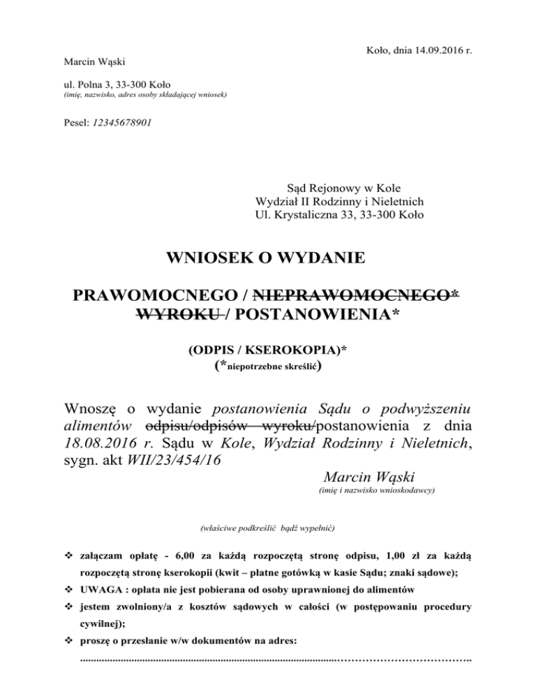 Koło, dnia 14.09.2016 r. Marcin Wąski ul. Polna 3, 33-300 Koło (imię, nazwisko, adres osoby składającej wniosek) Pesel: 12345678901 Sąd Rejonowy w Kole Wydział II Rodzinny i Nieletnich Ul. Krystaliczna 33, 33-300 Koło WNIOSEK O WYDANIE PRAWOMOCNEGO / NIEPRAWOMOCNEGO* WYROKU / POSTANOWIENIA* (ODPIS / KSEROKOPIA)* (*niepotrzebne skreślić) Wnoszę o wydanie postanowienia Sądu o podwyższeniu alimentów odpisu/odpisów wyroku/postanowienia z dnia 18.08.2016 r. Sądu w Kole, Wydział Rodzinny i Nieletnich, sygn. akt WII/23/454/16 Marcin Wąski (imię i nazwisko wnioskodawcy) (właściwe podkreślić bądź wypełnić) załączam opłatę - 6,00 za każdą rozpoczętą stronę odpisu, 1,00 zł za każdą rozpoczętą stronę kserokopii (kwit – płatne gotówką w kasie Sądu; znaki sądowe); UWAGA : opłata nie jest pobierana od osoby uprawnionej do alimentów jestem zwolniony/a z kosztów sądowych w całości (w postępowaniu procedury cywilnej); proszę o przesłanie w/w dokumentów na adres: ...............................................................................................……………………………….. dokumenty odbiorę osobiście - proszę zawiadomić mnie telefonicznie o terminie odbioru, nr tel.: 502678456