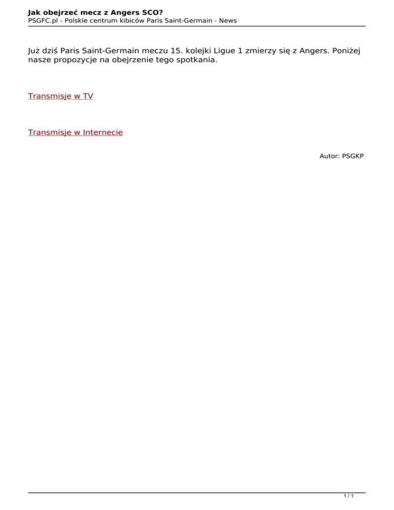 Jak obejrzeć mecz z Angers SCO? PSGFC.pl - Polskie centrum kibiców Paris Saint-Germain - News Już dziś Paris Saint-Germain meczu 15. kolejki Ligue 1 zmierzy się z Angers. Poniżej nasze propozycje na obejrzenie tego spotkania. Transmisje w TV Transmisje w Internecie Autor: PSGKP 1/1 Powered by TCPDF (www.tcpdf.org)
