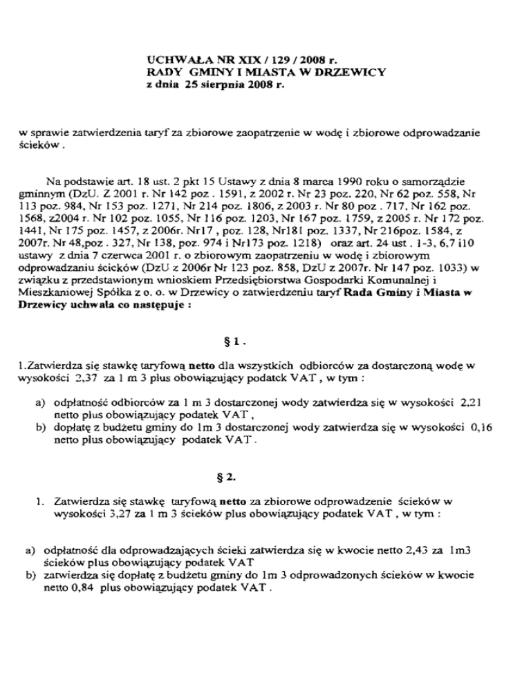 UCHWALA NR XIX 1129/2008 r. RAllY GMINY I MIASTA W DRZEWICY z dnia 25 sierpnia 2008 r. w sprawie zatwierdzenia taryf za zbiorowe zaopatrzenie w wode i zbiorowe odprowadzanie sciekow . Na podstawie art. 18 ust. 2 pkt 15 Ustawy z dnia 8 marca 1990 roku 0 samorzadzie gminnym (DzU. Z 2001 r. Nr 142 paz. 1591, z 2002 r. Nr 23 paz. 220, Nr 62 poz. 558, Nr 113 paz. 984, Nr 153 poz. 1271, Nr 214 paz. 1806, z2003 r. Nr 80 paz. 717, Nr 162 paz. 1568, ZZ004 r. Nr 102 paz. 1055, Nr 116 paz. 1203, Nr 167 paz. 1759, z2005 r. Nr 172 paz. 1441, Nr 175 paz. 1457, z2006r. Nr17, paz. 128, Nr181 poz. 1337, Nr2I6poz. 1584, z 2007r. Nr 48,poz . 327, Nr 138, paz. 974 i Nr173 poz. 121&) oraz art. 24 US!. 1-3, 6,7 i 10 ustawy z dnia 7 czerwca 2001 r. 0 zbiorowym zaopatrzeniu w wode i zbiorowym odprowadzaniu scickcw (DzU z 2006r Nr 123 paz. 858, DzU z 2007r. Nr 147 poz. 1033) w zwiazku z przedstawionym wnioskiem Przedsiebiorstwa Gcspodarki Komunalnej i Mieszkaniowej Sp6lka z o. o. w Drzewicy 0 zarwierdzeniu taryfRada Gminy i Miasta w Drzewicy uchwala co nastepuje : §l. l.Zatwierdza sie stawke taryfowa netto dla wszystkich odbiorcow za dostarczona wode w wysokosci 2,37 za 1 m 3 plus obowiazujacy podatck VAT. w tyro : a) odplarnosc odbiorcow za 1 m 3 dostarczonej wody zatwierdza sie w wysokosci 2,21 netto plus obowiazujacy podatek VAT, b) doplate z budi:etu gminy do 1m 3 dostarczonej wody zatwierdza sill: w wysokosci 0,16 netto plus obowiazujacy podatek VAT. p. 1. Zatwierdza sill: stawke taryfowa netto za zbiorowe odprowadzenie sciekow w wysokosci 3,27 za 1 m 3 sciekow plus obowiazujacy podatek V AT, w tyro : a) odplatnosc dla odprowadzajacych scieki zatwierdza sill: w kwocie netto 2,43 za 1m3 sciekow plus obowiazujacy podatek VAT b) zatwierdza sill: doplate z budzetu gminy do 1m 3 odprowadzonych sciekow w kwocie netto 0,84 plus obowiazujacy podatek VAT. § 3. Stawki dotycza odbiorcow wody i odprowadzajacych scieki , korzystajacych z gminnej sieci wodociagowej i kanalizacyjnej administrowanej przez Przedsiebiorstwo Gospodarki KomunaLnej i Mieszkaniowej Sp6lka Z 0,0 w Drzewicy. §4 1. Taryfy za zbiorowe zaopatrzenie w wode i zbiorowe odprowadzanie sciekow okreslone w §l ust. 1 i §2 ust. 1 niniejszej uchwaiy obowiazuja do 30 wrzesnia 2009 rolru 2. Doplate okreslona w §1 ust. 1 IiI. b i §2 ust, 1 lit. b gmina przekazywac bedzie z budzetu gminy dla Przedsiebiorstwa Gospodarki Komunalnej i Mieszkaniowej Spolka Z 0 . o. w Drzewicy . §5 Wykonanie uchwaly powierza sie Burmistrzowi Gminy i Miasta i Zarzadowi Przedsiebiorstwa Gospodarki Komunalnej i Micszkaniowej Spolka z o. o. w Drzewicy. §6 Przedsiebiorstwo Gospodarki Komunalnej i Mieszkaniowcj Sp. z o. o. w Drzewicy oglosi zatwierdzone taryfy na tablicach cgtoszeri w poszczegclnych soiectwach w terminie do 7 dni od dnia podjecia uchwaty . §7 Traca moe uchwaiy Rady Gminy i Miasm w Draewicy : Nr XXXl166/2005 z dnia 30 sierpnia 2005 roku w sprawie zatwierdzenia taryf za zbiorowe zaopatrzenie w wcde i zbiorowe odprowadzanie sciekow , Nr XXXVIII 212 I 2006 z dnia 29 sierpnia 2006 roku w sprawie przedluzerria czasu obowiazywania taryf za zbiorowe odprowadzanie sciekow przyjetych Uchwala Nr XXXl16612005r . z dnia 30 .08.2005r. w sprawie zatwierdzenia taryf za zbiorowe zaopatrzenie w wode oraz zbiorowe odprowadzanie sciekow. §8 Uchwala wcbodzi w zycie z dniem pcdjecia z moca obowiazujaca od 1 pazdziernika 2008 roku. PRZEWODNICZf\CA Rady Gminy Miasta Drzewica Mwa,Ter~$~ ~~akowska vl[.JJ,cJ}~ ,(,~--\