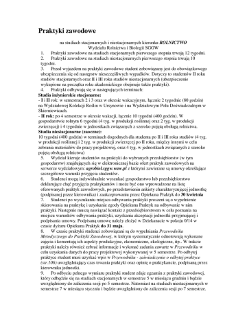 Praktyki zawodowe na studiach stacjonarnych i niestacjonarnych kierunku ROLNICTWO Wydziału Rolnictwa i Biologii SGGW 1. Praktyki zawodowe na studiach stacjonarnych pierwszego stopnia trwają 12 tygodni. 2. Praktyki zawodowe na studiach niestacjonarnych pierwszego stopnia trwają 10 tygodni. 3. Przed wyjazdem na praktyki zawodowe student zobowiązany jest do obowiązkowego ubezpieczenia się od następstw nieszczęśliwych wypadków. Dotyczy to studentów II roku studiów stacjonarnych oraz II i III roku studiów niestacjonarnych (ubezpieczenie wykupione na początku roku akademickiego obejmuje także praktyki). 4. Praktyki odbywają się w następujących terminach: Studia inżynierskie stacjonarne: - I i II rok: w semestrach 2 i 3 oraz w okresie wakacyjnym, łącznie 2 tygodnie (80 godzin) na Wydziałowej Kolekcji Roślin w Ursynowie i na Wydziałowym Polu Doświadczalnym w Skierniewicach. - II rok: po 4 semestrze w okresie wakacji, łącznie 10 tygodni (400 godzin). W gospodarstwie rolnym 6 tygodni (4 tyg. w produkcji roślinnej oraz 2 tyg. w produkcji zwierzęcej) i 4 tygodnie w jednostkach związanych z szeroko pojętą obsługą rolnictwa. Studia niestacjonarne (zaoczne): 10 tygodni (400 godzin) w terminach dogodnych dla studenta po II i III roku studiów (4 tyg. w produkcji roślinnej i 2 tyg. w produkcji zwierzęcej po II roku, między innymi w celu zebrania materiałów do pracy projektowej, oraz 4 tyg. w jednostkach związanych z szeroko pojętą obsługą rolnictwa) 5. Wydział kieruje studentów na praktyki do wybranych przedsiębiorstw (w tym gospodarstw) znajdujących się w elektronicznej bazie ofert praktyk zawodowych na serwerze wydziałowym: agrobiol.sggw.waw.pl z którymi zawierane są umowy określające szczegółowe warunki przyjęcia studentów. 6. Studenci mogą indywidualnie wyszukać gospodarstwo lub przedsiębiorstwo deklarujące chęć przyjęcia praktykantów i może być ono wprowadzone na listę oferowanych praktyk zawodowych, po przedstawieniu ankiety charakteryzującej jednostkę (podpisanej przez kierownika) i zaakceptowaniu przez Opiekuna Praktyk do 30 kwietnia 7. Studenci po wyszukaniu miejsca odbywania praktyki proszeni są o wypełnienie skierowania na praktykę i uzyskanie zgody Opiekuna Praktyk na odbywanie w nim praktyki. Następnie muszą nawiązać kontakt z przedsiębiorstwem w celu poznania na miejscu warunków odbywania praktyki, uzyskania akceptacji jednostki przyjmującej i podpisania umowy. Podpisaną umowę należy złożyć w Dziekanacie w pokoju 0/14 w czasie dyżuru Opiekuna Praktyk do 31 maja. 8. W czasie praktyki studenci zobowiązani są do wypełniania Przewodnika Metodycznego do Praktyki Zawodowej, w którym systematycznie odnotowują wykonane zajęcia i komentują ich aspekty produkcyjne, ekonomiczne, ekologiczne, itp.. W trakcie praktyki należy również zebrać informacje i wykonać zadania zawarte w Przewodniku w celu uzyskania danych do pracy projektowej wykonywanej w 5 semestrze. Po odbytej praktyce student musi uzyskać wpis w Przewodniku - zaświadczenie o odbytej praktyce (str.106) uwzględniający czas trwania praktyki oraz opinię o praktykancie, podpisaną przez kierownika jednostki. 9. Po odbyciu pełnego wymiaru praktyki student zdaje egzamin z praktyki zawodowej, który odbędzie się na studiach stacjonarnych w semestrze 5 w miesiącu grudniu i będzie uwzględniony do zaliczenia sesji po 5 semestrze. Natomiast na studiach niestacjonarnych w semestrze 7 w miesiącu styczniu i będzie uwzględniony do zaliczenia sesji po 7 semestrze. 10. Egzamin składany jest przed komisją złożoną z przewodniczącego – Opiekuna Praktyk oraz dwóch członków komisji – pracowników dydaktycznych Wydziału Rolnictwa i Biologii. Zakres egzaminu obejmuje prezentację wizualną (np. multimedialną), w której należy uwzględnić także wnioski z pracy projektowej oraz treści merytoryczne (ocena z odpowiedzi na pytania Komisji) a także stronę formalną odbycia praktyki (ocenę za prowadzenie Przewodnika, wykonane zadania, sprawozdanie, oraz zaświadczenie o odbyciu praktyki z opinią). Ocena końcowa z egzaminu jest średnią arytmetyczną z ocen cząstkowych. Po zdanym egzaminie Przewodnik zwracany jest studentowi. 11. Praktyki zagraniczne mogą być zaliczone jako praktyka zawodowa tylko wtedy, jeżeli ich charakter pozwoli na poznanie procesów technologiczno-ekonomicznych w rolnictwie. Każda praktyka zagraniczna będzie oceniana pod tym kątem, po czym Opiekun Praktyk określi, w jakiej części może być zaliczona jako praktyka zawodowa. 12. Studenci, którzy są: a. Absolwentami techników rolniczych lub pokrewnych, b. Właścicielami gospodarstwa rolnego lub dzierżawią gospodarstwo, c. Pracują w gospodarstwie rodziców, mogą ubiegać się o zaliczenie części praktyki zawodowej na podstawie przedstawionych dokumentów. Wymagane dokumenty obejmują odpowiednio: ad. a. Podanie oraz zaświadczenie ze szkoły z wyszczególnieniem rodzaju odbywanej praktyki i czasu jej trwania potwierdzone przez Dyrektora szkoły. ad. b. Podanie oraz zaświadczenie z Urzędu Gminy o powierzchni posiadanego lub dzierżawionego gospodarstwa, a z oddziałów terenowych ARiMR-u zaświadczenie o produkcji zwierzęcej, bądź umowy kontraktacyjne na dostawę żywca czy mleka. ad. c. Podanie oraz zaświadczenie jak w punkcie b, ale dotyczące gospodarstwa rodziców i potwierdzenie zameldowania. Podania z załączonymi dokumentami należy złożyć do Opiekuna Praktyk, do 31 marca, który rozpatrzy je i określi w jakiej części praktyka będzie zaliczona. 13. Uzgodnione terminy praktyk, po podpisaniu umowy nie podlegają zmianie, z wyjątkiem przypadków losowych oraz nie powinny kolidować z terminami zajęć dydaktycznych i sesją egzaminacyjną. 14. Ubranie robocze odpowiednie do odbycia praktyki zawodowej zabezpiecza praktykant. 15. Wszystkie druki związane z odbyciem i zaliczeniem praktyk zawodowych dostępne są na serwerze wydzia