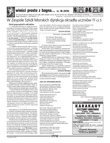 wieœci prosto z bagna... cz. 96 (XCVI) W naszym mieœcie dziej¹ siê nie tylko takie w³aœnie rzeczy z³e, bo ich nie ma, natomiast wiele dzieje siê dobrego (...) otrzymaliœmy t¹ flagê i mo¿emy (...) siê cieszyæ. (...) (fragmenty wypowiedzi Janusza ¯murkiewicza na sesji 30 czerwca 2005) W Zespole Szkó³ Morskich dyrekcja okrad³a uczniów !!! cz.5 (…). Zespó³ Szkó³ Morskich im. Eugeniusza Kwiatkowskiego w Œwinoujœciu móg³by byæ chlub¹ naszego miasta, gdyby t¹ placówk¹ zarz¹dza³y osoby kompetentne i uczciwe (…) W y n i k i k o n t r o l i s ¹ p r z e r a ¿ a j ¹ c e. (…) kursy morskie, pretekst do wy³udzania pieniêdzy, s¹ elementem (…) programu nauczania! (…) W roku 2002/2003 od uczniów wy³udzano po 520 z³otych, w 2003/2004 po 600 z³otych a w 2004/2005 po 640 z³otych, (…) Prezydent Janusz ¯murkiewicz kilka miesiêcy ukrywa³ ustalenia kontroli (…) Podczas sesji Rady Miasta 24 listopada, powiedzia³ miêdzy innymi: (…) Podj¹³em stosowne decyzje, ¿eby te przyczyny z³a i to z³o w tej szkole wyeliminowaæ (…) Kradzie¿e w kasie i w Szkole Morskiej to s¹ lata nie tylko te, kiedy ja tutaj w tym Urzêdzie pracujê (…) poleci³em poddaæ szko³ê kompleksowej kontroli (…) w lipcu otrzyma³em protokó³. (…) ewidentne naruszenia dyscypliny finansów publicznych, za to odpowiedzialnoœæ ponosz¹ by³a dyrektor szko³y oraz by³a g³ówna ksiêgowa. (…) Pozosta³a do za³atwienia najbardziej bulwersuj¹ca sprawa pobierania op³at od uczniów za kursy morskie. Ustalono, ze od 2002 roku kursy te zosta³y w³¹czone do programu nauczania jako obowi¹zkowe zajêcia i Szko³a powinna prowadziæ je nieodp³atnie(…) Za kursy p³acili uczniowie i to podwójnie. (…) Koszt rzeczywisty prowadzonych kursów 2002 – 2005 to kwota 49 310 z³otych i t¹ kwotê zamierzam przekazaæ do szko³y celem zwrócenia jej uczniom. Pozosta³¹ kwotê winna zwróciæ uczniom Szko³a odzyskuj¹c j¹ od swoich pracowników, którzy pobierali op³aty za te kursy, bezprawnie. Dyrekcja Szko³y bêdzie zobowi¹zana do tego, aby dochodziæ od tych, którzy pobrali pieni¹dze, aby je zwrócili (…) PóŸniej Janusz ¯murkiewicz odbieg³ od tematu, utajnienie protoko³u t³umaczy³ przewrotnie dobrem szko³y, nauczycieli, uczniów, dobrem procesu wychowawczego (…) Podczas sesji równie¿ zabra³em g³os w sprawie ZSM: (…) pan prezydent przemówi³ g³osem ustroju, który ju¿ nie istnieje, ¿e je¿eli s¹ nieprawid³owoœci w jakiejœ jednostce organizacyjnej czy urzêdzie, to nie nale¿y o tym pisaæ, bo to na dobre imiê tej jednostki wp³ywa. Oczywiœcie, ¿e ujawnienie takich nieprawid³owoœci nie jest dobr¹ reklam¹ dla szko³y, ale jawnoœæ w systemie demokratycznym jest jednym z najwa¿niejszych rozwi¹zañ ustrojowych, prowadz¹cym do oczyszczenia i poci¹gniêcia winnych do odpowiedzialnoœci. (…). Trzeba niezw³ocznie zwróciæ uczniom ca³¹ kwotê pobran¹ od nich (…) * * * * * Moje publikacje, choæ niew¹tpliwie bolesne dla Szko³y, to jednak przyspieszy³y bieg wydarzeñ prowadz¹cych do naprawienia wyrz¹dzonego z³a. Dla odzyskania zaufania uczniów i rodziców do Szko³y niezbêdne jest nie tylko zwrócenie z odsetkami ca³oœci wy³udzonych pieniêdzy, ale tak¿e ukaranie winnych nadu¿yæ. Ponadto od zaraz wszelkie dochody i wydatki Szko³y winny byæ jawne nie tylko dla wszystkich nauczycieli ale tak¿e dla zainteresowanych uczniów. Dziœ jawnoœæ jeszcze nie funkcjonuje. Przyk³ad: doroœli ju¿ uczniowie piêciu klas maturalnych przygotowuj¹ studniówkê w miêdzyzdrojskiej Slavii - koszt 198 z³otych od pary. W Szkole pobieraj¹ 350 z³otych od pary. Tradycj¹ jest zapraszanie nauczycieli, kwiaty, pami¹tkowe fotografie, transport - to te¿ kosztuje. Ale korzystaj¹cy z pe³ni 7 grudnia 2005 praw obywatelskich doroœli uczniowie maj¹ przecie¿ prawo do zapoznania siê ze szczegó³ow¹ kalkulacj¹. Mo¿e skutkiem jawnoœci by³oby obni¿enie kosztów choæby o 50 z³otych od pary? Stanis³aw Mo¿ejko Œwinoujœcie, 4 grudnia 2005 Pani Marzena Baranowska Dyrektor Zespo³u Szkó³ Morskich Im. Eugeniusza Kwiatkowskiego w Œwinoujœciu W imieniu Klubu Radnych kww.œwinoujœcie.pl Rady Miasta Œwinoujœcia w sk³adzie: Henryk F¹fara, Janusz Mikiewicz, Stanis³aw Mo¿ejko, proszê uprzejmie o wprowadzenie do porz¹dku obrad styczniowego posiedzenia Rady Pedagogicznej Zespo³u Szkó³ Morskich w Œwinoujœciu spotkania z naszym klubem. Zespó³ Szkó³ Morskich im. Eugeniusza Kwiatkowskiego jest jedyn¹ œwinoujsk¹ Szko³¹ z ofert¹ edukacyjn¹ skierowan¹ do m³odzie¿y ca³ego kraju. Jest trwa³ym, niezbêdnym sk³adnikiem morskiego, portowego wizerunku naszego miasta. Jestem przekonany, ¿e swobodna wymiana pogl¹dów w trakcie spotkania u³atwi nam konstruktywne i skuteczne dzia³ania na rzecz Szko³y. Stanis³aw Mo¿ejko PS. W Szkole króluje m³odoœæ, tote¿ parafraza Ody do m³odoœci Adama Mickiewicza pos³u¿y³a do wyra¿enia m³odzieñczych emocji. W szkole kr¹¿y kilka wersji, jedna dotar³a do redakcji:. ODA DO SPRAWIEDLIWOŒCI Bez serc, bez ducha, to z³odziejów ludy; Sprawiedliwoœci! Podci¹³eœ im skrzyd³a! Jak nad szkolnym wzlec¹ teraz œwiatem Bez przekrêtów, k³amstw, u³udy, Kêdy O¿ejko zdzia³a³ cudy, I o¿ywi³ dzia³ania- jak z³ote malowid³a. Niechaj, kogo kariera zamroczy, Chyli ku ziemi zaplute czo³o, I takie widzi œwiata ko³o, Jakie têpymi zakreœla oczy. Sprawiedliwoœci! Ty nad poziomy Wylatuj, a okiem s³oñca Sitwy ca³e ogromy Wytêp do samego koñca. Patrz na dó³ - kêdy gnój i mg³a zaciemia Obszar g³upoty zalany odmêtem; To Aranowska! Upad³a jak ziemia. Patrz, jak nad jej zap³akane oczy têpe Wzbi³ siê Qqæ - jak p³az w skorupie Sam sobie sterem, ¿eglarzem, okrêtem; Goni¹c za pieniêdzmi ucznia-drobniejszego p³azu, To siê wzbija, wszystkich w rogi wali; Nie lgnie do niego fala, ani on do fali; A wtem jak bañka prysn¹³ rozbity o szmat g³azu. Pogr¹¿ony