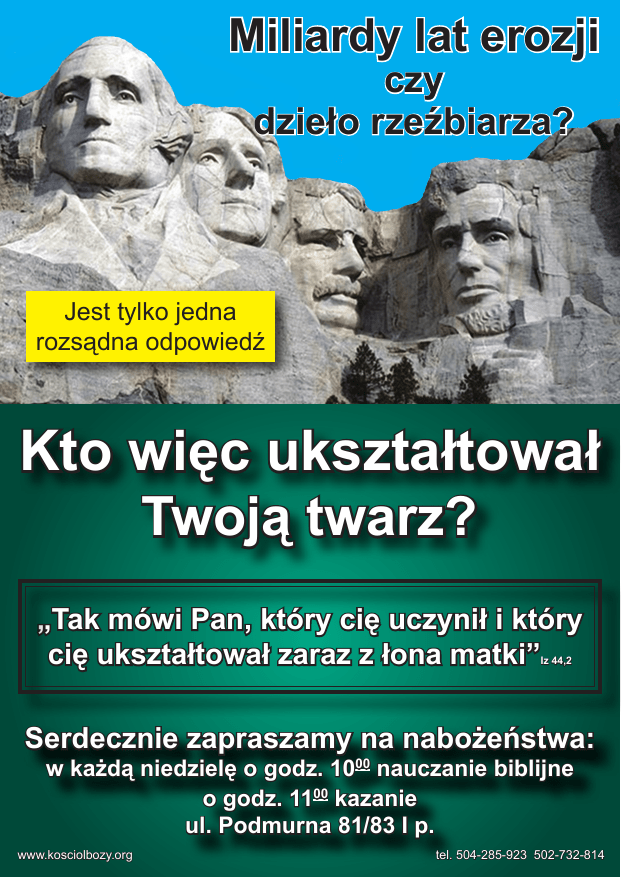 Miliardy lat erozji czy dzieło rzeźbiarza? Jest tylko jedna rozsądna odpowiedź Kto więc ukształtował Twoją twarz? „Tak mówi Pan, który cię uczynił i który cię ukształtował zaraz z łona matki” Iz 44,2 Serdecznie zapraszamy na nabożeństwa: w każdą niedzielę o godz. 1000 nauczanie biblijne o godz. 1100 kazanie ul. Podmurna 81/83 I p. www.kosciolbozy.org tel. 504-285-923 502-732-814 M oralny rozpad przeniknął do naszego społeczeństwa. Mimo to, że mieszkamy w bardzo „religijnym” kraju, rośnie korupcja, pijaństwo, bunt nastolatków, swoboda seksualna, ohydne zbrodnie, pedofilia, itd. To jest przerażające, ale nie powinno nas dziwić. Dlaczego? Oto 3 powody: 1. Brak bojaźni przed Bogiem „Nie ma bojaźni Bożej przed ich oczami” (Rz 3,18). Nie tylko ateiści nie boją się Boga. Tak zwani wierzący często postępują niemoralnie, co pokazuje, że oni też nie boją się konsekwencji za zło. 2. Błędne kształcenie dzieci Szkoły uczą nasze dzieci, że człowiek to zewoluowane zwierzę. A potem zastanawiamy się, czemu zachowują się jak zwierzęta! Nic dziwnego, że nie widzą one nic złego w seksie przedmałżeńskim, pornografii, pijaństwie, narkotykach, oszustwie, itd. I co się dzieje w domu? Kto uczy ich kraść i oszukiwać? To my jesteśmy nieuczciwi w naszych interesach. Kto uczy ich kłamać i przeklinać? To my. Czemu alkohol stanowi tak duży problem w tym kraju? Właśnie my żartujemy na ten temat i dodajemy temu splendoru. Dlaczego dziś pornografia czy cudzołóstwo są tak nagminnie spotykane? To wszystko tolerujemy w naszych żartach i oglądanych przez nas filmach. 3. Brak norm Przestaliśmy wierzyć, że Biblia stanowi jakikolwiek autorytet. Mówią nam, że to tylko książka napisana przez człowieka. Nic dziwnego, że normy Słowa Bożego nie są traktowane poważnie. się jakie będą konsekwencje dla Ciebie i Twojej rodziny. Pamiętaj, że zdasz Bogu sprawę ze wszystkiego. „Nie bójcie się tych, którzy zabijają ciało, lecz nie mogą zabić duszy. Bójcie się raczej tego, który może i duszę, i ciało zatracić w piekielnym ogniu” (Mt 10,28). 2. Właściwe wychowywanie Ucz swoje dzieci bojaźni Bożej i uczciwego postępowania. Ucz je uczciwości i cnotliwości. Ucz je, że pornografia, kłamstwo, przeklinanie czy pijaństwo zawsze są złem. Strzeż je przed złymi czynami i mów o ich konsekwencjach. „Ćwicz młodego według potrzeby drogi jego, bo gdy się zestarzeje, nie odstąpi od niej” (Prz 22,6). 3. Słowo Boże Zaakceptuj Biblię jako wskazówkę dobra i zła. Czytaj Słowo Boże z rodziną codziennie. Jeśli Boże Słowo nazywa coś grzechem, Ty rób to samo. „Całe Pismo jest natchnione przez Boga i pożyteczne do nauki, do strofowania, do poprawiania, do wychowania w sprawiedliwości” (2Tm 3,16). Drogi Czytelnik, te rozwiązania nie są zbyt popularne, ale one są rozwiązaniami Boga. Społeczeństwo jest w tarapatach, bo opuściliśmy Boga i chodziliśmy swoją drogą. To najwyższy czas ukorzyć się i powrócić do Boga i Jego Słowa. „Szukajcie Pana póki może być znaleziony; wzywajcie go póki jest blisko. Niech bezbożny opuści swoją drogę, a człowiek nieprawy swoje myśli i niech się nawróci do Boga, a zmiłuje się, i do Boga naszego, gdyż jest hojny w odpuszczeniu” (Iz 55,6). Jezus powieCzy jest rozwiązanie? Oczywiście, że tak. dział: „Ja jestem drogą, prawdą i życiem. Nikt nie przychodzi do Ojca jak 1. Bojaźń przed Bogiem Zanim podejmiesz decyzję, zastanów tylko przeze mnie” (J 14,6).