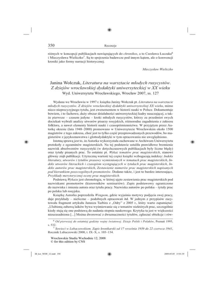 350 Recenzje różnych w koncepcji publikacjach nawiązujących do chronikos, a to Czesława Łuczaka6 i Mieczysława Wieliczko7. Są to spojrzenia badawcze pod innym kątem, ale o konwencji kroniki jako formy narracji historycznej. Mieczysław Wieliczko Janina Wołczuk, Literatura na warsztacie młodych rusycystów. Z dziejów wrocławskiej dydaktyki uniwersyteckiej w XX wieku Wyd. Uniwersytetu Wrocławskiego, Wrocław 2007, ss. 127 Wydana we Wrocławiu w 1997 r. książka Janiny Wołczuk pt. Literatura na warsztacie młodych rusycystów. Z dziejów wrocławskiej dydaktyki uniwersyteckiej XX wieku, mimo nieco nieprecyzyjnego tytułu, jest ewenementem w historii nauki w Polsce. Dokumentuje bowiem, i to fachowo, duży obszar działalności uniwersyteckiej kadry nauczającej, a także pierwsze – czasem jedyne – kroki młodych rusycystów, którzy za przedmiot swych dociekań wybrali analizy utworów pisarzy rosyjskich, różnorodne zagadnienia z zakresu folkloru, a nawet elementy historii nauki i czasopiśmiennictwa. W przyjętym przez Autorkę okresie (lata 1948–2000) promowano w Uniwersytecie Wrocławskim około 1500 magistrów z tego zakresu, choć jest to tylko część przeprowadzonych przewodów, bo magisteriów z językoznawstwa i glottodydaktyki w tym opracowaniu nie uwzględniono. Istotną sprawą jest to, że Autorka wykorzystała zachowane w Archiwum Uniwersytetu protokoły z egzaminów magisterskich. Na tej podstawie ustaliła prawidłowe brzmienie nazwisk absolwentów rusycystyki (w dotychczasowych publikacjach były liczne błędy) oraz tytuły pisanych prac. To ostatnie pt. Wykaz tematów prac magisterskich, stanowi główny zrąb publikacji. Użyteczną wartość tej części książki wzbogacają indeksy: Indeks literatury, utworów i tytułów prasowy wymienionych w tematach prac magisterskich, Indeks utworów literackich i czasopism występujących w tytułach prac magisterskich, Indeks autorów prac magisterskich, Zestawienie numerów prac magisterskich napisanych pod kierunkiem poszczególnych promotorów. Dodano także, i jest to bardzo interesujące, Przykłady merytorycznej oceny prac magisterskich. Podstawą Wykazu jest chronologia, w której ujęto zestawienia prac magisterskich pod nazwiskami promotorów (kierowników seminariów). Zapis podstawowy ograniczono do nazwiska i imienia autora oraz tytułu pracy. Nazwiska autorów po polsku – tytuły prac po polsku lub rosyjsku. Książkę Autorka poprzedziła Wstępem, gdzie wyjaśnia motywy podjęcia swej pracy, daje przykłady – nieliczne – podobnych opracowań itd. W jednym z przypisów zacytowała fragment artykułu Janusza Tazbira z „Odry” z 2005 r., który warto zapamiętać: „Ulubioną zabawą laików bywa wyśmiewanie się z tematów niektórych prac, szczególnie kiedy stają się one podstawą do nadania stopnia naukowego. Krytyka ta jest w większości nieuzasadniona [...] Można dworować z dwuznaczności tytułów, zgłaszać obiekcje i rów6 Od pierwszej do ostatniej godziny wojny światowej. Dzieje Polski i Polaków, Poznań 1995, s. 532. 7 Sowieci w Lubaczowskiem. Zapis kronikarski od 17 września 1939 do 22 czerwca 1941, Rocznik Lubaczowski 2000, t. IX–X, s. 103–134. Wroclawskie Studia Wschodnie 12, 2008 © for this edition by CNS III_kor_WSW_12.indd 350 2009-05-05 15:01:39 Recenzje 351 nocześnie stawiać zarzuty, że tyle istotnych problemów nie doczekało się opracowania”. No, właśnie. Wolałbym jednak, by zamiast tytułów typu Lew Tołstoj w Polsce, pisano: Twórczość Lwa Tołstoja w Polsce. Niestety, pierwsza wersja stanowiła na rusycystyce wrocławskiej raczej normę. Zestawienia indeksowe dają wgląd w kilka interesujących spraw. Owe około 1500 magisteriów prowadziło ledwie 17 nauczycieli akademickich, przeważnie profesorzy lub docenci, znacznie mniej doktorzy. W tej liczbie było dwóch obcokrajowców: doc. Kole Simiczijew (Macedończyk) i prof. P.S. Wychodcew (Rosjanin). Promotorami największej liczby obronionych prac byli: prof. Zbigniew Barański, prof. Marian Jakóbiec, prof. Krystyna Galon-Kurek, prof. Tadeusz Klimowicz, prof. Bronisław Kodzis, prof. Telesfor Poźniak, prof. Franciszek Sielicki, prof. Marian Ściepuro. Oferowali oni seminarzystom na ogół klasykę rosyjską (rzadziej rosyjsko-radziecką). Utwory Aleksandra Puszkina cieszyły się największym wzięciem. Analizowano, w postaci monografii, stosunkowo często dzieła następujących twórców: A.A. Achmatowej, A.A. Błoka, M.A. Bułhakowa, I.A. Bunina, A.P. Czechowa, F.M. Dostojewskiego, I.G. Erenburga, W.W. Gogola, A.M. Gorkiego, S.A. Jesienina, M.J. Lermontowa, W.W. Majakowskiego, A.N. Ostrowskiego, M.J. Sałtykowa-Szczedrina, A.S. Sołżenicyna, L.N. Tołstoja, J.W. Trifonowa, I.S. Turgieniewa, A.T. Twardowskiego, S.P. Zołygina. Mniej jest autorów piszących na emigracji. Utwory o tematyce syberyjskiej to głównie poezja dekabrystów, słynny Sachalin Czechowa. Opowiadania kołymskie W.T. Szałamowa były przedmiotem tylko jednego magisterium. O wyborze utworów do analizy z pewnością decydowały różne okoliczności: jubileusze, krąg aktualnych lektur kierowników seminariów, a z pewnością także okoliczności polityczne. Z tego względu w zestawie opracowywanych tematów odczuwa się wyraźne poluzowanie obroży cenzury już w końcu lat osiemdziesiątych ubiegłego stulecia. Jest oczywiste, że szeroko rozumiana folklorystyka nie mogła być pominięta w tego typu poczynaniach. Najwięcej serca miał do niej zrazu docent, a później profesor Franciszek Sielicki (1923–2001). Pierwsi jego magistranci bronili się w 1967 r., a ostatni w 1993 r. Zadziwia wszechstronność problemowa kierownika seminarium, odwołanie nie tylko do piśmiennictwa wschodniosłowiańskiego, lecz także publikacji Oskara Kolberga oraz Franciszka Kotuli. Oto niektóre z tytułów obronionych prac magisterskich wybranych przypadkowo: 1967 r.: I. Dolińska, Rzeczywistość historyczna i materia