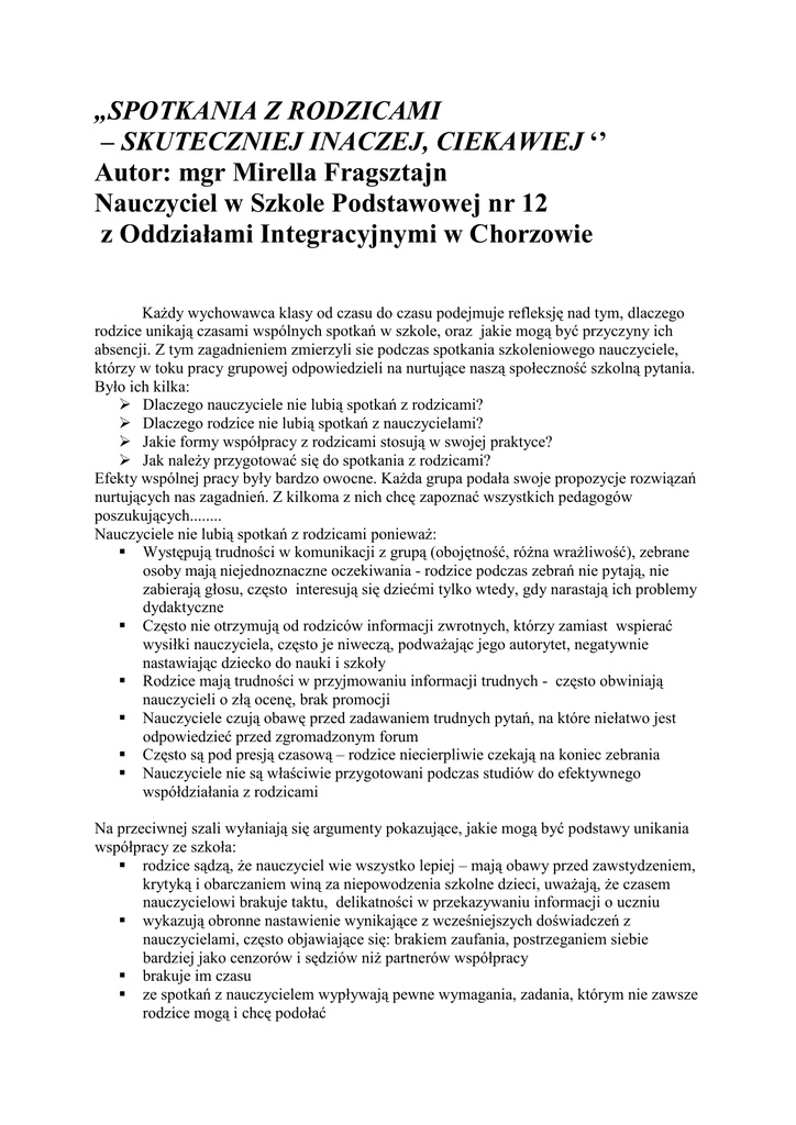 „SPOTKANIA Z RODZICAMI – SKUTECZNIEJ INACZEJ, CIEKAWIEJ ‘’ Autor: mgr Mirella Fragsztajn Nauczyciel w Szkole Podstawowej nr 12 z Oddziałami Integracyjnymi w Chorzowie Każdy wychowawca klasy od czasu do czasu podejmuje refleksję nad tym, dlaczego rodzice unikają czasami wspólnych spotkań w szkole, oraz jakie mogą być przyczyny ich absencji. Z tym zagadnieniem zmierzyli sie podczas spotkania szkoleniowego nauczyciele, którzy w toku pracy grupowej odpowiedzieli na nurtujące naszą społeczność szkolną pytania. Było ich kilka: Dlaczego nauczyciele nie lubią spotkań z rodzicami? Dlaczego rodzice nie lubią spotkań z nauczycielami? Jakie formy współpracy z rodzicami stosują w swojej praktyce? Jak należy przygotować się do spotkania z rodzicami? Efekty wspólnej pracy były bardzo owocne. Każda grupa podała swoje propozycje rozwiązań nurtujących nas zagadnień. Z kilkoma z nich chcę zapoznać wszystkich pedagogów poszukujących........ Nauczyciele nie lubią spotkań z rodzicami ponieważ: Występują trudności w komunikacji z grupą (obojętność, różna wrażliwość), zebrane osoby mają niejednoznaczne oczekiwania - rodzice podczas zebrań nie pytają, nie zabierają głosu, często interesują się dziećmi tylko wtedy, gdy narastają ich problemy dydaktyczne Często nie otrzymują od rodziców informacji zwrotnych, którzy zamiast wspierać wysiłki nauczyciela, często je niweczą, podważając jego autorytet, negatywnie nastawiając dziecko do nauki i szkoły Rodzice mają trudności w przyjmowaniu informacji trudnych - często obwiniają nauczycieli o złą ocenę, brak promocji Nauczyciele czują obawę przed zadawaniem trudnych pytań, na które niełatwo jest odpowiedzieć przed zgromadzonym forum Często są pod presją czasową – rodzice niecierpliwie czekają na koniec zebrania Nauczyciele nie są właściwie przygotowani podczas studiów do efektywnego współdziałania z rodzicami Na przeciwnej szali wyłaniają się argumenty pokazujące, jakie mogą być podstawy unikania współpracy ze szkoła: rodzice sądzą, że nauczyciel wie wszystko lepiej – mają obawy przed zawstydzeniem, krytyką i obarczaniem winą za niepowodzenia szkolne dzieci, uważają, że czasem nauczycielowi brakuje taktu, delikatności w przekazywaniu informacji o uczniu wykazują obronne nastawienie wynikające z wcześniejszych doświadczeń z nauczycielami, często objawiające się: brakiem zaufania, postrzeganiem siebie bardziej jako cenzorów i sędziów niż partnerów współpracy brakuje im czasu ze spotkań z nauczycielem wypływają pewne wymagania, zadania, którym nie zawsze rodzice mogą i chcę podołać zebrania są nudne lub zbyt długie, czasem nieprzygotowane, tak jak powinny być widzą niekorzystny , krytyczny wizerunek nauczycieli kreowany w mediach rodzice traktują nauczyciela jako swojego konkurenta ( zwłaszcza w klasach I - III) formy i zakres współdziałania z nauczycielem jest niewystarczający – często ogranicza się do spraw formalno – porządkowych, rodzice dzieci zdolnych, dobrze się zachowujących uważają, że ich obecność jest zbędna, gdyż nauczyciel odnosi się tylko do rodziców uczniów z „problemami” architektura większości szkół nie przewiduje miejsca dla rodziców przeznaczonego na spokojne rozmowy, z dala od obecności uczniów lub innych osób Wobec wszystkich tych problemów nie należy „załamywać rąk” wręcz przeciwnie. Należy właściwie spojrzeć na pozycję nauczyciela. Nikt nie zastąpi go w nawiązywaniu kontaktu i we współdziałaniu z rodzinami uczniów, gdyż nauczyciele są gospodarzami w szkole, im rodzice powierzają swoje dzieci i od nich oczekują inicjatywy. Do nas należy więc nawiązanie współpracy z rodzicami, wybór odpowiednich form i dbałość o jakość wzajemnych relacji zgodnie z przesłaniem: „To co możesz uczynić jest tylko maleńką kroplą w ogromie oceanu, ale jest właśnie tym, co nadaje znaczenie twojemu życiu” A. Schweiter Jak nawiązać współpracę z rodzicami, jak umiejętnie ją podtrzymywać? Podczas naszego spotkania padło kilka propozycji na ten temat: - organizacja zebrań ogólnych i rozmów indywidualnych - wspólne imprezy, uroczystości klasowe - udział w uroczystościach szkolnych np. dniach otwartych - organizowanie wycieczek, wspólnych wyjazdów - spotkania integrujące - udział rodziców w życiu szkoły np. w Radzie Szkoły, stowarzyszeniach rodziców - wspieranie różnych inicjatyw rodziców, mających konkretny cel Oprócz tych form, co jeszcze możemy zrobić razem? Oto kilka innych pomysłów: • konferencje, warsztaty dla rodziców dla rodziców na różne tematy • gablotę informacyjną dla rodziców • biblioteka dla rodziców • wypożyczalnia kaset video dla rodziców • wykorzystanie rodziców w roli ekspertów np. mama weterynarz opowie o opiece nad zwierzętami • organizowanie klasowych spotkań z rodzicami o różnej tematyce • strona internetowa szkoły, na której znajdują się informacje dla rodziców • gazetka dla rodziców Innym bardzo ciekawym pomysłem są opisane w publikacjach N. Grochowskiej spotkania trójstronne: wychowawca, uczeń, rodzic. Tego typu spotkanie prowadzi uczeń, który w trakcie jego trwania relacjonuje swoje postępy lub ich brak w nauce i zachowaniu (swoje mocne i słabe strony) Ponadto przedstawia własne pomysły i sposoby poradzenia sobie z niepowodzeniami, w czym pomagają mu obecni na spotkaniu rodzice i nauczyciel wychowawca. Oczywiście uczeń przygotowuje się do spotkania na podstawie konkretnych wskazówek, wręczanych mu na kilka dni przed spotkaniem przez wychowawcę, a rodzic dostaje imienne zaproszenie na tego typu formę współpracy z dokładnie zaznaczonym czasem spotkania. Ta forma wspólnego przebywania ze sobą, mimo iż jest czasochłonna przynosi wymierne korzyści wszystkim jego podmiotom: Korzyści dla ucznia • Szansa na rozwijanie poczucia o