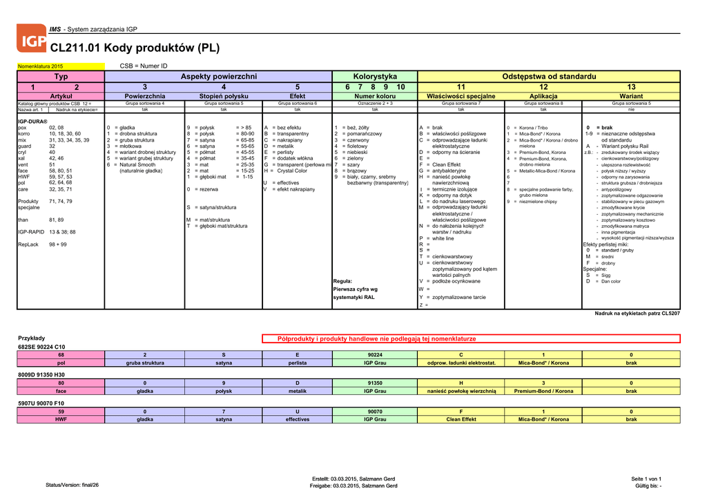 IMS - System zarządzania IGP CL211.01 Kody produktów (PL) CSB = Numer ID Nomenklatura 2015 Typ 1 3 2 Artykuł Katalog główny produktów CSB 12 = Nazwa art. 1 Nadruk na etykiecie= IGP-DURA® pox korro mix guard cryl xal vent face HWF pol care 02, 08 10, 18, 30, 60 31, 33, 34, 35, 39 32 40 42, 46 51 58, 80, 51 59, 57, 53 62, 64, 68 32, 35, 71 Produkty specjalne 71, 74, 79 than 81, 89 0 1 2 3 4 5 6 = = = = = = = Aspekty powierzchni 4 5 6 Kolorystyka 7 8 9 10 Odstępstwa od standardu 12 13 Powierzchnia Stopień połysku Efekt Numer koloru Właściwości specjalne Aplikacja Wariant Grupa sortowania 4 tak Grupa sortowania 5 tak Grupa sortowania 6 tak Oznaczenie 2 + 3 tak Grupa sortowania 7 tak Grupa sortowania 8 tak Grupa sortowania 5 nie gładka drobna struktura gruba struktura młotkowa wariant drobnej struktury wariant grubej struktury Natural Smooth (naturalnie gładka) 9 8 7 6 5 4 3 2 1 = = = = = = = = = połysk połysk satyna satyna półmat półmat mat mat głęboki mat = = = = = = = = = > 85 80-90 65-85 55-65 45-55 35-45 25-35 15-25 1-15 A B C D E F G H U V 0 = rezerwa = = = = = = = = bez efektu 1 transparentny 2 nakrapiany 3 4 metalik perlisty 5 dodatek włókna 6 transparent (perłowa mik 7 Crystal Color 8 9 = effectives = efekt nakrapiany = = = = = = = = = beż, żółty pomarańczowy czerwony fioletowy niebieski zielony szary brązowy biały, czarny, srebrny bezbarwny (transparentny) Reguła: A = brak B = właściwości poślizgowe C = odprowadzające ładunki elektrostatyczne D = odporny na ścieranie E = F = Clean Effekt G = antybakteryjne H = nanieść powłokę nawierzchniową I = termicznie izolujące K = odporny na dotyk L = do nadruku laserowego M = odprowadzający ładunki elektrostatyczne / właściwości poślizgowe N = do nałożenia kolejnych warstw / nadruku P = white line R = S = T = cienkowarstwowy U = cienkowarstwowy zoptymalizowany pod kątem wartości palnych V = podłoże ocynkowane Pierwsza cyfra wg W = systematyki RAL Y = zoptymalizowane tarcie S = satyna/struktura M = mat/struktura T = głęboki mat/struktura IGP-RAPID 13 & 38; 88 RepLack 11 98 + 99 0 1 2 3 4 5 6 7 8 9 = Korona / Tribo = Mica-Bond* / Korona = Mica-Bond* / Korona / drobno mielona = Premium-Bond, Korona = Premium-Bond, Korona, drobno mielona = Metallic-Mica-Bond / Korona = specjalne podawanie farby, grubo mielona = niezmielone chipsy 0 = brak 1-9 = nieznaczne odstępstwa od standardu A - Wariant połysku Rail z.B.: - zredukowany środek wiążący cienkowarstwowy/poślizgowy ulepszona rozlewistwość połysk niższy / wyższy odporny na zarysowania struktura grubsza / drobniejsza antypoślizgowy zoptymalizowane odgazowanie stabilizowany w piecu gazowym zmodyfikowane krycie zoptymalizowany mechanicznie zoptymalizowany kosztowo zmodyfikowana matryca inna pigmentacja wysokość pigmentacji niższa/wyższa Efekty perlistej miki: 0 = standard / gruby M = średni F = drobny Specjalne: S = Sigg D = Dan color Z = Nadruk na etykietach patrz CL5207 Półprodukty i produkty handlowe nie podlegają tej nomenklaturze Przykłady 682SE 90224 C10 68 2 S E 90224 C 1 0 pol gruba struktura satyna perlista IGP Grau odprow. ładunki elektrostat. Mica-Bond* / Korona brak 8009D 91350 H30 80 0 9 D 91350 H 3 0 face gładka połysk metalik IGP Grau nanieść powłokę wierzchnią Premium-Bond / Korona brak 5907U 90070 F10 59 0 7 U 90070 F 1 0 HWF gładka satyna effectives IGP Grau Clean Effekt Mica-Bond* / Korona brak Status/Version: final/26 Erstellt: 03.03.2015, Salzmann Gerd Freigabe: 03.03.2015, Salzmann Gerd Seite 1 von 1 Gültig bis: -