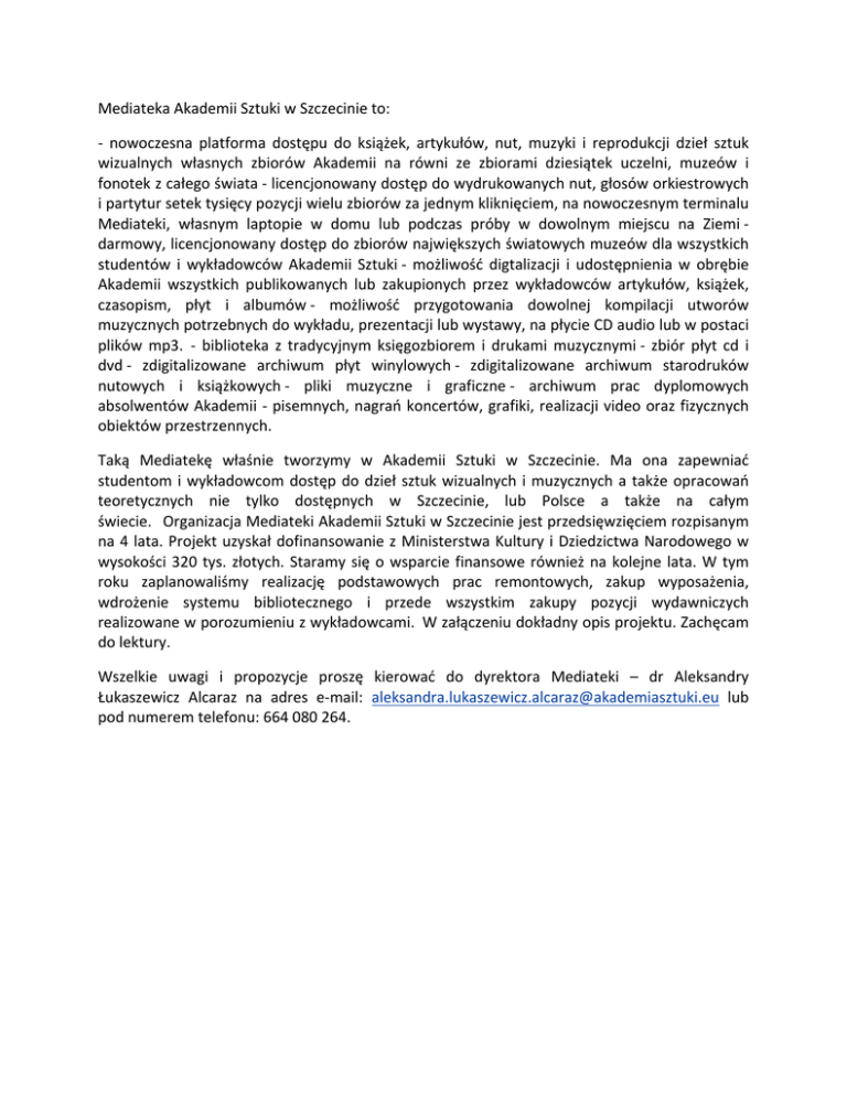 Mediateka Akademii Sztuki w Szczecinie to: -‐ nowoczesna platforma dostępu do książek, artykułów, nut, muzyki i reprodukcji dzieł sztuk wizualnych własnych zbiorów Akademii na równi ze zbiorami dziesiątek uczelni, muzeów i fonotek z całego świata -‐ licencjonowany dostęp do wydrukowanych nut, głosów orkiestrowych i partytur setek tysięcy pozycji wielu zbiorów za jednym kliknięciem, na nowoczesnym terminalu Mediateki, własnym laptopie w domu lub podczas próby w dowolnym miejscu na Ziemi -‐ darmowy, licencjonowany dostęp do zbiorów największych światowych muzeów dla wszystkich studentów i wykładowców Akademii Sztuki -‐ możliwość digtalizacji i udostępnienia w obrębie Akademii wszystkich publikowanych lub zakupionych przez wykładowców artykułów, książek, czasopism, płyt i albumów -‐ możliwość przygotowania dowolnej kompilacji utworów muzycznych potrzebnych do wykładu, prezentacji lub wystawy, na płycie CD audio lub w postaci plików mp3. -‐ biblioteka z tradycyjnym księgozbiorem i drukami muzycznymi -‐ zbiór płyt cd i dvd -‐ zdigitalizowane archiwum płyt winylowych -‐ zdigitalizowane archiwum starodruków nutowych i książkowych -‐ pliki muzyczne i graficzne -‐ archiwum prac dyplomowych absolwentów Akademii -‐ pisemnych, nagrań koncertów, grafiki, realizacji video oraz fizycznych obiektów przestrzennych. Taką Mediatekę właśnie tworzymy w Akademii Sztuki w Szczecinie. Ma ona zapewniać studentom i wykładowcom dostęp do dzieł sztuk wizualnych i muzycznych a także opracowań teoretycznych nie tylko dostępnych w Szczecinie, lub Polsce a także na całym świecie. Organizacja Mediateki Akademii Sztuki w Szczecinie jest przedsięwzięciem rozpisanym na 4 lata. Projekt uzyskał dofinansowanie z Ministerstwa Kultury i Dziedzictwa Narodowego w wysokości 320 tys. złotych. Staramy się o wsparcie finansowe również na kolejne lata. W tym roku zaplanowaliśmy realizację podstawowych prac remontowych, zakup wyposażenia, wdrożenie systemu bibliotecznego i przede wszystkim zakupy pozycji wydawniczych realizowane w porozumieniu z wykładowcami. W załączeniu dokładny opis projektu. Zachęcam do lektury. Wszelkie uwagi i propozycje proszę kierować do dyrektora Mediateki – dr Aleksandry Łukaszewicz Alcaraz na adres e-‐mail: [email protected] lub pod numerem telefonu: 664 080 264.