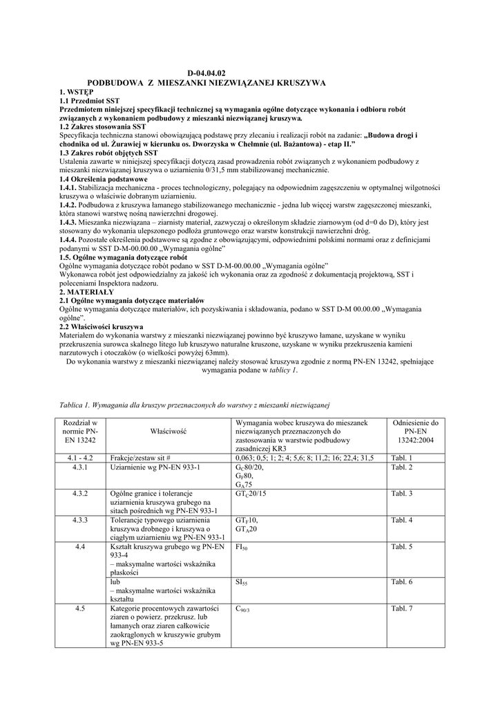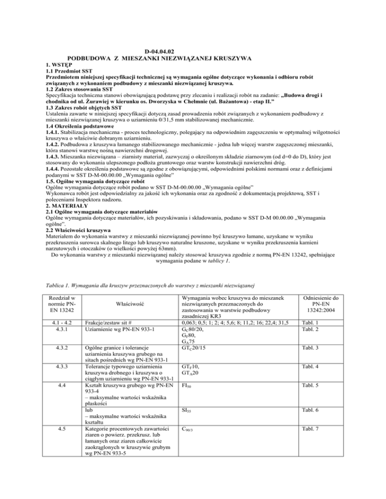 D-04.04.02 PODBUDOWA Z MIESZANKI NIEZWIĄZANEJ KRUSZYWA 1. WSTĘP 1.1 Przedmiot SST Przedmiotem niniejszej specyfikacji technicznej są wymagania ogólne dotyczące wykonania i odbioru robót związanych z wykonaniem podbudowy z mieszanki niezwiązanej kruszywa. 1.2 Zakres stosowania SST Specyfikacja techniczna stanowi obowiązującą podstawę przy zlecaniu i realizacji robót na zadanie: „Budowa drogi i chodnika od ul. śurawiej w kierunku os. Dworzyska w Chełmnie (ul. BaŜantowa) - etap II.” 1.3 Zakres robót objętych SST Ustalenia zawarte w niniejszej specyfikacji dotyczą zasad prowadzenia robót związanych z wykonaniem podbudowy z mieszanki niezwiązanej kruszywa o uziarnieniu 0/31,5 mm stabilizowanej mechanicznie. 1.4 Określenia podstawowe 1.4.1. Stabilizacja mechaniczna - proces technologiczny, polegający na odpowiednim zagęszczeniu w optymalnej wilgotności kruszywa o właściwie dobranym uziarnieniu. 1.4.2. Podbudowa z kruszywa łamanego stabilizowanego mechanicznie - jedna lub więcej warstw zagęszczonej mieszanki, która stanowi warstwę nośną nawierzchni drogowej. 1.4.3. Mieszanka niezwiązana – ziarnisty materiał, zazwyczaj o określonym składzie ziarnowym (od d=0 do D), który jest stosowany do wykonania ulepszonego podłoŜa gruntowego oraz warstw konstrukcji nawierzchni dróg. 1.4.4. Pozostałe określenia podstawowe są zgodne z obowiązującymi, odpowiednimi polskimi normami oraz z definicjami podanymi w SST D-M-00.00.00 „Wymagania ogólne” 1.5. Ogólne wymagania dotyczące robót Ogólne wymagania dotyczące robót podano w SST D-M-00.00.00 „Wymagania ogólne” Wykonawca robót jest odpowiedzialny za jakość ich wykonania oraz za zgodność z dokumentacją projektową, SST i poleceniami Inspektora nadzoru. 2. MATERIAŁY 2.1 Ogólne wymagania dotyczące materiałów Ogólne wymagania dotyczące materiałów, ich pozyskiwania i składowania, podano w SST D-M 00.00.00 „Wymagania ogólne”. 2.2 Właściwości kruszywa Materiałem do wykonania warstwy z mieszanki niezwiązanej powinno być kruszywo łamane, uzyskane w wyniku przekruszenia surowca skalnego litego lub kruszywo naturalne kruszone, uzyskane w wyniku przekruszenia kamieni narzutowych i otoczaków (o wielkości powyŜej 63mm). Do wykonania warstwy z mieszanki niezwiązanej naleŜy stosować kruszywa zgodnie z normą PN-EN 13242, spełniające wymagania podane w tablicy 1. Tablica 1. Wymagania dla kruszyw przeznaczonych do warstwy z mieszanki niezwiązanej Rozdział w normie PNEN 13242 4.1 - 4.2 4.3.1 4.3.2 4.3.3 4.4 4.5 Właściwość Frakcje/zestaw sit # Uziarnienie wg PN-EN 933-1 Ogólne granice i tolerancje uziarnienia kruszywa grubego na sitach pośrednich wg PN-EN 933-1 Tolerancje typowego uziarnienia kruszywa drobnego i kruszywa o ciągłym uziarnieniu wg PN-EN 933-1 Kształt kruszywa grubego wg PN-EN 933-4 – maksymalne wartości wskaźnika płaskości lub – maksymalne wartości wskaźnika kształtu Kategorie procentowych zawartości ziaren o powierz. przekrusz. lub łamanych oraz ziaren całkowicie zaokrąglonych w kruszywie grubym wg PN-EN 933-5 Wymagania wobec kruszywa do mieszanek niezwiązanych przeznaczonych do zastosowania w warstwie podbudowy zasadniczej KR3 0,063; 0,5; 1; 2; 4; 5,6; 8; 11,2; 16; 22,4; 31,5 GC80/20, GF80, GA75 GTC20/15 Odniesienie do PN-EN 13242:2004 Tabl. 1 Tabl. 2 Tabl. 3 GTF10, GTA20 Tabl. 4 FI50 Tabl. 5 SI55 Tabl. 6 C90/3 Tabl. 7 4.6 4.7 5.2 5.3 5.4 5.5 6.2 6.3 6.4.3 6.4.4 7.2 7.3.3 Zawartość pyłów wg PN-EN 933-1 – w kruszywie grubym*) – w kruszywie drobnym *) Jakość pyłów Odporność na rozdrabnianie kruszywa grubego wg PN-EN 1097-2, kategoria nie wyŜsza niŜ Odporność na ścieranie wg PN-EN 1097-1 Gęstość wg PN-EN 1097-6 rozdział 7,8 lub 9 Nasiąkliwość wg PN-EN 1097-6 rozdział 7,8 lub 9 (w zaleŜności od frakcji) Siarczany rozpuszczalne w kwasie wg PN-EN 1744-1 Całkowita zawartość siarki wg PNEN 1744-1 Składniki rozpuszczalne w wodzie wg PN-EN 1744-3 Zanieczyszczenia Zgorzel słoneczna bazaltu wg PN-EN 1367-3, wg PN-EN 1097-2 Mrozoodporność na kruszywie frakcji 8/16 wg PN-EN 1367-1 ƒDeklarowane Tabl. 8 ƒDeklarowane Tabl. 8 Wartość niezbadana na pojedynczych frakcjach, a tylko w mieszankach wg wymagań p.2.2-2.4 – WT-4 LA40 Tabl. 9 MDEDeklarowana Tabl. 11 Deklarowana Wcm NR WA24 2****) ASNR Tabl. 12 SNR Tabl. 13 Brak substancji szkodliwych dla środowiska wg odrębnych przepisów Brak ciał obcych takich jak; drewno, szkło i plastik mogących pogorszyć wyrób końcowy SBLA – skały magmowe i przeobraŜone: F4 Tabl. 18 – skały osadowe: F10 – kruszywa z recyklingu: F10 (F25**) ZałącznikC Skład materiałowy Deklarowany ZałącznikC Istotne cechy środowiskowe Większość substancji niebezpiecznych pkt. C.3.4 określonych w dyrektywie Rady 76/769/EWG zazwyczaj nie występuje w źródłach kruszywa pochodzenia mineralnego. Jednak w odniesieniu do kruszyw sztucznych i odpadowych naleŜy badać czy zawartość substancji niebezpiecznych nie przekracza wartości dopuszczalnych wg odrębnych przepisów *) łączna zawartość pyłów w mieszance powinna się mieścić w polu wyznaczonym przez krzywe graniczne **) łączna pod warunkiem, gdy zawartość w mieszance nie przekracza 50% m/m ****) w przypadku, gdy wymaganie nie jest spełnione naleŜy sprawdzić mrozoodporność 2.3 Uziarnienie kruszywa Krzywa uziarnienia kruszywa powinna być ciągła i nie moŜe przebiegać od dolnej krzywej granicznej uziarnienia do górnej krzywej granicznej uziarnienia na sąsiednich sitach. Wymiar największego ziarna kruszywa nie moŜe przekraczać 2/3 grubości warstwy układanej jednorazowo. Krzywa uziarnienia kruszywa, określona według WT-4 powinna leŜeć między krzywymi granicznymi pól dobrego uziarnienia podanymi na rysunku 2. Jako wymagane obowiązują tylko wymienione wartości liczbowe na tych rysunkach. Dodatkowo wymaga się, aby 90% uziarnień mieszanek zbadanych w ramach ZKP w okresie 6 miesięcy spełnia