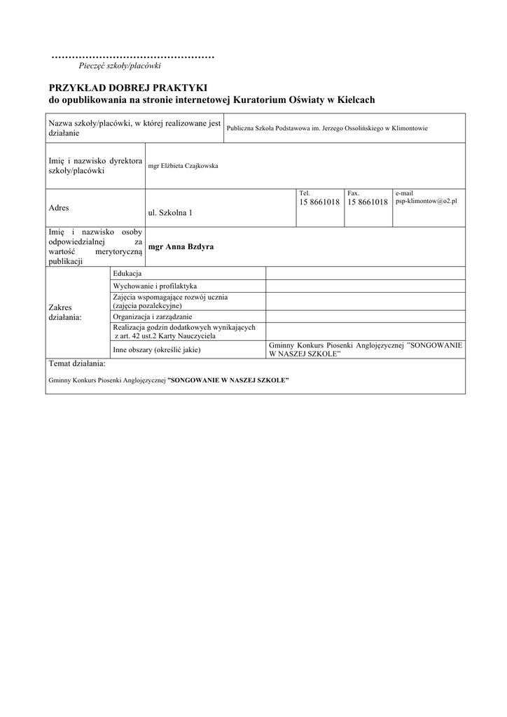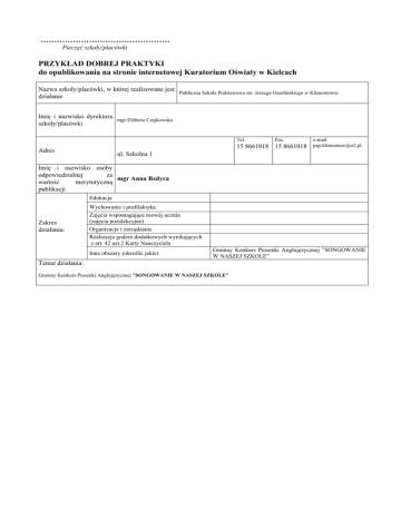 ………………………………………… Pieczęć szkoły/placówki PRZYKŁAD DOBREJ PRAKTYKI do opublikowania na stronie internetowej Kuratorium Oświaty w Kielcach Nazwa szkoły/placówki, w której realizowane jest Publiczna Szkoła Podstawowa im. Jerzego Ossolińskiego w Klimontowie działanie Imię i nazwisko dyrektora mgr Elżbieta Czajkowska szkoły/placówki Tel. Fax. e-mail 15 8661018 15 8661018 [email protected] Adres ul. Szkolna 1 Imię i nazwisko osoby odpowiedzialnej za mgr Anna Bzdyra wartość merytoryczną publikacji Edukacja Zakres działania: Wychowanie i profilaktyka Zajęcia wspomagające rozwój ucznia (zajęcia pozalekcyjne) Organizacja i zarządzanie Realizacja godzin dodatkowych wynikających z art. 42 ust.2 Karty Nauczyciela Inne obszary (określić jakie) Gminny Konkurs Piosenki Anglojęzycznej ”SONGOWANIE W NASZEJ SZKOLE” Temat działania: Gminny Konkurs Piosenki Anglojęzycznej ”SONGOWANIE W NASZEJ SZKOLE” Cele działania: Muzykę możemy spotkać wszędzie. Stykamy się z nią w wielu różnych sytuacjach. W rzeczywistym życiu jesteśmy otaczani przez muzykę. Nieustannie w telewizji można zobaczyć programy o tematyce muzycznej. Radio można usłyszeć wszędzie. Na ulicy, w samochodach, gdy wchodzimy do sklepów. Wszędzie stykamy się z różnymi rodzajami muzyki. Człowiek jest w stanie przystanąć i zasłuchać się w przypadku, gdy usłyszy ulubiony kawałek. Muzyka ludziom pomaga. Sprawia, że nawet najprostsze i najbardziej monotonne zajęcia mogą stać się przyjemne. Może nie tyle przyjemne, co będą okazją do posłuchania ulubionej muzyki. Muzyka uszczęśliwia, pozwala się zrelaksować, daje energię do życia. Wszystko zależy od jej rodzaju i zależnie od nastroju, człowiek może dobrać muzykę odpowiednią dla niego. Dla niektórych muzyka może stać się sposobem na życie. Ludzie zostają muzykami, piosenkarzami… Cele konkursu: • uwrażliwianie na piękno twórczości artystycznej • kształcenie sprawności płynnego posługiwania się językiem angielskim • popularyzacja śpiewania wśród dzieci i młodzieży • samokształcenie muzyczne, możliwość niezależnej prezentacji ulubionych przebojów oraz sprawdzenia siebie • poszukiwanie dzieci szczególnie uzdolnionych • ujawnienie i promowanie młodych talentów. Zasady uczestnictwa: • konkurs przeznaczony jest dla uczniów klas I-III i IV-VI • udział brać mogą soliści i małe zespoły wokalne i wokalno – instrumentalne (do trzech osób) • uczestnicy przygotowują jedną piosenkę w języku angielskim, gatunek dowolny ( piosenki dla dzieci, kabaretowe, poetyckie, rockowe, pop, melodie tradycyjne itp.) • przygotowane utwory prezentowane są przy dowolnym akompaniamencie lub a cappella • strój wykonawcy/wykonawców powinien być zgodny z charakterem wykonywanej piosenki Opis działania: W Gminnym Ośrodku Kultury w Klimontowie odbyła się już piąta edycja gminnego konkursu piosenki anglojęzycznej SONGOWANIE W NASZEJ SZKOLE. W konkursie brali udział uczniowie klas I-VI szkół podstawowych z Gminy Klimontów. Pomysłodawcą tegoż konkursu byli nauczyciele języka angielskiego w tutejszej szkole mgr Anna Bzdyra oraz mgr Kinga Cieplińska. W konkursie wzięło udział aż 17 zespołów. Uczniowie dużo wcześniej przygotowywali się do występów pod okiem opiekunów. Jury bacznie przyglądało się występom przyznając noty. Występy uczniów były na bardzo wysokim poziomie, co można było zaobserwować po reakcji zaciekawionej publiczności. Po długich i burzliwych obradach wyłoniono zwycięzców. Zdobywcy zaszczytnych miejsc otrzymali puchary, maskotki-nutki oraz nagrody. Następnie wszyscy uczestnicy zaśpiewali piosenkę „We are the champions”, aby pokazać, że przecież wszyscy wykonawcy są zwycięzcami, ponieważ odważyli się zaśpiewać piosenki w obcym języku. Zrobili więc pierwszy krok, aby pogłębić swoją wiedzę w tej dziedzinie. Opis uzyskanych efektów: Konkurs ma za zadanie promować młode talenty. Wielu uczniów właśnie w tym konkursie stawiało swe pierwsze kroki. Cieszy się on ogromną popularnością. Uczniowie niecierpliwie czekają na kolejną edycję konkursu a ich uśmiechnięte twarze są ogromną motywacją do wpisania konkursu w kalendarz imprez naszej szkoły. Uczniowie oprócz nagród rzeczowych będą mogli pokazać swój talent na Pikniku Rodzinnym organizowanym przez naszą placówkę. Wnioski z realizacji: Konkurs prowadzony jest corocznie, już piąty raz. Jest on dobrym motorem zarówno dla uczniów, ponieważ zachęca do nauki angielskiego a także szkół i instytucji, gdyż rozwija się współpraca, współzawodnictwo i zdrowa, bo motywująca rywalizacja. Instytucje wspomagające realizację podjętych działań: Nad konkursem honorowy patronat objęli: • Świętokrzyski Kurator Oświaty Małgorzata Muzoł • Wójt Gminy Klimontów Ryszard Adam Bień Patronat medialny sprawowała regionalna gazeta Głos Klimontowa. Konkurs odbył się dzięki nieocenionej pomocy sponsorów: • Gminnej Komisji do spraw Rozwiązywania Problemów Alkoholowych, • Dyrektor Szkoły Elżbiecie Czajkowskiej, • Wicedyrektor Szkoły Barbarze Czuja • firmie Pearson, • Panu Markowi Barglowi, właścicielowi sklepu „Siódemka” • Nadwiślańskiemu Bankowi Spółdzielczemu w Solcu Zdroju, • Radzie Rodziców przy PSP w Klimontowie Uzasadnienie zgłoszenia: Chcemy, aby dzieci poznawały język angielski poprzez zabawę. Głosimy hasło: „ŚPIEWAĆ KAŻDY MOŻE” Trudności w realizacji: Nie było Wykaz załączników: prezentacja multimedia „ SONGOWANIE W NASZEJ SZKOLE, krótka historia…” Wyrażam zgodę na opublikowanie na stronie internetowej Kuratorium Oświaty w Kielcach przedstawionego przykładu dobrej praktyki. Klimontów, 07.05.2012r. Miejscowość, data mgr Elżbieta Czajkowska Podpis dyrektora szkoły/placówki UWAGI ! Przykłady dobrej praktyki można przesyłać pocz