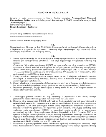 UMOWA nr NUK/ZP-03/16 Zawarta w dniu ........................r. w Nowej Rudzie pomiędzy Noworudzkimi Usługami Komunalnymi Spółką z o.o. z siedzibą przy ul. Żeromskiego 2, 57-400 Nowa Ruda, zwanym dalej „Zamawiającym”; reprezentowanym przez: Renatę Leśniarek - Prokurent a ....................................................................................................................................................... zwanym dalej Dostawcą reprezentowanym przez: ........................................................... została zawarta umowa następującej treści: § 1. Na podstawie art. 39 ustawy z dnia 29.01.2004r. Prawo zamówień publicznych, Zamawiający zleca a Wykonawca przyjmuje do wykonania: „Dostawę oleju napędowego” wg załączonej oferty stanowiącej załącznik nr 1 do niniejszej umowy. § 2. 1. Strony zgodnie ustalają, że obowiązującą ich formą wynagrodzenia za wykonanie przedmiotu umowy, jest wynagrodzenie (brutto) za 1 litr oleju napędowego w wysokości ustalonej wg zasady: Cena netto 1 litra oleju napędowego DIESEL wg ceny producenta oleju napędowego DIESEL wyrażona w złotych polskich (zaokrąglona do pełnych groszy) opublikowanej na oficjalnej stronie internetowej producenta oferowanego oleju napędowego DIESEL w dniu dostawy +/- ........ marża/upust Dostawcy za 1 litr oraz naliczenie 23% podatku vat = cena brutto 1 litra oleju napędowego DIESEL na dzień dostawy. 2. Zasady określenia wynagrodzenia o którym mowa w ust. 1 obejmują całokształt kosztów związanych z kompleksową realizacją dostawy wraz z kosztami transportu do siedziby Zamawiającego i wyładunkiem. 3. Zasady określenia wynagrodzenia o którym mowa w ust. 1 za wykonanie przedmiotu umowy jest niezmienne i nie przysługują z tego tytułu żadne inne wynagrodzenia czy świadczenia. 4. Dostawca gwarantuje, że jego marża/upust, o której mowa w ust. 1 nie ulegnie zmianie w okresie obowiązywania umowy. § 3. 1. Zamawiający posiada zbiornik na olej napędowy o pojemności 5.000 litrów, dlatego jednorazowa ilość dostarczanego oleju wynosić będzie ok 4.000 litrów. 2. Dostawy oleju napędowego DIESEL odbywać się będą specjalistycznymi autocysternami o odpowiedniej pojemności, zaopatrzonymi w pompę umożliwiającą tłoczenie oleju napędowego na wysokość 4,0m oraz posiadające ważne cechy legalizacyjne urządzenia wydawcze – Instalację pomiarową przewoźną do wydawania paliw ciekłych, wskazującą dokładną ilość wydanego oleju napędowego DIESEL w warunkach pomiarowych, tj. w temperaturze rzeczywistej zgodnie z Rozporządzeniem Ministra Gospodarki z dnia 27 grudnia 2007 r. w sprawie wymagań metrologicznych, którym powinny odpowiadać instalacje pomiarowe do ciągłego i dynamicznego pomiaru ilości cieczy innych niż woda, oraz szczegółowego zakresu badań i sprawdzeń wykonywanych podczas prawnej kontroli metrologicznej tych przyrządów pomiarowych (Dz.U. z 2008 r. nr 4 poz. 23 z późn. zm.). 3. Urządzenia te powinny posiadać ważne świadectwo legalizacji wydane przez stosowny Urząd Miar. Rozliczenie ilości paliwa w temperaturze referencyjnej +15 oC nastąpi zgodnie z Polską Normą PN-ISO 91-1. 4. Zamawiający zobowiązuje się do informowania Dostawcy o planowanym terminie dostawy z wyprzedzeniem 2 dni. § 4. Wykonawca zapłaci Zamawiającemu karę umowną za nieterminowe dostarczenie oleju napędowego DIESEL w wysokości 500 zł za każdy dzień opóźnienia. § 5. 1. Zamawiający zobowiązuje się do zapłaty za dostarczony olej w terminie 30 dni licząc od dnia pokwitowania odbioru towaru. 2. W przypadku niedotrzymania terminu płatności Wykonawca może wstrzymać się z realizacją dalszych dostaw cząstkowych. Takie zachowanie Wykonawcy nie będzie traktowane jako niewykonanie lub nienależyte wykonanie przedmiotu umowy. 3. Płatność zostanie dokonana w formie przelewu na rzecz Dostawcy na konto: ................................................................................................................................................. § 6. 1. Dostawca gwarantuje, że przedmiot umowy jest wolny od wad. 2. O wszystkich stwierdzonych wadach Zamawiający niezwłocznie zawiadomi Dostawcę na piśmie. § 7. 1. Umowa została zawarta na okres od …................... do ….............................. 2. Odstąpienie od umowy przez Dostawcę lub przez Zamawiającego z przyczyn zawinionych przez Dostawcę, spowoduje obowiązek zapłaty przez Dostawcę na rzecz Zamawiającego kary umownej w wysokości 10% kwoty nie wykonanego kontraktu. § 8. Wszelkie ewentualne spory powstałe na tle niniejszej umowy lub w związku z nią, jeśli nie zostaną załatwione polubownie, będą rozstrzygane przez Sąd Rejonowy w Kłodzku. § 9. W sprawach nieuregulowanych niniejszą umową stosuje się przepisy kodeksu cywilnego oraz przepisy ustawy Prawo zamówień publicznych. § 10. Umowę sporządza się w 3 egzemplarzach, jeden dla dostawcy i dwa dla Zamawiającego. Dostawca Zamawiający