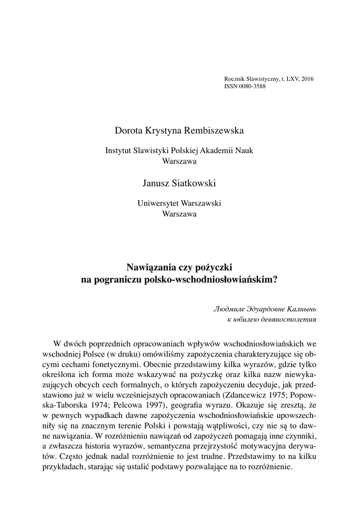 Rocznik Slawistyczny, t. LXV, 2016 ISSN 0080-3588 Dorota Krystyna Rembiszewska Instytut Slawistyki Polskiej Akademii Nauk Warszawa Janusz Siatkowski Uniwersytet Warszawski Warszawa Nawiązania czy pożyczki na pograniczu polsko-wschodniosłowiańskim? Людмиле Эдуардовне Калнынь к юбилею девяностолетия W dwóch poprzednich opracowaniach wpływów wschodniosłowiańskich we wschodniej Polsce (w druku) omówiliśmy zapożyczenia charakteryzujące się obcymi cechami fonetycznymi. Obecnie przedstawimy kilka wyrazów, gdzie tylko określona ich forma może wskazywać na pożyczkę oraz kilka nazw niewykazujących obcych cech formalnych, o których zapożyczeniu decyduje, jak przedstawiono już w wielu wcześniejszych opracowaniach (Zdancewicz 1975; Popowska-Taborska 1974; Pelcowa 1997), geografia wyrazu. Okazuje się zresztą, że w pewnych wypadkach dawne zapożyczenia wschodniosłowiańskie upowszechniły się na znacznym terenie Polski i powstają wątpliwości, czy nie są to dawne nawiązania. W rozróżnieniu nawiązań od zapożyczeń pomagają inne czynniki, a zwłaszcza historia wyrazów, semantyczna przejrzystość motywacyjna derywatów. Często jednak nadal rozróżnienie to jest trudne. Przedstawimy to na kilku przykładach, starając się ustalić podstawy pozwalające na to rozróżnienie. 68 DOROTA KRYSTYNA REMBISZEWSKA, JANUSZ SIATKOWSKI Bardo, berda, bierda, berdo, bierdo ‘część warsztatu tkackiego do przybijania wątku, płocha’, ‘nicielnice’ Psł. *bdo występuje powszechnie w Słowiańszczyźnie w znaczeniu ‘płocha, grzebień tkacki, przybijaczka’, ‘nicielnice’ oraz wtórnie w znaczeniu ‘skaliste wzniesienie, pagórek, góra’ (por. SP, t. 2: 428–429; ESSJ, t. 3: 164–166). Również na terenie Polski zachował się ten wyraz jako peryferyjny relikt leksykalny w innowacyjnym znaczeniu słń. ardo ‘deski tworzące wierzchnią, górną część kadłuba czółna’, barda ‘krawężna deska boczna w łodzi’ (SEK, t. 1: 178–179) w miejscowości Gardna Wielka pod Słupskiem z charakterystycznym zachowaniem miękkiej spółgłoski przed pierwotnym r zgłoskotwórczym miękkim oraz w fonetycznie polskiej postaci bardo, pl. barda w znaczeniu ‘płocha, przybijaczka’, ‘nicielnice’ (SGPA, t. 1: 389–391) w południowej Małopolsce, gdzie stanowi nawiązanie do wschodniej słowiańszczyzny i występującego w języku słowackim i czeskim brdo w znaczeniu ‘płocha’, ‘nicielnice’ i inne części warsztatu tkackiego związane konstrukcyjnie z tymi desygnatami. Najpewniej ogólnosłowiańska nazwa grzebienia tkackiego *bdo w całej Polsce została zastąpiona przez nazwę płocha (por. Moszyński 1929: 335). Poza tym SGPA (t. 1: 389–391) notuje w znaczeniu ‘płocha’, ‘nicielnice’ liczne zapisy postaci fonetycznych berda, bierda, berdo, bierdo ze wschodniego pogranicza oraz z terenów Polski północnej i północno-zachodniej w gwarach przesiedleńców ze Wschodu, głównie spod Wilna, a także z terenu Białorusi z okolic Grodna, Brześcia, Mińska i Witebska, również postać biordo spod Wilna, a z Ukrainy spod Tarnopola oraz bardo spod Lwowa i z południowo-wschodniej Małopolski spod Przemyśla i Sanoka. W gwarach przesiedleńczych jest to pożyczka wschodniosłowiańska, przeniesiona tu z polszczyzny kresowej por. ros. бéрдо od XVII w., później бёрдо, już dawne ukr. бéрдо, brus. бёрдо (ESSJ, t. 3: 165). W gwarach polskich na Litwie znane jest berdo (berda) ‘część warsztatu tkackiego’: „berda tak stuka, żyby robiła się ta płótna” (autorzy podają nawiązanie do brus. gwar. брда) (Rieger, Masojć, Rutkowska 2006: 142). Również SGPK (t. 1: 65) podaje z przekazu ustnego z Litwy berdo ‘płocha tkacka’. Zapisom ze wschodniego pogranicza Polski należy się przyjrzeć dokładniej. W północnej części są one bardzo rzadkie. Zanotowaną pod Sejnami formę erda ‘płocha’ należy najpewniej przypisać wpływowi białoruskiemu, choć Zdancewicz (1958: 213) pisze tu tylko o zmianie rodzaju, a o wpływie nie wspomina. Falińska (1980, t. 3, m. 97) notuje trzy zapisy jako polskie gwarowe z terenów objętych przez AGWB (t. 9, m. 429): bierdo z Wierzchlesia pod Sokółką, berda z Woronia koło Bielska Podlaskiego i berdo z Nowego Berezowa koło Hajnówki. Zostały one tu przejęte do języka polskiego wtórnie z miejscowych dialektów NAWIĄZANIA CZY POŻYCZKI NA POGRANICZU… 69 wschodniosłowiańskich. W AGWB l.c. notowano tu powszechnie, na północy tylko we wschodniej części, a szerzej od rzeki Supraśli, a zwłaszcza Narwi następujące postaci: erdo, berdo, berdo, sporadycznie koło Sokółki w paśmie przygranicznym erda. O nawiązaniach w gwarach białoruskich por. Rembiszewska w AGWB (t. 9, m. 429, s. 76). W LAB (t. 4) na mapie 204 umieszczono tylko formy бéрда, бёрда, a pominięto podawane w wykazie materiału także бéрдo, бёрдo (s. 77). Zanotowane przez Falińską ekwiwalenty polskie ściśle odpowiadają swoją postacią występującym na danym terenie w AGWB formom wschodniosłowiańskim. Należy też podkreślić, że zanotowane u Falińskiej berda na Mazurach pod Ełkiem i berdo na Warmii pod Olsztynem pochodzą od informatorów przesiedlonych, co SGPA (t. 1: 390) ściśle zaznacza. Poza tym w sąsiadujących dialektach polskich z Podlasia na północ od Bugu brak kontynuantów psł. *bdo (por. RóżnSłow, s. 187), a nawet w zachodniej części AGWB, zwłaszcza na północy, gdzie dominuje polska płoχa. Taki stan potwierdzają również materiały do AGP. Co prawda w multimedialnym przewodniku „Gwary polskie” [www.gwarypolskie.uw.edu.pl/index.php?option=com_content&task=view&id=548&Itemid=25] berdo ‘część warsztatu tkackiego w kształcie deseczki, służąca do przybijania wątku’ uznano za jeden z charakterystycznych dla gwar podlaskich wyrazów, które utrwalają dawną kulturę mater