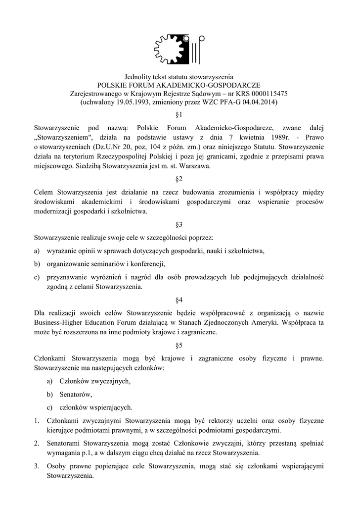 Jednolity tekst statutu stowarzyszenia POLSKIE FORUM AKADEMICKO-GOSPODARCZE Zarejestrowanego w Krajowym Rejestrze Sądowym – nr KRS 0000115475 (uchwalony 19.05.1993, zmieniony przez WZC PFA-G 04.04.2014) §1 Stowarzyszenie pod nazwą: Polskie Forum Akademicko-Gospodarcze, zwane dalej „Stowarzyszeniem", działa na podstawie ustawy z dnia 7 kwietnia 1989r. - Prawo o stowarzyszeniach (Dz.U.Nr 20, poz, 104 z późn. zm.) oraz niniejszego Statutu. Stowarzyszenie działa na terytorium Rzeczypospolitej Polskiej i poza jej granicami, zgodnie z przepisami prawa miejscowego. Siedzibą Stowarzyszenia jest m. st. Warszawa. §2 Celem Stowarzyszenia jest działanie na rzecz budowania zrozumienia i współpracy między środowiskami akademickimi i środowiskami gospodarczymi oraz wspieranie procesów modernizacji gospodarki i szkolnictwa. §3 Stowarzyszenie realizuje swoje cele w szczególności poprzez: a) wyrażanie opinii w sprawach dotyczących gospodarki, nauki i szkolnictwa, b) organizowanie seminariów i konferencji, c) przyznawanie wyróżnień i nagród dla osób prowadzących lub podejmujących działalność zgodną z celami Stowarzyszenia. §4 Dla realizacji swoich celów Stowarzyszenie będzie współpracować z organizacją o nazwie Business-Higher Education Forum działającą w Stanach Zjednoczonych Ameryki. Współpraca ta może być rozszerzona na inne podmioty krajowe i zagraniczne. §5 Członkami Stowarzyszenia mogą być krajowe i zagraniczne osoby fizyczne i prawne. Stowarzyszenie ma następujących członków: a) Członków zwyczajnych, b) Senatorów, c) członków wspierających. 1. Członkami zwyczajnymi Stowarzyszenia mogą być rektorzy uczelni oraz osoby fizyczne kierujące podmiotami prawnymi, a w szczególności podmiotami gospodarczymi. 2. Senatorami Stowarzyszenia mogą zostać Członkowie zwyczajni, którzy przestaną spełniać wymagania p.1, a w dalszym ciągu chcą działać na rzecz Stowarzyszenia. 3. Osoby prawne popierające cele Stowarzyszenia, mogą stać się członkami wspierającymi Stowarzyszenia. §6 1. O przyjęciu w poczet Członków zwyczajnych Stowarzyszenia decyduje Zarząd na wniosek zainteresowanego, poparty rekomendacjami dwóch Członków zwyczajnych lub Senatorów. Założyciele stają się Członkami zwyczajnymi Stowarzyszenia z chwilą jego rejestracji. O ponownym przyjęciu w poczet Członków zwyczajnych Senatora, po spełnieniu wymagań § 5 p.1 Statutu decyduje Zarząd na wniosek zainteresowanego. 2. O przyjęciu w poczet Senatorów decyduje Zarząd na wniosek zainteresowanego Członka zwyczajnego. 3. O przyjęciu w poczet członków wspierających decyduje Zarząd na wniosek zainteresowanego podmiotu. 4. Członkostwo w Stowarzyszeniu wygasa: a) wskutek rezygnacji członka złożonej na piśmie do Zarządu, b) na podstawie uchwały Zarządu podjętej w razie naruszenia przez członka niniejszego Statutu. Podjęcie uchwały o wygaśnięciu członkostwa poprzedzone jest przedstawieniem przez Zarząd członkowi pisemnych zarzutów dotyczących naruszenia przez niego niniejszego Statutu oraz udzieleniem członkowi miesięcznego terminu na ustosunkowanie się do przedstawionych zarzutów, c) na podstawie uchwały Zarządu stwierdzającej niespełnianie przez Członka zwyczajnego wymagań § 5 p.1 Statutu, d) wskutek utraty osobowości prawnej przez członka wspierającego lub śmierci Członka zwyczajnego albo Senatora. §7 Członkowie mają prawo do udziału we wszelkiej, zgodnej z celami statutowymi oraz przepisami prawa, działalności Stowarzyszenia, a także prawo do uzyskiwania od Zarządu wglądu we wszystkie dokumenty Stowarzyszenia. Członkowie zwyczajni oraz Senatorowie mają prawo wybierać oraz być wybieranymi do władz Stowarzyszenia, przy czym Senatorowie nie mogą być wybierani do Zarządu Stowarzyszenia. Zmiana statusu z Członka zwyczajnego na Senatora w czasie trwania kadencji Zarządu nie powoduje utraty kwalifikacji do pracy w Zarządzie Stowarzyszenia. Członkowie mają obowiązek współdziałać w zakresie osiągania celów statutowych Stowarzyszenia oraz stosować się do postanowień Statutu. Członkowie mają obowiązek uiszczania składek zgodnie z zasadami określonymi przez Zarząd. §8 Władzami Stowarzyszenia są: a) Walne Zebranie Członków, b) Zarząd, c) Komisja Rewizyjna. Władze Stowarzyszenia podejmują uchwały w głosowaniu jawnym zwykłą większością głosów oddanych przez obecnych członków. Do ważności uchwał Zarządu i Komisji Rewizyjnej wymagana jest obecność co najmniej połowy składu danego organu. W przypadku uchwał, o których mowa w § 6 p. 4b, wymagana jest większość 2/3 głosów. Do ważności uchwał Walnego Zebrania Członków wymagana jest obecności co najmniej połowy członków uprawnionych do głosowania w pierwszym terminie, a w drugim terminie uchwały są ważne bez względu na liczbę obecnych członków, o ile dalsze postanowienia Statutu nie stanowią inaczej. §9 Do kompetencji Walnego Zebrania Członków należy: a) powoływanie i odwoływanie Zarządu, w tym Prezesa, b) powoływanie i odwoływanie Komisji Rewizyjnej, w tym jej Przewodniczącego, c) zatwierdzanie budżetu Stowarzyszenia, d) zatwierdzanie programów i planów działalności Stowarzyszenia, e) przyjmowanie rocznych sprawozdań Zarządu z działalności Stowarzyszenia, f) określanie kierunków działalności Stowarzyszenia, g) uchwalanie zmian statutu Stowarzyszenia, h) podjęcie uchwały o rozwiązaniu Stowarzyszenia. Do ważności uchwał Walnego Zebrania Członków dotyczących zmian Statutu (g) oraz rozwiązania Stowarzyszenia (h) niezbędna jest bezwzględna większość głosów, w obecności przynajmniej połowy członków uprawnionych do głosowania. §10 1. Posiedzenia Walnego Zebrania Członków zwołuje Zarząd nie rzadziej niż raz na rok z własnej inicjatywy lub na pisemny wniosek Komisji Rewizyjnej albo co najmniej 1/5 członków. 2. Posiedzenie Walnego Zebrania powinno się odby