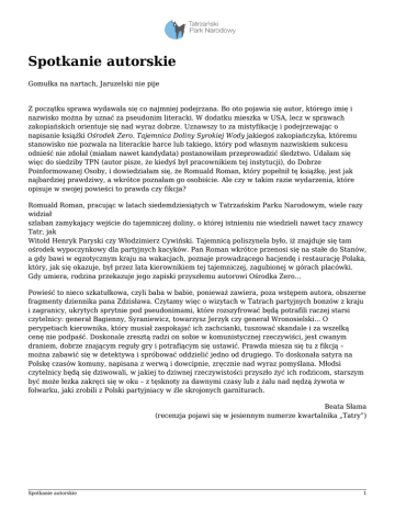 Spotkanie autorskie Gomułka na nartach, Jaruzelski nie pije Z początku sprawa wydawała się co najmniej podejrzana. Bo oto pojawia się autor, którego imię i nazwisko można by uznać za pseudonim literacki. W dodatku mieszka w USA, lecz w sprawach zakopiańskich orientuje się nad wyraz dobrze. Uznawszy to za mistyfikację i podejrzewając o napisanie książki Ośrodek Zero. Tajemnica Doliny Syrokiej Wody jakiegoś zakopiańczyka, któremu stanowisko nie pozwala na literackie harce lub takiego, który pod własnym nazwiskiem sukcesu odnieść nie zdołał (miałam nawet kandydata) postanowiłam przeprowadzić śledztwo. Udałam się więc do siedziby TPN (autor pisze, że kiedyś był pracownikiem tej instytucji), do Dobrze Poinformowanej Osoby, i dowiedziałam się, że Romuald Roman, który popełnił tę książkę, jest jak najbardziej prawdziwy, a wkrótce poznałam go osobiście. Ale czy w takim razie wydarzenia, które opisuje w swojej powieści to prawda czy fikcja? Romuald Roman, pracując w latach siedemdziesiątych w Tatrzańskim Parku Narodowym, wiele razy widział szlaban zamykający wejście do tajemniczej doliny, o której istnieniu nie wiedzieli nawet tacy znawcy Tatr, jak Witold Henryk Paryski czy Włodzimierz Cywiński. Tajemnicą poliszynela było, iż znajduje się tam ośrodek wypoczynkowy dla partyjnych kacyków. Pan Roman wkrótce przenosi się na stałe do Stanów, a gdy bawi w egzotycznym kraju na wakacjach, poznaje prowadzącego hacjendę i restaurację Polaka, który, jak się okazuje, był przez lata kierownikiem tej tajemniczej, zagubionej w górach placówki. Gdy umiera, rodzina przekazuje jego zapiski przyszłemu autorowi Ośrodka Zero… Powieść to nieco szkatułkowa, czyli baba w babie, ponieważ zawiera, poza wstępem autora, obszerne fragmenty dziennika pana Zdzisława. Czytamy więc o wizytach w Tatrach partyjnych bonzów z kraju i zagranicy, ukrytych sprytnie pod pseudonimami, które rozszyfrować będą potrafili raczej starsi czytelnicy: generał Bagienny, Syraniewicz, towarzysz Jerzyk czy generał Wronosielski... O perypetiach kierownika, który musiał zaspokajać ich zachcianki, tuszować skandale i za wszelką cenę nie podpaść. Doskonale zresztą radzi on sobie w komunistycznej rzeczywiści, jest cwanym draniem, dobrze znającym reguły gry i potrafiącym się ustawić. Prawda miesza się tu z fikcją – można zabawić się w detektywa i spróbować oddzielić jedno od drugiego. To doskonała satyra na Polskę czasów komuny, napisana z werwą i dowcipnie, zręcznie nad wyraz pomyślana. Młodsi czytelnicy będą się dziwowali, w jakiej to dziwnej rzeczywistości przyszło żyć ich rodzicom, starszym być może łezka zakręci się w oku – z tęsknoty za dawnymi czasy lub z żalu nad nędzą żywota w folwarku, jaki zrobili z Polski partyjniacy w źle skrojonych garniturach. Beata Słama (recenzja pojawi się w jesiennym numerze kwartalnika „Tatry”) Spotkanie autorskie 1