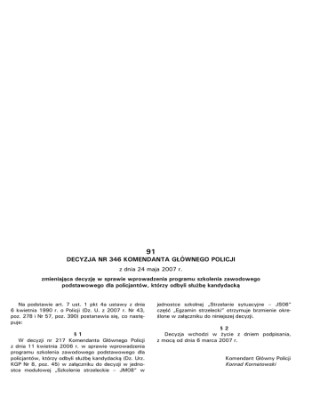 91 DECYZJA NR 346 KOMENDANTA GŁÓWNEGO POLICJI z dnia 24 maja 2007 r. zmieniająca decyzję w sprawie wprowadzenia programu szkolenia zawodowego podstawowego dla policjantów, którzy odbyli służbę kandydacką Na podstawie art. 7 ust. 1 pkt 4a ustawy z dnia 6 kwietnia 1990 r. o Policji (Dz. U. z 2007 r. Nr 43, poz. 278 i Nr 57, poz. 390) postanawia się, co następuje: §1 W decyzji nr 217 Komendanta Głównego Policji z dnia 11 kwietnia 2006 r. w sprawie wprowadzenia programu szkolenia zawodowego podstawowego dla policjantów, którzy odbyli służbę kandydacką (Dz. Urz. KGP Nr 8, poz. 45) w załączniku do decyzji w jednostce modułowej „Szkolenie strzeleckie – JM08” w jednostce szkolnej „Strzelanie sytuacyjne – JS06” część „Egzamin strzelecki” otrzymuje brzmienie określone w załączniku do niniejszej decyzji. §2 Decyzja wchodzi w życie z dniem podpisania, z mocą od dnia 6 marca 2007 r. Komendant Główny Policji Konrad Kornatowski Dziennik Urzędowy Komendy Głównej Policji nr 11 -508- Poz. 91 Załącznik do decyzji nr 346 Komendanta Głównego Policji z dnia 24 maja 2007 r. EGZAMIN STRZELECKI – 6 godzin Warunkiem dopuszczenia słuchacza do egzaminu strzeleckiego jest uzyskanie zaliczenia wszystkich jednostek szkolnych JS 01, JS 02, JS 03, JS 04, JS 05, JS 06 realizowanych w ramach jednostki modułowej JM 08. Egzamin strzelecki składa się z trzech etapów: 1) test wiedzy; 2) test umiejętności; 3) strzelanie egzaminacyjne. Etap I – test wiedzy Pisemny test wiedzy winien składać się, z co najmniej 30 zadań wielokrotnego wyboru z zakresu stanowiącego materiał nauczania jednostki modułowej. Na rozwiązanie każdego zadania testowego słuchacz winien mieć 1 minutę. Słuchacz, aby zaliczyć test, musi rozwiązać prawidłowo co najmniej 60%+1 zadań testowych. Skala ocen: 1) ocena 6 (wyróżniająca) − 29 – 30 pkt 2) ocena 5 (bardzo dobra) − 27 – 28 pkt 3) ocena 4 (dobra) − 24 – 26 pkt 4) ocena 3 (poprawna) − 21 – 23 pkt 5) ocena 2 (dopuszczająca) − 19 – 20 pkt 6) ocena 1 (niedostateczna) − 18 pkt i poniżej Etap II – test umiejętności Podczas testu umiejętności słuchacz winien wykazać się następującymi wiadomościami i umiejętnościami: 1) bezpieczeństwo użytkowani broni palnej; 2) rozkładanie i składanie pistoletów P-64, P-83, P-99, Glock; 3) rozkładanie i składanie pistoletu maszynowego; 4) rozkładanie i składanie strzelb gładkolufowych; 5) rozpoznawanie i usuwanie zacięć broni palnej. Etap III – strzelanie egzaminacyjne 1. Zadaniem egzaminacyjnym jest strzelanie dynamiczne zgodnie z warunkami określonymi w decyzji nr 713 Komendanta Głównego Policji z dnia 30 grudnia 2005 r. w sprawie szkolenia strzeleckiego policjantów (Dz. Urz. KGP z 2006 r. Nr 3, poz. 9 oraz z 2007 r. Nr 2, poz. 5). Wybór typu i rodzaju broni do realizacji egzaminu pozostaje w gestii komisji egzaminacyjnej. 2. W trakcie egzaminu strzeleckiego oceniane jest poprawne wykonanie strzelania dynamicznego (zgodnie z warunkami zawartymi w instrukcji dotyczącej szkolenia strzeleckiego) oraz elementy taktyki i techniki użycia broni, tj.: 1) przyjęcie właściwej postawy strzeleckiej; 2) wydanie okrzyku „POLICJA”; 3) dokonanie kontroli broni; 4) przestrzeganie zasad bezpieczeństwa; 5) w przypadku wystąpienia zacięcia – usunięcie go zgodnie z obowiązującymi zasadami; 6) przemieszczanie się z bronią z palcem ułożonym na zamku broni; 7) prawidłowa wymiana magazynka; 8) wykorzystanie osłon; 9) właściwe poruszanie się z bronią. 3. Zestaw zadań i kryteria ocen strzelania egzaminacyjnego zawiera „Karta oceny zadania egzaminacyjnego – szkolenie strzeleckie”. 4. Każdy etap egzaminu musi być zaliczony na ocenę pozytywną. Dziennik Urzędowy Komendy Głównej Policji nr 11 -509- Poz. 91 5. W przypadku uzyskania na poszczególnym etapie egzaminu oceny negatywnej, egzamin ulega przerwaniu i powoduje wystawienie słuchaczowi negatywnej oceny z egzaminu. 6. Ocenę z egzaminu stanowi średnia ocen uzyskanych przez słuchacza z poszczególnych etapów egzaminu. SZPPK 01. JM 08 KARTA OCENY ZADANIA EGZAMINACYJNEGO − szkolenie strzeleckie 1. 2. 3. 4. 5. 6. 7. Poruszanie się z bronią (dobieg, zatrzymanie i przemieszczanie się z bronią) Przyjęcie właściwych postaw strzeleckich Realizacja czynności przed użyciem broni (okrzyk „Policja”) Kontrola broni Przestrzeganie zasad bezpieczeństwa Prawidłowa wymiana magazynka Wykonanie strzelania: − 12 trafień − 11 trafień − 10 trafień − 9 trafień − 8 trafień − − − − − − 3 4 3 4 6 2 − − − − − 12 pkt 11 pkt 10 pkt 9 pkt 8 pkt pkt pkt pkt* pkt pkt pkt Skala ocen: Ocena 6 5 4 3 2 1 − − − − − − 33 31 28 23 18 18 – 34 pkt – 32 pkt – 30 pkt – 27 pkt – 22 pkt pkt i poniżej Warunkiem uzyskania oceny pozytywnej jest uzyskanie niezbędnego minimum przestrzelin zgodnie z warunkami zaliczenia strzelania dynamicznego określonymi w decyzji nr 713 Komendanta Głównego Policji z dnia 30 grudnia 2005 r. w sprawie szkolenia strzeleckiego policjantów (Dz. Urz. KGP z 2006 r. Nr 3, poz. 9 oraz z 2007 r. Nr 2, poz. 5). * przyznaje się 0 (zero) lub maksymalną liczbę punktów