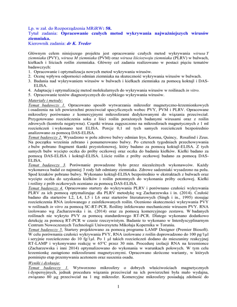 Lp. w zał. do Rozporządzenia MRiRW: 58. Tytuł zadania: Opracowanie czułych metod wykrywania najważniejszych wirusów ziemniaka. Kierownik zadania: dr K. Treder Głównym celem niniejszego projektu jest opracowanie czułych metod wykrywania wirusa Y ziemniaka (PVY), wirusa M ziemniaka (PVM) oraz wirusa liściozwoju ziemniaka (PLRV) w bulwach, kiełkach i liściach roślin ziemniaka. Główny cel zadania realizowano w postaci pięciu tematów badawczych: 1. Opracowanie i optymalizacja nowych metod wykrywania wirusów. 2. Ocenę wpływu odporności odmian ziemniaka na skuteczność wykrywania wirusów w bulwach. 3. Badania nad wykrywaniem wirusów w bulwach i kiełkach ziemniaka za pomocą koktajl i DASELISA. 4. Adaptację i optymalizację metod molekularnych do wykrywania wirusów w roślinach in vitro. 5. Opracowanie testów diagnostycznych do szybkiego wykrywania wirusów. Materiały i metody: Temat badawczy 1. Opracowano sposób wytwarzania mikrosfer magnetyczno-krzemionkowych i osadzenia na ich powierzchni przeciwciał specyficznych wobec PVY, PVM i PLRV. Opracowane mikrosfery porównano z komercyjnymi mikrosferami dedykowanymi do wiązania przeciwciał. Przygotowano rozcieńczenia soku z liści roślin porażonych badanymi wirusami oraz z roślin zdrowych (kontrola negatywna). Cząstki wirusa zagęszczono na mikrosferach magnetycznych z 1 ml rozcieńczeń i wykonano test ELISA. Porcje 0,1 ml tych samych rozcieńczeń bezpośrednio analizowano za pomocą DAS-ELISA. Temat badawczy 2. Wysadzono w polu zdrowe bulwy odmian Irys, Korona, Quincy, Rosalind i Zeus. Na początku września zebrano i ponumerowano bulwy. Po czterech tygodniach przechowywania z bulw pobrano fragment tkanki przystolonowej, który badano za pomocą koktajl-ELISA. Z tych samych bulw wycięto oczka do próby oczkowej oraz oczka do badania kiełków. Kiełki badano za pomocą DAS-ELISA i koktajl-ELISA. Liście roślin z próby oczkowej badano za pomocą DASELISA. Temat badawczy 3. Porównanie prowadzone było przez niezależnych wykonawców. Każdy wykonawca badał co najmniej 3 rody lub odmiany ziemniaka. Zdrowe sadzeniaki wysadzono na polu. Spod krzaków pobrano bulwy. Wykonano koktajl-ELISA bezpośrednio w ekstraktach z bulwach oraz wycięto oczka do uzyskania kiełków i roślin potomnych do wykonania próby oczkowej. Kiełki i rośliny z prób oczkowych oceniano za pomocą DAS-ELISA. Temat badawczy 4. Opracowano startery do wykrywania PLRV i porównano czułości wykrywania PLRV za ich pomocą optymalizując dla PLRV metodykę wg Zacharzewska i in. (2014). Czułość badano dla starterów L2, L4, L5 i L6 oraz starterów literaturowych (Singh i in., 1995) stosując rozcieńczenia RNA izolowanego z zainfekowanych roślin. Oceniono skuteczności wykrywania PVY w roślinach in vitro za pomocą SC-RT-PCR. Rośliny infekowano mechanicznie wirusem PVY. RNA izolowano wg Zacharzewska i in. (2014) oraz za pomocą komercyjnego zestawu. W badanych roślinach nie wykryto PVY za pomocą standardowego RT-PCR. Dlatego wykonano dodatkowo detekcję za pomocą RT-PCR w czasie rzeczywistym. Badanie to wykonano w Interdyscyplinarnym Centrum Nowoczesnych Technologii Uniwersytetu Mikołaja Kopernika w Toruniu. Temat badawczy 5. Startery projektowano za pomocą programu LAMP Designer (Premier Biosoft). W celu porównania czułości wykrywania PVY, RNA izolowane z roślin doprowadzono do 100 pg/1µl i seryjnie rozcieńczono do 10 fg/1µl. Po 1 µl takich rozcieńczeń dodano do mieszaniny reakcyjnej RT-LAMP i wykonywano reakcję w 65°C przez 30 min. Procedurę izolacji RNA na krzemionce (Zacharzewska i inni 2014) optymalizowano do wykonania w warunkach polowych. W tym celu krzemionkę zastąpiono mikrosferami magnetycznymi. Opracowano skrócone warianty, w których pominięto etap przemywania acetonem oraz suszenia osadu. Wyniki i dyskusja: Temat badawczy 1. Wytworzono mikrosfery o dobrych właściwościach magnetycznych i dyspersyjnych, jednak procedura wiązania przeciwciał na ich powierzchni była mało wydajna, związano 80 µg przeciwciał na 1 mg mikrosfer. Komercyjne mikrosfery posiadają zdolność do 1 wiązania ok 7 mg przeciwciał na 1 mg mikrosfer. Tą różnicą, w zdolności do wiązania przeciwciał przez mikrosfery wytworzone oraz komercyjne, tłumaczyć można różnice w uzyskanych wynikach. Gdy magnetyczny test ELISA wykonano na wytworzonych mikrosferach, w ogóle nie wykryto PVY i PVM a wartości uzyskane dla PLRV były niskie, choć wystarczająco wysokie by wykryć wirus nawet w 1000 razy rozcieńczonym soku. Z wykorzystaniem komercyjnych mikrosfer wykryto badane wirusy we wszystkich rozcieńczeniach. Ponadto wartości absorbancji uzyskane dla 1000 razy rozcieńczonych soków z roślin porażonych, były bardzo wysokie. Temat badawczy 2. Stwierdzono związek pomiędzy odpornością odmian na PVY a wykrywalnością tego wirusa w bulwach. Im wyższy stopień odporności odmian, tym większa rozbieżność wyników wykrywania PVY w bulwach i w próbie oczkowej. Temat badawczy 3. W bieżącym roku żaden z wykonawców nie wykrył w badanym materiale obecności PLRV. Również PVM w ogóle nie został wykryty przez jednego z wykonawców a w badaniach Wykonawcy II wykryto go tylko w 8 roślinach na 90 badanych. PVY również występował nielicznie. W badaniach wykazano niską skuteczność wykrywania PVY bezpośrednio w bulwach. Testowanie kiełków przez wszystkich wykonawców dawało dobrą zgodność z próbą oczkową, niezależnie od tego, czy wykonano je testem koktajlowym, czy DAS ELISA. Temat badawczy 4. Opracowano startery (L2, L4, L5, L6), które porównano ze starterami wg Singh i inni. (1995). Najwyższą czułość uzyskano stosując startery L2. Oceniano również skuteczności wykrywania PVY w roślinach in vitro za pomocą SC-RT-PCR. Doświadczenie powtarzano kilkukrotnie, ponieważ nie wykrywano PVY w badanych roślinach. Dlatego ostatnią serię roślin przebadano za pomocą testu RT-PCR w czasie r