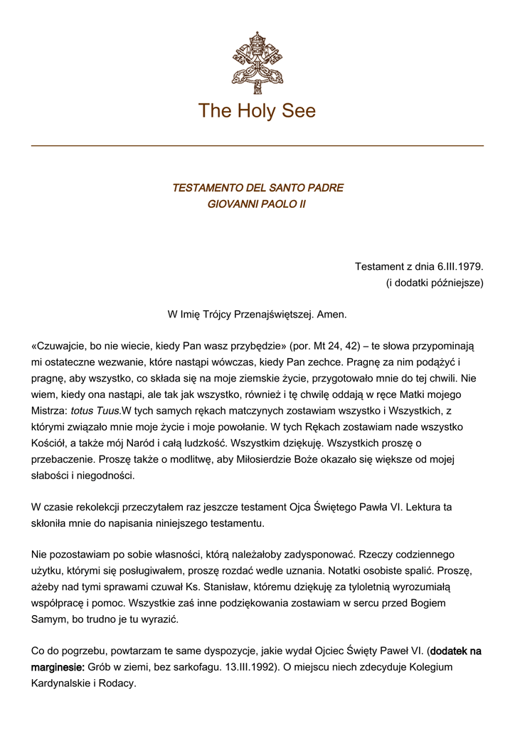 The Holy See TESTAMENTO DEL SANTO PADRE GIOVANNI PAOLO II Testament z dnia 6.III.1979. (i dodatki późniejsze) W Imię Trójcy Przenajświętszej. Amen. «Czuwajcie, bo nie wiecie, kiedy Pan wasz przybędzie» (por. Mt 24, 42) – te słowa przypominają mi ostateczne wezwanie, które nastąpi wówczas, kiedy Pan zechce. Pragnę za nim podążyć i pragnę, aby wszystko, co składa się na moje ziemskie życie, przygotowało mnie do tej chwili. Nie wiem, kiedy ona nastąpi, ale tak jak wszystko, również i tę chwilę oddają w ręce Matki mojego Mistrza: totus Tuus.W tych samych rękach matczynych zostawiam wszystko i Wszystkich, z którymi związało mnie moje życie i moje powołanie. W tych Rękach zostawiam nade wszystko Kościół, a także mój Naród i całą ludzkość. Wszystkim dziękuję. Wszystkich proszę o przebaczenie. Proszę także o modlitwę, aby Miłosierdzie Boże okazało się większe od mojej słabości i niegodności. W czasie rekolekcji przeczytałem raz jeszcze testament Ojca Świętego Pawła VI. Lektura ta skłoniła mnie do napisania niniejszego testamentu. Nie pozostawiam po sobie własności, którą należałoby zadysponować. Rzeczy codziennego użytku, którymi się posługiwałem, proszę rozdać wedle uznania. Notatki osobiste spalić. Proszę, ażeby nad tymi sprawami czuwał Ks. Stanisław, któremu dziękuję za tyloletnią wyrozumiałą współpracę i pomoc. Wszystkie zaś inne podziękowania zostawiam w sercu przed Bogiem Samym, bo trudno je tu wyrazić. Co do pogrzebu, powtarzam te same dyspozycje, jakie wydał Ojciec Święty Paweł VI. (dodatek na marginesie: Grób w ziemi, bez sarkofagu. 13.III.1992). O miejscu niech zdecyduje Kolegium Kardynalskie i Rodacy. 2 «Apud Dominum Misericordia et copiosa apud Eum redemptio» Jan Paweł pp. II Rzym, 6.III.1979. Po śmierci proszę o Msze Święte i modlitwy. 5.III.1990. *** Wyrażam najgłębszą ufność, że przy całej mojej słabości Pan udzieli mi każdej łaski potrzebnej, aby sprostać wedle Jego Woli wszelkim zadaniom, doświadczeniom i cierpieniom, jakich zechce zażądać od swego sługi w ciągu życia. Ufam też, że nie dopuści, abym kiedykolwiek przez jakieś swoje postępowanie: słowa, działanie lub zaniedbanie działań, mógł sprzeniewierzyć się moim obowiązkom na tej świętej Piotrowej Stolicy. *** 24.II. – 1. III.1980. Również w ciągu tych rekolekcji rozważałem prawdę o Chrystusowym kapłaństwie w perspektywie owego Przejścia, jakim dla każdego z nas jest chwila jego śmierci. Rozstania się z tym światem – aby narodzić się dla innego, dla świata przyszłego, którego znakiem decydującym, wymownym jest dla nas Zmartwychwstanie Chrystusa. Odczytałem więc zeszłoroczny zapis mojego testamentu, dokonany również w czasie rekolekcji – porównałem go z testamentem mojego wielkiego Poprzednika i Ojca Pawła VI, z tym wspaniałym świadectwem o śmierci chrześcijanina i papieża – oraz odnowiłem w sobie świadomość spraw, do których sporządzony przeze mnie (w sposób raczej prowizoryczny) ów zapis z 6.III.1979 się odnosi. Dzisiaj pragnę do niego dodać tylko tyle, że z możliwością śmierci każdy zawsze musi się liczyć. I zawsze musi być przygotowany do tego, że stanie przed Panem i Sędzią – a zarazem Odkupicielem i Ojcem. Więc i ja liczę się z tym nieustannie, powierzając ów decydujący moment Matce Chrystusa i Kościoła – Matce mojej nadziei. 3 Czasy, w których żyjemy, są niewymownie trudne i niespokojne. Trudna także i nabrzmiała właściwą dla tych czasów próbą – stała się droga Kościoła, zarówno Wiernych jak i Pasterzy. W niektórych krajach, (jak np. w tym, o którym czytałem w czasie rekolekcji), Kościół znajduje się w okresie takiego prześladowania, które w niczym nie ustępuje pierwszym stuleciom, raczej je przewyższa co do stopnia bezwzględności i nienawiści. Sanguis Martyrum – semen Christianorum. A prócz tego – tylu ludzi ginie niewinnie, choćby i w tym kraju, w którym żyjemy... Pragnę raz jeszcze całkowicie zdać się na Wolę Pana. On Sam zdecyduje, kiedy i jak mam zakończyć moje ziemskie życie i pasterzowanie. W życiu i śmierci Totus Tuus przez Niepokalaną. Przyjmując już teraz tę śmierć, ufam, że Chrystus da mi łaskę owego ostatniego Przejścia czyli Paschy. Ufam też, że uczyni ją pożyteczną dla tej największej sprawy, której staram się służyć: dla zbawienia ludzi, dla ocalenia rodziny ludzkiej, a w niej wszystkich narodów i ludów (wśród nich serce w szczególny sposób się zwraca do mojej ziemskiej Ojczyzny), dla osób, które szczególnie mi powierzył – dla sprawy Kościoła, dla chwały Boga Samego. Niczego więcej nie pragnę dopisać do tego, co napisałem przed rokiem – tylko wyrazić ową gotowość i ufność zarazem, do jakiej niniejsze rekolekcje ponownie mnie usposobiły. Jan Paweł pp. II *** 5.III.1982. W ciągu tegorocznych rekolekcji przeczytałem (kilkakrotnie) tekst testamentu z 6.III.1979. Chociaż nadal uważam go za prowizoryczny (nie ostateczny), pozostawiam go w tej formie, w jakiej istnieje. Niczego (na razie) nie zmieniam, ani też niczego nie dodaję, gdy chodzi o dyspozycje w nim zawarte. Zamach na moje życie z 13.V.1981 w pewien sposób potwierdził słuszność słów zapisanych w czasie rekolekcji z 1980 r. (24.II – 1.III). Tym głębiej czuję, że znajduję się całkowicie w Bożych Rękach – i pozostaję nadal do dyspozycji mojego Pana, powierzając się Mu w Jego Niepokalanej Matce (Totus Tuus). Jan Paweł pp. II *** 4 5.III.1982. Ps. W związku z ostatnim zdaniem testamentu z 6.III.1979 (: O miejscu m.inn.pogrzebu) «niech zdecyduje Kolegium Kardynalskie i Rodacy» - wyjaśniam, że mam na myśli Metropolitę Krakowskiego lub Radę Główną Episkopatu Polski – Kolegium Kardynalskie zaś proszę, aby ewentualnym prośbom w miarę możności uczynili zadość. *** 1.III.1985 (w czasie rekolekcj