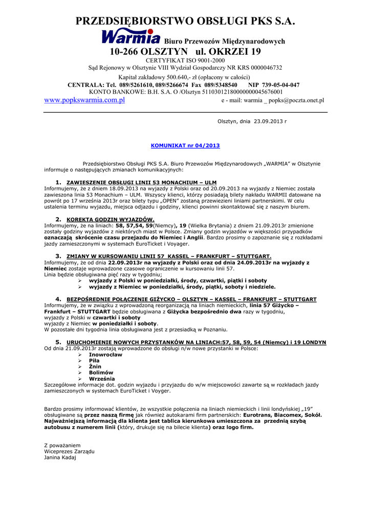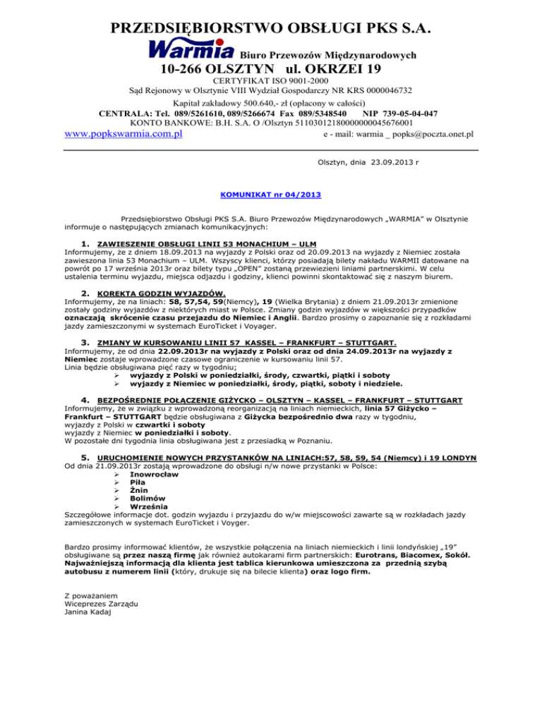 PRZEDSIĘBIORSTWO OBSŁUGI PKS S.A. Biuro Przewozów Międzynarodowych 10-266 OLSZTYN ul. OKRZEI 19 CERTYFIKAT ISO 9001-2000 Sąd Rejonowy w Olsztynie VIII Wydział Gospodarczy NR KRS 0000046732 Kapitał zakładowy 500.640,- zł (opłacony w całości) CENTRALA: Tel. 089/5261610, 089/5266674 Fax 089/5348540 NIP 739-05-04-047 KONTO BANKOWE: B.H. S.A. O /Olsztyn 51103012180000000045676001 www.popkswarmia.com.pl e - mail: warmia _ [email protected] Olsztyn, dnia 23.09.2013 r KOMUNIKAT nr 04/2013 Przedsiębiorstwo Obsługi PKS S.A. Biuro Przewozów Międzynarodowych „WARMIA” w Olsztynie informuje o następujących zmianach komunikacyjnych: 1. ZAWIESZENIE OBSŁUGI LINII 53 MONACHIUM – ULM Informujemy, że z dniem 18.09.2013 na wyjazdy z Polski oraz od 20.09.2013 na wyjazdy z Niemiec została zawieszona linia 53 Monachium – ULM. Wszyscy klienci, którzy posiadają bilety nakładu WARMII datowane na powrót po 17 września 2013r oraz bilety typu „OPEN” zostaną przewiezieni liniami partnerskimi. W celu ustalenia terminu wyjazdu, miejsca odjazdu i godziny, klienci powinni skontaktować się z naszym biurem. 2. KOREKTA GODZIN WYJAZDÓW. Informujemy, że na liniach: 58, 57,54, 59(Niemcy), 19 (Wielka Brytania) z dniem 21.09.2013r zmienione zostały godziny wyjazdów z niektórych miast w Polsce. Zmiany godzin wyjazdów w większości przypadków oznaczają skrócenie czasu przejazdu do Niemiec i Anglii. Bardzo prosimy o zapoznanie się z rozkładami jazdy zamieszczonymi w systemach EuroTicket i Voyager. 3. ZMIANY W KURSOWANIU LINII 57 KASSEL – FRANKFURT – STUTTGART. Informujemy, że od dnia 22.09.2013r na wyjazdy z Polski oraz od dnia 24.09.2013r na wyjazdy z Niemiec zostaje wprowadzone czasowe ograniczenie w kursowaniu linii 57. Linia będzie obsługiwana pięć razy w tygodniu; wyjazdy z Polski w poniedziałki, środy, czwartki, piątki i soboty wyjazdy z Niemiec w poniedziałki, środy, piątki, soboty i niedziele. 4. BEZPOŚREDNIE POŁĄCZENIE GIŻYCKO – OLSZTYN – KASSEL – FRANKFURT – STUTTGART Informujemy, że w związku z wprowadzoną reorganizacją na liniach niemieckich, linia 57 Giżycko – Frankfurt – STUTTGART będzie obsługiwana z Giżycka bezpośrednio dwa razy w tygodniu, wyjazdy z Polski w czwartki i soboty wyjazdy z Niemiec w poniedziałki i soboty. W pozostałe dni tygodnia linia obsługiwana jest z przesiadką w Poznaniu. 5. URUCHOMIENIE NOWYCH PRZYSTANKÓW NA LINIACH:57, 58, 59, 54 (Niemcy) i 19 LONDYN Od dnia 21.09.2013r zostają wprowadzone do obsługi n/w nowe przystanki w Polsce: Inowrocław Piła Żnin Bolimów Września Szczegółowe informacje dot. godzin wyjazdu i przyjazdu do w/w miejscowości zawarte są w rozkładach jazdy zamieszczonych w systemach EuroTicket i Voyger. Bardzo prosimy informować klientów, że wszystkie połączenia na liniach niemieckich i linii londyńskiej „19” obsługiwane są przez naszą firmę jak również autokarami firm partnerskich: Eurotrans, Biacomex, Sokół. Najważniejszą informacją dla klienta jest tablica kierunkowa umieszczona za przednią szybą autobusu z numerem linii (który, drukuje się na bilecie klienta) oraz logo firm. Z poważaniem Wiceprezes Zarządu Janina Kadaj