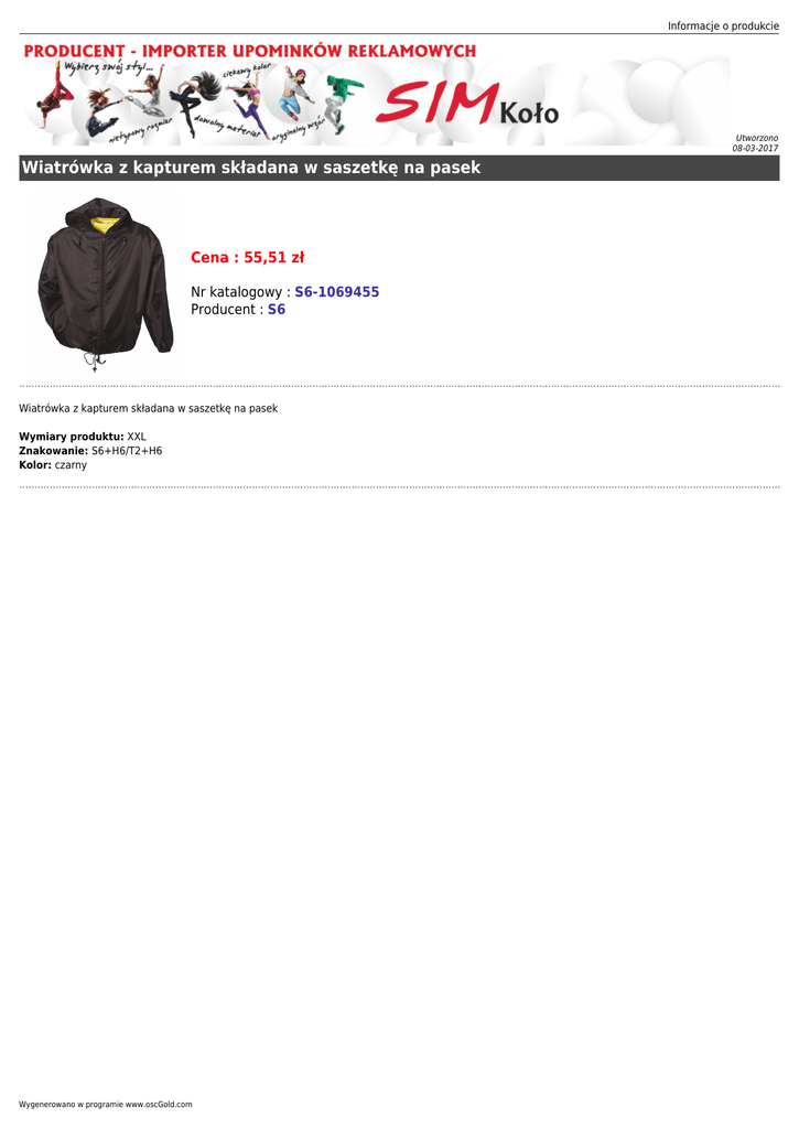 Informacje o produkcie Utworzono 08-03-2017 Wiatrówka z kapturem składana w saszetkę na pasek Cena : 55,51 zł Nr katalogowy : S6-1069455 Producent : S6 Wiatrówka z kapturem składana w saszetkę na pasek Wymiary produktu: XXL Znakowanie: S6+H6/T2+H6 Kolor: czarny Wygenerowano w programie www.oscGold.com