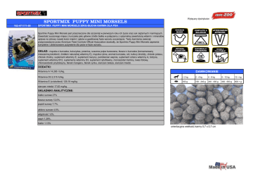 Wyłączny dystrybutor: SPORTMIX PUPPY MINI MORSELS 162-471171-00 SPORTMIX PUPPY MINI MORSELS 20KG-SUCHA KARMA DLA PSA Sportmix Puppy Mini Morsels jest przeznaczone dla szczeniąt w pierwszym roku ich Ŝycia oraz suk cięŜarnych i karmiących. Zawartość suszonego mięsa z kurczaka jako główne źródło białka w połączeniu z optymalną zawartością witamin i minerałów wpływa na zdrowy rozwój kości mięśni i zębów w gwałtownej fazie wzrostu szczenięcia. Testy karmienia zwierząt przeprowadzone przez American Feed Controls Official Association dowiodły, Ŝe Sportmix Puppy Mini Morsels zapewnia kompletne i zbilansowane poŜywienie dla psów w fazie wzrostu. SKŁAD: mączka z kurczaka, kukurydza, przenica, suszona pulpa buraczana, tłuszcz z kurczaka (konserwowany mieszaniną tokoferoli, źródłem naturalnej witaminy E), mączka rybna, aromat kurczaka, sól, kultury droŜdŜy, chlorek potasu, chlorek choliny, suplement witaminy E, suplement niacyny, pantotenian wapnia, suplement octanu witaminy A, biotyna, suplement witaminy B12, suplementy witaminy D3, suplement ryboflawiny, monoazotan tiaminy, kwas foliowy, chlorowodorek pirydoksyny, tlenek manganu, tlenek cynku, siarczan Ŝelaza, siarczan miedzi. DODATKI: DAWKOWANIE Witamina A 14,285 IU/kg, Witamina D3 2,315 IU/kg, < 2 kg 2 - 4 kg 4 - 8 kg 8 - 12 kg 12 + kg Witamina E (α-tokoferol) 129,19 mg/kg. 100 g 100 - 240 g 240 - 400 g 400 - 600 g 600 + g siarczan miedzi 17,62 mg/kg. SKŁADNIKI ANALITYCZNE: białko surowe 27% tłuszcz surowy 12,0%, popiół surowy 7,7%, włókno surowe 4,5%, wilgotność 12%, wapń 1.29%, fosfor 1.13% orientacyjna wielkość karmy 0,7 x 0,7 cm