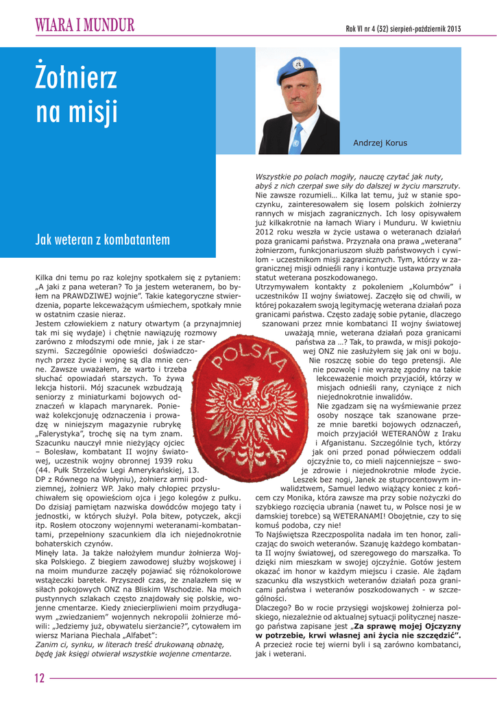 Rok VI nr 4 (32) sierpień-październik 2013 Żołnierz na misji Andrzej Korus Jak weteran z kombatantem Kilka dni temu po raz kolejny spotkałem się z pytaniem: „A jaki z pana weteran? To ja jestem weteranem, bo byłem na PRAWDZIWEJ wojnie”. Takie kategoryczne stwierdzenia, poparte lekceważącym uśmiechem, spotkały mnie w ostatnim czasie nieraz. Jestem człowiekiem z natury otwartym (a przynajmniej tak mi się wydaje) i chętnie nawiązuję rozmowy zarówno z młodszymi ode mnie, jak i ze starszymi. Szczególnie opowieści doświadczonych przez życie i wojnę są dla mnie cenne. Zawsze uważałem, że warto i trzeba słuchać opowiadań starszych. To żywa lekcja historii. Mój szacunek wzbudzają seniorzy z miniaturkami bojowych odznaczeń w klapach marynarek. Ponieważ kolekcjonuję odznaczenia i prowadzę w niniejszym magazynie rubrykę „Falerystyka”, trochę się na tym znam. Szacunku nauczył mnie nieżyjący ojciec – Bolesław, kombatant II wojny światowej, uczestnik wojny obronnej 1939 roku (44. Pułk Strzelców Legi Amerykańskiej, 13. DP z Równego na Wołyniu), żołnierz armii podziemnej, żołnierz WP. Jako mały chłopiec przysłuchiwałem się opowieściom ojca i jego kolegów z pułku. Do dzisiaj pamiętam nazwiska dowódców mojego taty i jednostki, w których służył. Pola bitew, potyczek, akcji itp. Rosłem otoczony wojennymi weteranami-kombatantami, przepełniony szacunkiem dla ich niejednokrotnie bohaterskich czynów. Minęły lata. Ja także nałożyłem mundur żołnierza Wojska Polskiego. Z biegiem zawodowej służby wojskowej i na moim mundurze zaczęły pojawiać się różnokolorowe wstążeczki baretek. Przyszedł czas, że znalazłem się w siłach pokojowych ONZ na Bliskim Wschodzie. Na moich pustynnych szlakach często znajdowały się polskie, wojenne cmentarze. Kiedy zniecierpliwieni moim przydługawym „zwiedzaniem” wojennych nekropolii żołnierze mówili: „Jedziemy już, obywatelu sierżancie?”, cytowałem im wiersz Mariana Piechala „Alfabet”: Zanim ci, synku, w literach treść drukowaną obnażę, będę jak księgi otwierał wszystkie wojenne cmentarze. 12 Wszystkie po polach mogiły, nauczę czytać jak nuty, abyś z nich czerpał swe siły do dalszej w życiu marszruty. Nie zawsze rozumieli… Kilka lat temu, już w stanie spoczynku, zainteresowałem się losem polskich żołnierzy rannych w misjach zagranicznych. Ich losy opisywałem już kilkakrotnie na łamach Wiary i Munduru. W kwietniu 2012 roku weszła w życie ustawa o weteranach działań poza granicami państwa. Przyznała ona prawa „weterana” żołnierzom, funkcjonariuszom służb państwowych i cywilom - uczestnikom misji zagranicznych. Tym, którzy w zagranicznej misji odnieśli rany i kontuzje ustawa przyznała statut weterana poszkodowanego. Utrzymywałem kontakty z pokoleniem „Kolumbów” i uczestników II wojny światowej. Zaczęło się od chwili, w której pokazałem swoją legitymację weterana działań poza granicami państwa. Często zadaję sobie pytanie, dlaczego szanowani przez mnie kombatanci II wojny światowej uważają mnie, weterana działań poza granicami państwa za …? Tak, to prawda, w misji pokojowej ONZ nie zasłużyłem się jak oni w boju. Nie roszczę sobie do tego pretensji. Ale nie pozwolę i nie wyrażę zgodny na takie lekceważenie moich przyjaciół, którzy w misjach odnieśli rany, czyniące z nich niejednokrotnie inwalidów. Nie zgadzam się na wyśmiewanie przez osoby noszące tak szanowane przeze mnie baretki bojowych odznaczeń, moich przyjaciół WETERANÓW z Iraku i Afganistanu. Szczególnie tych, którzy jak oni przed ponad półwieczem oddali ojczyźnie to, co mieli najcenniejsze – swoje zdrowie i niejednokrotnie młode życie. Leszek bez nogi, Janek ze stuprocentowym inwalidztwem, Samuel ledwo wiążący koniec z końcem czy Monika, która zawsze ma przy sobie nożyczki do szybkiego rozcięcia ubrania (nawet tu, w Polsce nosi je w damskiej torebce) są WETERANAMI! Obojętnie, czy to się komuś podoba, czy nie! To Najświętsza Rzeczpospolita nadała im ten honor, zaliczając do swoich weteranów. Szanuję każdego kombatanta II wojny światowej, od szeregowego do marszałka. To dzięki nim mieszkam w swojej ojczyźnie. Gotów jestem okazać im honor w każdym miejscu i czasie. Ale żądam szacunku dla wszystkich weteranów działań poza granicami państwa i weteranów poszkodowanych - w szczególności. Dlaczego? Bo w rocie przysięgi wojskowej żołnierza polskiego, niezależnie od aktualnej sytuacji politycznej naszego państwa zapisane jest „Za sprawę mojej Ojczyzny w potrzebie, krwi własnej ani życia nie szczędzić”. A przecież rocie tej wierni byli i są zarówno kombatanci, jak i weterani.