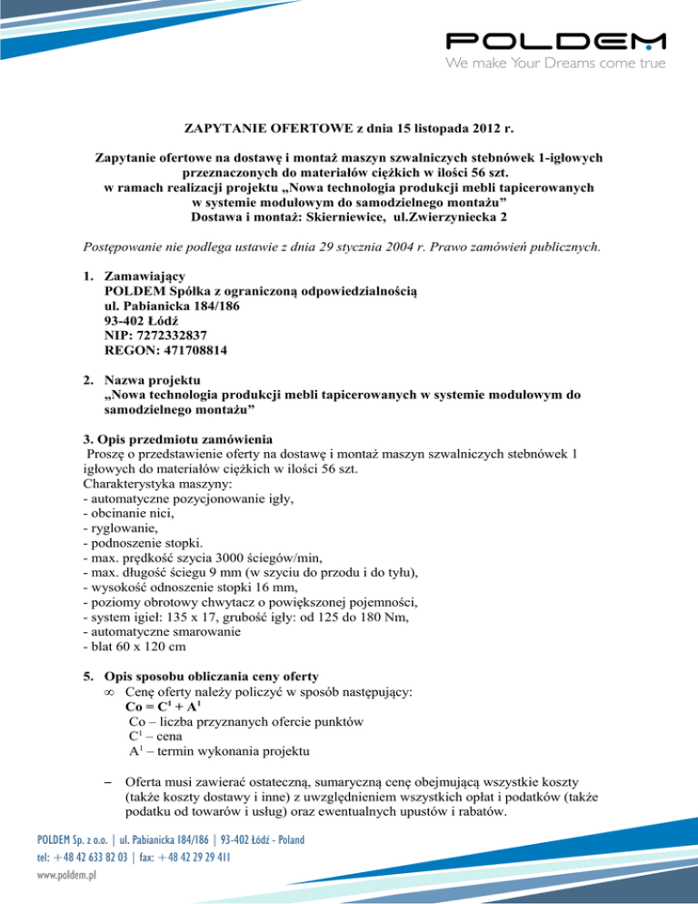 ZAPYTANIE OFERTOWE z dnia 15 listopada 2012 r. Zapytanie ofertowe na dostawę i montaż maszyn szwalniczych stebnówek 1-igłowych przeznaczonych do materiałów ciężkich w ilości 56 szt. w ramach realizacji projektu „Nowa technologia produkcji mebli tapicerowanych w systemie modułowym do samodzielnego montażu” Dostawa i montaż: Skierniewice, ul.Zwierzyniecka 2 Postępowanie nie podlega ustawie z dnia 29 stycznia 2004 r. Prawo zamówień publicznych. 1. Zamawiający POLDEM Spółka z ograniczoną odpowiedzialnością ul. Pabianicka 184/186 93-402 Łódź NIP: 7272332837 REGON: 471708814 2. Nazwa projektu „Nowa technologia produkcji mebli tapicerowanych w systemie modułowym do samodzielnego montażu” 3. Opis przedmiotu zamówienia Proszę o przedstawienie oferty na dostawę i montaż maszyn szwalniczych stebnówek 1 igłowych do materiałów ciężkich w ilości 56 szt. Charakterystyka maszyny: - automatyczne pozycjonowanie igły, - obcinanie nici, - ryglowanie, - podnoszenie stopki. - max. prędkość szycia 3000 ściegów/min, - max. długość ściegu 9 mm (w szyciu do przodu i do tyłu), - wysokość odnoszenie stopki 16 mm, - poziomy obrotowy chwytacz o powiększonej pojemności, - system igieł: 135 x 17, grubość igły: od 125 do 180 Nm, - automatyczne smarowanie - blat 60 x 120 cm 5. Opis sposobu obliczania ceny oferty • Cenę oferty należy policzyć w sposób następujący: Co = C1 + A1 Co – liczba przyznanych ofercie punktów C1 – cena A1 – termin wykonania projektu – Oferta musi zawierać ostateczną, sumaryczną cenę obejmującą wszystkie koszty (także koszty dostawy i inne) z uwzględnieniem wszystkich opłat i podatków (także podatku od towarów i usług) oraz ewentualnych upustów i rabatów. - Cena musi być podana w złotych polskich. - Jeżeli w ofercie zostanie podana cena w innej walucie niż PLN, to zostanie ona przeliczona po średnim kursie NBP danej waluty na dzień wpłynięcia oferty. - Jeżeli złożono ofertę, której wybór prowadziłby do powstania obowiązku podatkowego zamawiającego zgodnie z przepisami o podatku od towarów i usług w zakresie dotyczącym wewnątrzwspólnotowego nabycia towarów, zamawiający w celu oceny takiej oferty dolicza do przedstawionej w niej ceny podatek od towarów i usług, który miałby obowiązek wpłacić zgodnie z obowiązującymi przepisami. 6. Opis kryteriów, którymi zamawiający będzie kierował się przy wyborze najkorzystniejszej oferty wraz z podaniem znaczenia tych kryteriów i sposobu oceny ofert Opis kryteriów wraz z podaniem znaczenia Zamawiający wyznaczył następujące kryteria i ich znaczenie: a. w przypadku kryterium cena oferty 60% b. w przypadku kryterium termin wykonania projektu 40%; Sposób oceny ofert Kryterium: cena ofertowa brutto (określona do dwóch miejsc po przecinku) zostanie ocenione przy zastosowaniu następującego wzoru: najniższa cena C1 = ---------------------------- x 60% oferowana cena Kryterium: termin wykonania projektu – w ramach tego kryterium największą liczbę punktów otrzymuje Wykonawca, który zaoferuje najkrótszy termin wykonania projektu, natomiast 0 punktów otrzyma Wykonawca oferujący najdłuższy termin wykonania projektu. Punktacja dokonywana będzie w skali 0-10. A1 – liczba punktów x 40% 7. Termin wykonania zamówienia Początek realizacji zamówienia ma nastąpić nie później niż od dnia 1 grudnia 2012r. 8. Miejsce i termin składania ofert Ofertę należy przesłać do firmy POLDEM Spółka z ograniczoną odpowiedzialnością, ul. Pabianicka 184/186, 93-402 Łódź w terminie do dnia: 24 listopada 2012 r.