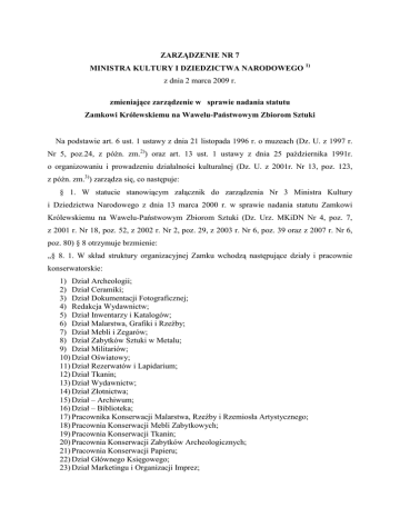 ZARZĄDZENIE NR 7 MINISTRA KULTURY I DZIEDZICTWA NARODOWEGO 1) z dnia 2 marca 2009 r. zmieniające zarządzenie w sprawie nadania statutu Zamkowi Królewskiemu na Wawelu-Państwowym Zbiorom Sztuki Na podstawie art. 6 ust. 1 ustawy z dnia 21 listopada 1996 r. o muzeach (Dz. U. z 1997 r. Nr 5, poz.24, z późn. zm.2)) oraz art. 13 ust. 1 ustawy z dnia 25 października 1991r. o organizowaniu i prowadzeniu działalności kulturalnej (Dz. U. z 2001r. Nr 13, poz. 123, z późn. zm.3)) zarządza się, co następuje: § 1. W statucie stanowiącym załącznik do zarządzenia Nr 3 Ministra Kultury i Dziedzictwa Narodowego z dnia 13 marca 2000 r. w sprawie nadania statutu Zamkowi Królewskiemu na Wawelu-Państwowym Zbiorom Sztuki (Dz. Urz. MKiDN Nr 4, poz. 7, z 2001 r. Nr 18, poz. 52, z 2002 r. Nr 2, poz. 29, z 2003 r. Nr 6, poz. 39 oraz z 2007 r. Nr 6, poz. 80) § 8 otrzymuje brzmienie: „§ 8. 1. W skład struktury organizacyjnej Zamku wchodzą następujące działy i pracownie konserwatorskie: 1) Dział Archeologii; 2) Dział Ceramiki; 3) Dział Dokumentacji Fotograficznej; 4) Redakcja Wydawnictw; 5) Dział Inwentarzy i Katalogów; 6) Dział Malarstwa, Grafiki i Rzeźby; 7) Dział Mebli i Zegarów; 8) Dział Zabytków Sztuki w Metalu; 9) Dział Militariów; 10) Dział Oświatowy; 11) Dział Rezerwatów i Lapidarium; 12) Dział Tkanin; 13) Dział Wydawnictw; 14) Dział Złotnictwa; 15) Dział – Archiwum; 16) Dział – Biblioteka; 17) Pracownika Konserwacji Malarstwa, Rzeźby i Rzemiosła Artystycznego; 18) Pracownia Konserwacji Mebli Zabytkowych; 19) Pracownia Konserwacji Tkanin; 20) Pracownia Konserwacji Zabytków Archeologicznych; 21) Pracownia Konserwacji Papieru; 22) Dział Głównego Księgowego; 23) Dział Marketingu i Organizacji Imprez; 24) Dział Inwestycji i Remontów; 25) Dział Eksploatacji; 26) Dział Zamówień Publicznych, Zaopatrzenia i Transportu; 27) Dział Informatyki; 28) Dział Administracji Budynków; 29) Dział Ochrony i StraŜy; 30) Dział Spraw Pracowniczych. 2. Zamek posiada następujące oddziały: 1) Oddział - Zamek w Pieskowej Skale; 2) Oddział – Dwór w Stryszowie.”. § 2. Zarządzenie wchodzi w Ŝycie z dniem podpisania. MINISTER KULTURY I DZIEDZICTWA NARODOWEGO Bogdan Zdrojewski 1) Minister Kultury i Dziedzictwa Narodowego kieruje działem administracji rządowej – kultura i ochrona dziedzictwa narodowego, na podstawie § 1 ust. 2 rozporządzenia Prezesa Rady Ministrów z dnia 16 listopada 2007 r. w sprawie szczegółowego zakresu działania Ministra Kultury i Dziedzictwa Narodowego (Dz. U. Nr 216, poz. 1595). 2) Zmiany wymienionej ustawy zostały ogłoszone w Dz. U. z 1998 r. Nr 106, poz. 668, z 2002 r. Nr 113, poz. 984, z 2003r. Nr 162, poz. 1568, z 2005 r. Nr 64, poz. 565 oraz z 2007 r. Nr 136, poz. 956. 3) Zmiany tekstu jednolitego wymienionej ustawy zostały ogłoszone w Dz. U. z 2002 r. Nr 41, poz.364, z 2003r. Nr 96, poz. 874 , Nr 162, poz. 1568 i Nr 213, poz.2081, z 2004r. Nr 11, poz.96 i Nr 261, poz.2598, z 2005 r. Nr 131, poz. 1091 i Nr 132, poz. 1111 oraz z 2006 r. Nr 227, poz. 1658.