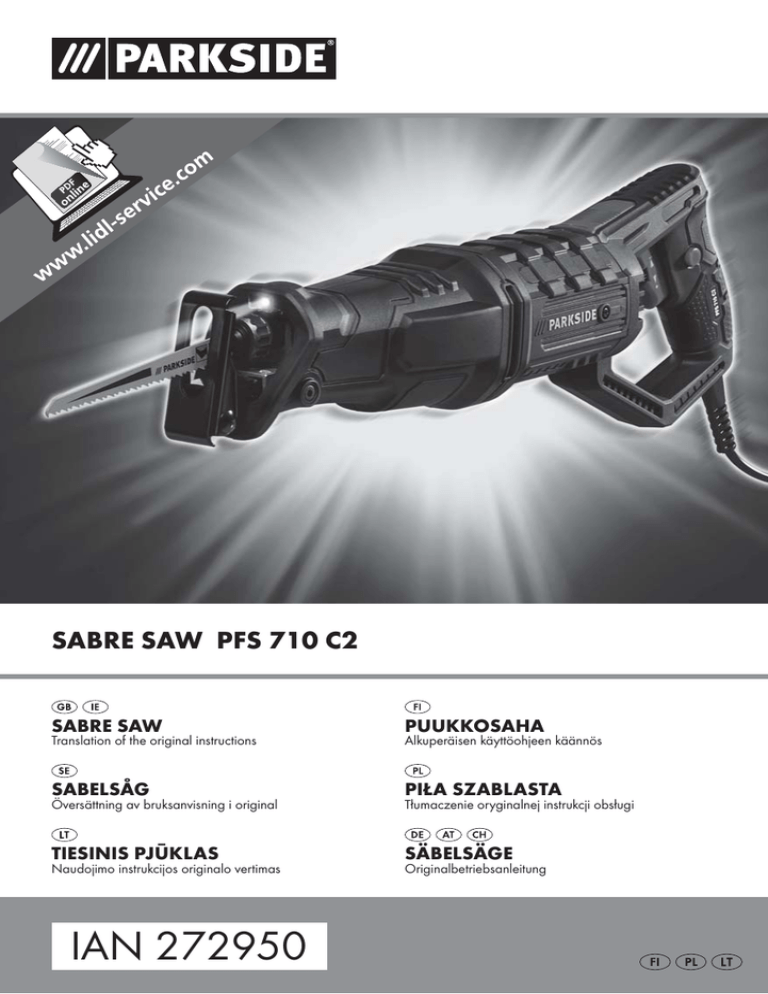 SABRE SAW PFS 710 C2 SABRE SAW PUUKKOSAHA Translation of the original instructions Alkuperäisen käyttöohjeen käännös SABELSÅG PIŁA SZABLASTA TIESINIS PJŪKLAS SÄBELSÄGE Översättning av bruksanvisning i original Naudojimo instrukcijos originalo vertimas IAN 272950 Tłumaczenie oryginalnej instrukcji obsługi Originalbetriebsanleitung Before reading, unfold the page containing the illustrations and familiarise yourself with all functions of the device. Käännä ennen lukemista kuvallinen sivu esiin ja tutustu seuraavaksi laitteen kaikkiin toimintoihin. Vik ut bildsidan och ha den till hands när du läser igenom anvisningarna och gör dig bekant med apparatens / maskinens funktioner. Przed przeczytaniem proszę rozłożyć stronę z ilustracjami, a następnie proszę zapoznać się z wszystkimi funkcjami urządzenia. Prieš skaitydami atsiverskite lapą su paveikslėliais ir susipažinkite su visomis prietaiso funkcijomis. Klappen Sie vor dem Lesen die Seite mit den Abbildungen aus und machen Sie sich anschließend mit allen Funktionen des Gerätes vertraut. GB / IE FI SE PL LT DE / AT / CH Translation of the original instructions Alkuperäisen käyttöohjeen käännös Översättning av bruksanvisning i original Tłumaczenie oryginalnej instrukcji obsługi Naudojimo instrukcijos originalo vertimas Originalbetriebsanleitung Page Sivu Sidan Strona Seite Seite 1 11 21 31 41 51 Contents GB IE Introduction . . . . . . . . . . . . . . . . . . . . . . . . . . . . . . . . . . . . . . . . . . . . . . . . . . . . . . 2 Intended use . . . . . . . . . . . . . . . . . . . . . . . . . . . . . . . . . . . . . . . . . . . . . . . . . . . . . . . . . . . . . . . . 2 Features . . . . . . . . . . . . . . . . . . . . . . . . . . . . . . . . . . . . . . . . . . . . . . . . . . . . . . . . . . . . . . . . . . . 2 Package contents . . . . . . . . . . . . . . . . . . . . . . . . . . . . . . . . . . . . . . . . . . . . . . . . . . . . . . . . . . . . 2 Technical data . . . . . . . . . . . . . . . . . . . . . . . . . . . . . . . . . . . . . . . . . . . . . . . . . . . . . . . . . . . . . . 2 General power tool safety warnings . . . . . . . . . . . . . . . . . . . . . . . . . . . . . . . . . 3 1. Work area safety . . . . . . . . . . . . . . . . . . . . . . . . . . . . . . . . . . . . . . . . . . . . . . . . . . . . . . . . . . 3 2. Electrical safety . . . . . . . . . . . . . . . . . . . . . . . . . . . . . . . . . . . . . . . . . . . . . . . . . . . . . . . . . . . 3 3. Personal safety . . . . . . . . . . . . . . . . . . . . . . . . . . . . . . . . . . . . . . . . . . . . . . . . . . . . . . . . . . . . 3 4. Power tool use and care . . . . . . . . . . . . . . . . . . . . . . . . . . . . . . . . . . . . . . . . . . . . . . . . . . . . 4 5. Service . . . . . . . . . . . . . . . . . . . . . . . . . . . . . . . . . . . . . . . . . . . . . . . . . . . . . . . . . . . . . . . . . . 4 Appliance-specific safety instructions . . . . . . . . . . . . . . . . . . . . . . . . . . . . . . . . . . . . . . . . . . . . . 5 Original accessories/auxiliary equipment . . . . . . . . . . . . . . . . . . . . . . . . . . . . . . . . . . . . . . . . . 5 Information on saw blades . . . . . . . . . . . . . . . . . . . . . . . . . . . . . . . . . . . . . . . . . . . . . . . . . . . . . 5 Before use . . . . . . . . . . . . . . . . . . . . . . . . . . . . . . . . . . . . . . . . . . . . . . . . . . . . . . . 6 Fitting/changing the saw blade . . . . . . . . . . . . . . . . . . . . . . . . . . . . . . . . . . . . . . . . . . . . . . . . . 6 Turning the handle . . . . . . . . . . . . . . . . . . . . . . . . . . . . . . . . . . . . . . . . . . . . . . . . . . . . . . . . . . . 6 Adjusting the footplate . . . . . . . . . . . . . . . . . . . . . . . . . . . . . . . . . . . . . . . . . . . . . . . . . . . . . . . . 6 Stroke rate selection . . . . . . . . . . . . . . . . . . . . . . . . . . . . . . . . . . . . . . . . . . . . . . . . . . . . . . . . . . 6 Operation . . . . . . . . . . . . . . . . . . . . . . . . . . . . . . . . . . . . . . . . . . . . . . . . . . . . . . . 6 Switching on and off . . . . . . . . . . . . . . . . . . . . . . . . . . . . . . . . . . . . . . . . . . . . . . . . . . . . . . . . . 6 Guiding the sabre blade safely . . . . . . . . . . . . . . . . . . . . . . . . . . . . . . . . . . . . . . . . . . . . . . . . . 6 Practical advice on sawing. . . . . . . . . . . . . . . . . . . . . . . . . . . . . . . . . . . . . . . . . . . . . . . . . . . . . 6 Maintenance and cleaning. . . . . . . . . . . . . . . . . . . . . . . . . . . . . . . . . . . . . . . . . . 7 Warranty . . . . . . . . . . . . . . . . . . . . . . . . . . . . . . . . . . . . . . . . . . . . . . . . . . . . . . . . 8 Service . . . . . . . . . . . . . . . . . . . . . . . . . . . . . . . . . . . . . . . . . . . . . . . . . . . . . . . . . . 8 Importer . . . . . . . . . . . . . . . . . . . . . . . . . . . . . . . . . . . . . . . . . . . . . . . . . . . . . . . . 8 Disposal . . . . . . . . . . . . . . . . . . . . . . . . . . . . . . . . . . . . . . . . . . . . . . . . . . . . . . . . . 9 Translation of the original Conformity Declaration . . . . . . . . . . . . . . . . . . . . . . 9 PFS 710 C2 1 GB IE SABRE SAW PFS 710 C2 Introduction Congratulations on the purchase of your new appliance. You have selected a highquality product. The operating instructions are part of this product. They contain important information on safety, usage and disposal. Before using the product, familiarise yourself with all operating and safety instructions. Use the product only as described and for the specified areas of application. Please also pass on these operating instructions to any future owner. Intended use The appliance with a fixed hinge is designed for sawing, cutting to length and adapting wood, plastics and construction materials. The sabre saw is suitable for rough sawing work, straight and curved cuts and cuts off surfaces flush. Follow the information concerning saw bla