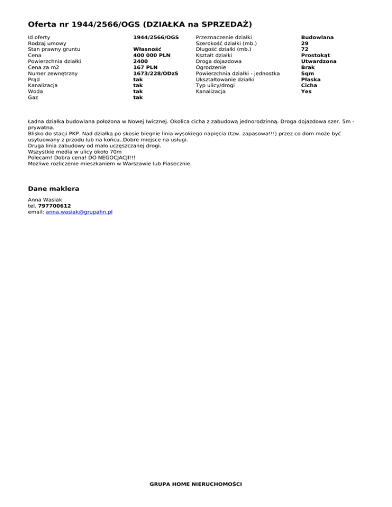 Oferta nr 1944/2566/OGS (DZIAŁKA na SPRZEDAŻ)