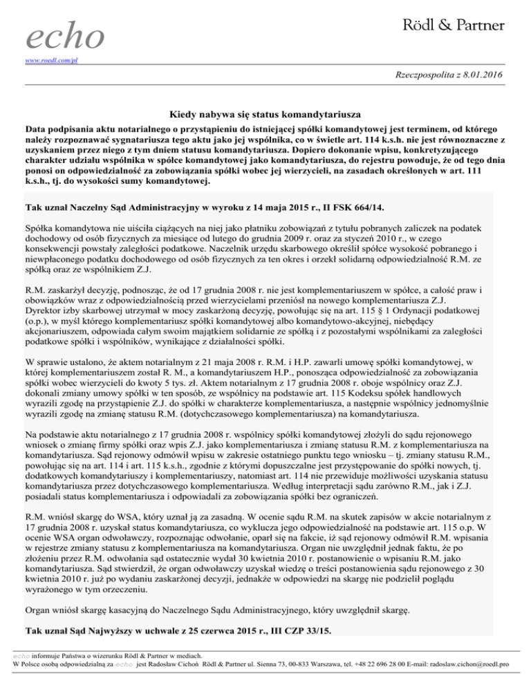 echo www.roedl.com/pl Rzeczpospolita z 8.01.2016 Kiedy nabywa się status komandytariusza Data podpisania aktu notarialnego o przystąpieniu do istniejącej spółki komandytowej jest terminem, od którego należy rozpoznawać sygnatariusza tego aktu jako jej wspólnika, co w świetle art. 114 k.s.h. nie jest równoznaczne z uzyskaniem przez niego z tym dniem statusu komandytariusza. Dopiero dokonanie wpisu, konkretyzującego charakter udziału wspólnika w spółce komandytowej jako komandytariusza, do rejestru powoduje, że od tego dnia ponosi on odpowiedzialność za zobowiązania spółki wobec jej wierzycieli, na zasadach określonych w art. 111 k.s.h., tj. do wysokości sumy komandytowej. Tak uznał Naczelny Sąd Administracyjny w wyroku z 14 maja 2015 r., II FSK 664/14. Spółka komandytowa nie uiściła ciążących na niej jako płatniku zobowiązań z tytułu pobranych zaliczek na podatek dochodowy od osób fizycznych za miesiące od lutego do grudnia 2009 r. oraz za styczeń 2010 r., w czego konsekwencji powstały zaległości podatkowe. Naczelnik urzędu skarbowego określił spółce wysokość pobranego i niewpłaconego podatku dochodowego od osób fizycznych za ten okres i orzekł solidarną odpowiedzialność R.M. ze spółką oraz ze wspólnikiem Z.J. R.M. zaskarżył decyzję, podnosząc, że od 17 grudnia 2008 r. nie jest komplementariuszem w spółce, a całość praw i obowiązków wraz z odpowiedzialnością przed wierzycielami przeniósł na nowego komplementariusza Z.J. Dyrektor izby skarbowej utrzymał w mocy zaskarżoną decyzję, powołując się na art. 115 § 1 Ordynacji podatkowej (o.p.), w myśl którego komplementariusz spółki komandytowej albo komandytowo-akcyjnej, niebędący akcjonariuszem, odpowiada całym swoim majątkiem solidarnie ze spółką i z pozostałymi wspólnikami za zaległości podatkowe spółki i wspólników, wynikające z działalności spółki. W sprawie ustalono, że aktem notarialnym z 21 maja 2008 r. R.M. i H.P. zawarli umowę spółki komandytowej, w której komplementariuszem został R. M., a komandytariuszem H.P., ponosząca odpowiedzialność za zobowiązania spółki wobec wierzycieli do kwoty 5 tys. zł. Aktem notarialnym z 17 grudnia 2008 r. oboje wspólnicy oraz Z.J. dokonali zmiany umowy spółki w ten sposób, ze wspólnicy na podstawie art. 115 Kodeksu spółek handlowych wyrazili zgodę na przystąpienie Z.J. do spółki w charakterze komplementariusza, a następnie wspólnicy jednomyślnie wyrazili zgodę na zmianę statusu R.M. (dotychczasowego komplementariusza) na komandytariusza. Na podstawie aktu notarialnego z 17 grudnia 2008 r. wspólnicy spółki komandytowej złożyli do sądu rejonowego wniosek o zmianę firmy spółki oraz wpis Z.J. jako komplementariusza i zmianę statusu R.M. z komplementariusza na komandytariusza. Sąd rejonowy odmówił wpisu w zakresie ostatniego punktu tego wniosku – tj. zmiany statusu R.M., powołując się na art. 114 i art. 115 k.s.h., zgodnie z którymi dopuszczalne jest przystępowanie do spółki nowych, tj. dodatkowych komandytariuszy i komplementariuszy, natomiast art. 114 nie przewiduje możliwości uzyskania statusu komandytariusza przez dotychczasowego komplementariusza. Według interpretacji sądu zarówno R.M., jak i Z.J. posiadali status komplementariusza i odpowiadali za zobowiązania spółki bez ograniczeń. R.M. wniósł skargę do WSA, który uznał ją za zasadną. W ocenie sądu R.M. na skutek zapisów w akcie notarialnym z 17 grudnia 2008 r. uzyskał status komandytariusza, co wyklucza jego odpowiedzialność na podstawie art. 115 o.p. W ocenie WSA organ odwoławczy, rozpoznając odwołanie, oparł się na fakcie, iż sąd rejonowy odmówił R.M. wpisania w rejestrze zmiany statusu z komplementariusza na komandytariusza. Organ nie uwzględnił jednak faktu, że po złożeniu przez R.M. odwołania sąd ostatecznie wydał 30 kwietnia 2010 r. postanowienie o wpisaniu R.M. jako komandytariusza. Sąd stwierdził, że organ odwoławczy uzyskał wiedzę o treści postanowienia sądu rejonowego z 30 kwietnia 2010 r. już po wydaniu zaskarżonej decyzji, jednakże w odpowiedzi na skargę nie podzielił poglądu wyrażonego w tym orzeczeniu. Organ wniósł skargę kasacyjną do Naczelnego Sądu Administracyjnego, który uwzględnił skargę. Tak uznał Sąd Najwyższy w uchwale z 25 czerwca 2015 r., III CZP 33/15. echo informuje Państwa o wizerunku Rödl & Partner w mediach. W Polsce osobą odpowiedzialną za echo jest Radosław Cichoń Rödl & Partner ul. Sienna 73, 00-833 Warszawa, tel. +48 22 696 28 00 E-mail: [email protected] Przedstawione Sądowi Najwyższemu do rozstrzygnięcia zagadnienie prawne powstało przy rozpoznawaniu przez sąd okręgowy zażalenia powoda na zarządzenie przewodniczącego w sądzie rejonowym o zwrocie pozwu, którego braków, mimo wezwania, powód nie uzupełnił. Zarządzeniem tym powód został wezwany do uzupełnienia braków pozwu w terminie siedmiu dni pod rygorem jego zwrotu przez złożenie: podpisanego egzemplarza pozwu na urzędowym formularzu obowiązującym w postępowaniu uproszczonym, odpisu pozwu, załączników do pozwu i ich odpisów oraz wskazanie adresu pozwanego, a nadto w terminie 14 dni pod rygorem umorzenia postępowania do złożenia pełnomocnictwa, na które powołano się w elektronicznym postępowaniu upominawczym. Sąd okręgowy stwierdził, że w razie przekazania sprawy na podstawie art. 50533 Kodeksu postępowania cywilnego (k.p.c.) z elektronicznego postępowania upominawczego do sądu właściwości ogólnej niezbędne jest nie tylko usunięcie braków wskazanych w art. 50537 § 1 k.p.c., ale także gdy pozew dotknięty jest brakami formalnymi na etapie jego wnoszenia do e-sądu, wdrożenie procedury naprawczej na podstawie art. 130 § 1 k.p.c. Wątpliwość wzbudziła kwestia dopuszczalności usuwania w trybie art. 130 § 1 k.p.c. braków istniejących na etapie wnoszenia pozwu, lecz niebędących brak
