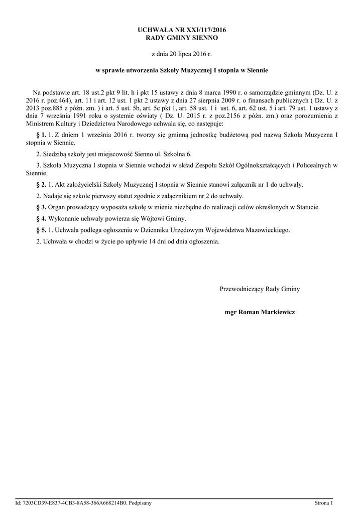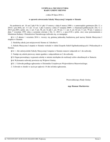 UCHWAŁA NR XXI/117/2016 RADY GMINY SIENNO z dnia 20 lipca 2016 r. w sprawie utworzenia Szkoły Muzycznej I stopnia w Siennie Na podstawie art. 18 ust.2 pkt 9 lit. h i pkt 15 ustawy z dnia 8 marca 1990 r. o samorządzie gminnym (Dz. U. z 2016 r. poz.464), art. 11 i art. 12 ust. 1 pkt 2 ustawy z dnia 27 sierpnia 2009 r. o finansach publicznych ( Dz. U. z 2013 poz.885 z późn. zm. ) i art. 5 ust. 5b, art. 5c pkt 1, art. 58 ust. 1 i ust. 6, art. 62 ust. 5 i art. 79 ust. 1 ustawy z dnia 7 września 1991 roku o systemie oświaty ( Dz. U. 2015 r. z poz.2156 z późn. zm.) oraz porozumienia z Ministrem Kultury i Dziedzictwa Narodowego uchwala się, co następuje: § 1. 1. Z dniem 1 września 2016 r. tworzy się gminną jednostkę budżetową pod nazwą Szkoła Muzyczna I stopnia w Siennie. 2. Siedzibą szkoły jest miejscowość Sienno ul. Szkolna 6. 3. Szkoła Muzyczna I stopnia w Siennie wchodzi w skład Zespołu Szkół Ogólnokształcących i Policealnych w Siennie. § 2. 1. Akt założycielski Szkoły Muzycznej I stopnia w Siennie stanowi załącznik nr 1 do uchwały. 2. Nadaje się szkole pierwszy statut zgodnie z załącznikiem nr 2 do uchwały. § 3. Organ prowadzący wyposaża szkołę w mienie niezbędne do realizacji celów określonych w Statucie. § 4. Wykonanie uchwały powierza się Wójtowi Gminy. § 5. 1. Uchwała podlega ogłoszeniu w Dzienniku Urzędowym Województwa Mazowieckiego. 2. Uchwała w chodzi w życie po upływie 14 dni od dnia ogłoszenia. Przewodniczący Rady Gminy mgr Roman Markiewicz Id: 7203CD39-E837-4CB3-8A58-366A668214B0. Podpisany Strona 1 Załącznik Nr 1 do Uchwały Nr XXI/117/2016 Rady Gminy Sienno z dnia 20 lipca 2016 r. Akt założycielski Szkoły Muzycznej I stopnia w Siennie Na podstawie art. 5 ust. 5b, art. 5c pkt 1, art. 58 ust. 1 ustawy z dnia 7 września 1991 r. o systemie oświaty (Dz. U. z 2015 r. poz.2156 z póź. zm.) w porozumieniu z Ministrem Kultury i Dziedzictwa Narodowego zakłada się z dniem 1 września 2016 r. Szkołę Muzyczną I stopnia w Siennie Przewodniczący Rady Gminy mgr Roman Markiewicz Id: 7203CD39-E837-4CB3-8A58-366A668214B0. Podpisany Strona 2 Załącznik Nr 2 do Uchwały Nr XXI/117/2016 Rady Gminy Sienno z dnia 20 lipca 2016 r. Statut Szkoły Muzycznej I stopnia w Siennie § 1. Podstawa prawna statutu: a) Ustawa z dnia 7 września 1991 r. o systemie oświaty (Dz. U. z 2015 r. poz. 2156 z późniejszymi zmianami), b) Rozporządzenie Ministra Kultury i Dziedzictwa Narodowego z dnia 5 listopada 2014 r. w sprawie ramowych statutów publicznych szkół i placówek artystycznych (Dz. U. z 2014 r., poz.1646), c) Rozporządzenie Ministra Kultury i Dziedzictwa Narodowego z dnia 24 sierpnia 2015 r. w sprawie szczegółowych warunków i sposobu oceniania, klasyfikowania i promowania uczniów w publicznych szkołach artystycznych (Dz. U. Nr 2015, poz. 1258), d) Rozporządzenia Ministra Kultury i Dziedzictwa Narodowego z dnia 15 maja 2014 r. w sprawie warunków i trybu przyjmowania uczniów do publicznych szkół i publicznych placówek artystycznych oraz przechodzenia z jednych typów szkół do innych (Dz. U. z 2014 r. poz. 686). Rozdział 1. Postanowienia ogólne § 2. 1. Szkoła Muzyczna I stopnia w Siennie jest szkołą artystyczną dającą podstawy wykształcenia muzycznego w czteroletnim i sześcioletnim cyklu kształcenia. 2. Szkoła używa nazwy: Szkoła Muzyczna I stopnia w Siennie. 3. Na pieczątkach, stemplach i pieczęciach używa się nazwy w pełnym brzmieniu według wzoru: Szkoła Muzyczna I stopnia w Siennie. 4. Siedziba szkoły znajduje się w budynku Zespołu Szkół Ogólnokształcących i Policealnych w Siennie , adres: ul. Szkolna 6, 27-350 Sienno. 5. Organem założycielskim i prowadzącym szkołę jest Gmina Sienno. 6. Szkoła prowadzi gospodarkę finansową w formie jednostki budżetowej. 7. Organem sprawującym nadzór pedagogiczny jest Minister Kultury i Dziedzictwa Narodowego, za pośrednictwem Centrum Edukacji Artystycznej w Warszawie. 8. Obsługę ekonomiczno-administracyjną i finansowo-księgową prowadzi Zespołu Szkół Ogólnokształcących i Policealnych w Siennie . 9. Absolwenci szkoły I stopnia otrzymują świadectwo ukończenia Szkoły Muzycznej I stopnia. 10. Szkoła Muzyczna I stopnia w Siennie jest szkołą publiczną. 11. Szkoła zapewnia bezpłatne nauczanie w zakresie ramowego planu nauczania, o którym mowa w przepisach w sprawie ramowych planów nauczania w publicznych szkołach i placówkach artystycznych. Rozdział 2. Cele i zadania szkoły. § 3. 1. Szkoła realizuje cele i zadania określone w ustawie z dnia 7 września 1991 r. o systemie oświaty oraz w przepisach Ministerstwa Kultury i Dziedzictwa Narodowego odnoszących się do szkół artystycznych, a w szczególności: 1) rozbudza i rozwija podstawowe zdolności muzyczne; 2) przygotowuje wrażliwych i świadomych odbiorców muzyki; 3) oddziałuje aktywnie na otoczenie w zakresie upowszechniania kultury muzycznej; 4) przygotowuje absolwentów do kontynuowania nauki w szkole muzycznej II stopnia; 5) prowadzi działania opiekuńcze i wychowawcze; Id: 7203CD39-E837-4CB3-8A58-366A668214B0. Podpisany Strona 3 6) kształtuje wrażliwość estetyczną i poczucie piękna; 7) przygotowuje do aktywnej działalności na rzecz kultury muzycznej w środowisku; 2. Szkoła realizuje cele, o których mowa w ust. 1, poprzez: 1) prowadzenie indywidualnych zajęć nauki gry na instrumentach, zbiorowych lekcji teoretycznych oraz zespołów muzycznych w zakresie przedmiotów objętych ramowym planem nauczania; 2) prowadzenie działalności koncertowej, organizowanie przeglądów, konkursów itp.; 3) udział uczniów i nauczycieli w kursach, konsultacjach, przesłuchaniach, festiwalach, koncertach, konkursach i przeglądach; 4) współpracę z władzami administracyjnymi, instytucjami kultury, podmiotami gospodarczymi poprzez: a) organizowanie koncertów i popisów, b) organizowanie konkursów upowszechniających działalność kulturalną, c) udzia