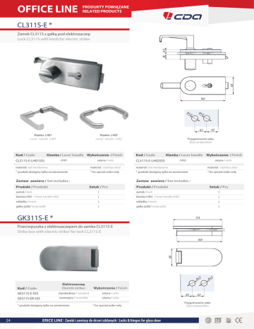 OFFICE LINE PRODUKTY POWIĄZANE RELATED PRODUCTS CL311S-E * 68 18 8.5 Zamek CL311S z gałką pod elektrozaczep Lock CL311S with knob for electric striker 160 ȼ Ú ȼ Ú 60 62 +LAMKAÚ,( ,EVERÚHANDLEÚ,( Kod / Code +LAMKAÚ,( ,EVERÚHANDLEÚ,( Klamka / Lever handle Wykończenie / Finish CL311S-E-LH01SSS LH01 satyna / satin Przygotowanie szkła Glass preparation Kod / Code Klamka / Lever handle Wykończenie / Finish CL311S-E-LH02SSS LH02 satyna / satin materiał: stal nierdzewna material: stainless steel materiał: stal nierdzewna material: stainless steel * produkt dostępny tylko na zamówienie * for special order only * produkt dostępny tylko na zamówienie * for special order only Zestaw zawiera / Set includes : Produkt / Produkt Zestaw zawiera / Set includes : Sztuk / Pcs Produkt / Produkt Sztuk / Pcs zamek / lock 1 zamek / lock 1 klamka LH01 / lever handle LH01 1 klamka LH02 / lever handle LH02 1 wkładka / insert 1 wkładka / insert 1 gałka (ø38)/ knob (ø38) 1 gałka (ø38)/ knob (ø38) 1 GK311S-E * 173 Przeciwpuszka z elektrozaczepem do zamka CL311S-E Strike box with electric striker for lock CL311S-E 68 160 Ú ȼ Kod / Code GK311S-E-SSS GK311S-ER-SSS Elektrozaczep Electrik striker Wykończenie / Finish standardowy / standard satyna / satin rewersyjny / reversible satyna / satin * produkt dostępny tylko na zamówienie 24 * for special order only ERICE LINE І Zamki i zawiasy do drzwi szklanych І Locks & hinges for glass door 60 Ú ȼ 62 Przygotowanie szkła Glass preparation 11