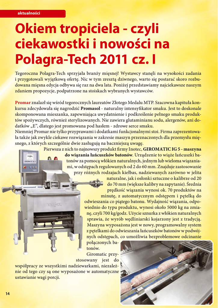aktualności Okiem tropiciela - czyli ciekawostki i nowości na Polagra-Tech 2011 cz. I Tegoroczna Polagra-Tech sprzyjała branży mięsnej! Wystawcy stanęli na wysokości zadania i przygotowali wyjątkową ofertę. Nic w tym zresztą dziwnego, warto się postarać skoro rozbudowana mięsna edycja odbywa się raz na dwa lata. Poniżej przedstawiamy najciekawsze naszym zdaniem propozycje, podpatrzone na stoiskach wybranych wystawców. Promar znalazł się wśród tegorocznych laureatów Złotego Medalu MTP. Szacowna kapituła konkursu zdecydowała się nagrodzić Promasol - naturalny intensyfikator smaku. Jest to doskonale skomponowana mieszanka, zapewniająca uwydatnienie i podkreślenie pełnego smaku produktów spożywczych, również sterylizowanych. Nie zawiera glutaminianu sodu, alergenów, ani dodatków „E”, dlatego jest promowana pod hasłem - zdrowe serce smaku. Niemniej Promar nie tylko przyprawami i dodatkami funkcjonalnymi stoi. Firma zaprezentowała także jak zwykle ciekawe rozwiązania w zakresie maszyn przeznaczonych dla przemysłu mięsnego, z których szczególnie dwie zasługują na baczniejszą uwagę. Pierwsza z nich to najnowszy produkt firmy Inotec, GIROMATIC IG 5 - maszyna do wiązania łańcuszków batonów. Urządzenie to wiąże łańcuszki batonów za pomocą włókien naturalnych, jednym lub wieloma wiązaniami, w odstępach regulowanych od 2 do 60 mm. Znajduje zastosowanie przy różnych rodzajach kiełbas, nadziewanych zarówno w jelita naturalne, jak i osłonki sztuczne o kalibrze od 20 do 70 mm (większe kalibry na zapytanie). Średnia prędkość wiązania wynosi ok. 70 produktów na minutę, z automatycznym odstępem i pętelką do odwieszania co piątego batonu. Wydajność wiązania, odpowiednio do typu produktu, wynosi około 5000 kg na zmianę, czyli 700 kg/godz. Użycie sznurka z włókien naturalnych sprawia, że wyrób wędliniarski kojarzony jest z tradycją. Maszyna wyposażona jest w nowy, programowalny system z pętelkami do odwieszania łańcuszków batonów w podwójnych odstępach, co umożliwia bezproblemowe odcinanie połączonych batonów. Giromatic przystosowany jest do współpracy ze wszystkimi nadziewarkami, niezależnie od tego czy są one wyposażone w automatyczne ustawianie wagi porcji. 14 aktualności Na uwagę zasługuje także FSL 211 firmy Vemag - urządzenie do automatycznego okręcania i porcjowania z płynną regulacją długości porcji. Po zadaniu innej długości porcji, urządzenie automatycznie wylicza długość, przy czym okręcenie następuje w prawidłowym miejscu. FSL 211 nadaje się idealnie do współpracy z nadziewarkami Vemag serii HPE i DPE, posiada wiele udogodnień takich jak: mechaniczne odkręcanie i odprowadzanie poprzez 2 pary taśm transportowych, czujnik końca osłonki (opcjonalnie), pojedynczy lejek i wymienialny hamulec osłonki z niezależnym napędem, automatyczny popychacz dla osłonek sztucznych z kontrolą końca osłonki, automatyczną synchronizację dla pracy taśm transportowych, nadziewania, obrotów okręcania. FSL 211 ma zastosowanie dla kalibrów od 13 do 50 mm, przy długości batonów od 40 mm - 1000 mm. Wydajność urządzenia wynosi do około 800 porcji/min. (w zależności od wagi, długości i rodzaju produkowanego asortymentu). Do zalet tego urządzenia niewątpliwie należą: • prostota obsługi • elastyczne zastosowanie • wysoka wydajność • duża uniwersalność urządzenia - dla wszystkich rodzajów osłonek sztucznych oraz jelit naturalnych • elastyczne porcjowanie długościowe dla zadanego kalibru i wagi • łatwa i płynna zmiana długości produktu • czujnik końca jelita naturalnego co znaczne ułatwia pracę operatora • bardzo krótki czas zmiany narzędzi (2 minuty) • łatwe mycie i konserwacja urządzenia - wysokie standardy higieniczne wykonania • zastosowanie dla szerokiego zakresu kalibrów • czujnik start-stop (opcja) z funkcją quick-start • opatentowany przez firmę Vemag system ochrony „Box in box” - wysokie standardy zabezpieczenia urządzenia przed różnymi warunkami zewnętrznymi produkcji. Warto też nadmienić, że przy produkcji FSL 211 w szczegółach zadbano o wszelkie udogodnienia technologiczne: • niewiele części zamiennych (zintegrowany napęd odkręcania, brak dodatkowych połączeń), a tym samym niższe koszty eksploatacji • przemyślane rozwiązania techniczne pozwalają obniżyć koszty produkcji, obsługi oraz konserwacji i przeglądów technicznych • proste połączenie z nadziewarką skraca czas uruchomienia urządzenia • dzięki opcjonalnemu czujnikowi końca jelita naturalnego optymalizuje się produkcję i zmniejsza straty jelita oraz skraca przerwy w produkcji. 16 aktualności Firma Alimp zaprezentowała absolutną nowość na rynku i to dosłownie, gdyż pokazywana przez nią linia do gwałtownego wędzenia amerykańskiej firmy UNITHERM jest dostępna w Polsce zaledwie od marca tego roku! Mimo tego, jak zapewniono nas na stoisku, zdążyła ona już zyskać szerokie uznanie, co nie dziwi zważywszy, że gwarantuje realne korzyści swoim użytkownikom. Linia ta przeznaczona jest do wędzenia produktów wcześniej ugotowanych, sparzonych o średnicy od 8 cm do 30 cm i dzięki niej możemy uwędzić szynkę lub boczek w 60 sekund! Równocześnie uzyskujemy niewiarygodnie niskie ubytki wagowe (średnio 1%), a więc oszczędność nawet do 10%! Możliwe jest uzyskanie praktycznie każdego smaku i koloru wyrobu! Dzięki zastosowaniu wysokiej temperatury, produkt jest pasteryzowany powierzchniowo, dzieki czemu wydłużamy termin przydatności do spożycia nawet o ponad 50%! Linia świetnie sprawdza się jako sam pasteryzator w przypadku dotychczasowych sortymentów, a produkt tradycyjnie uwędzony nie zmienia koloru i smaku, zaś termin jego przydatności może być znacznie dłuższy! Kolejną nowością, której premiera odbyła się na tegorocznej Polagrze był nowy model separatora SEPAmatic - 