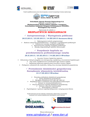 Projekt współfinansowany przez Unię Europejską w ramach Europejskiego Funduszu Społecznego Dolnośląska Agencja Rozwoju Regionalnego S.A. działając w partnerstwie z Międzynarodową Wyższą Szkołą Logistyki i Transportu, Dolnośląskimi Zakładami Usługowo-Produkcyjnymi DOZAMEL, Birmingham City Council Zapraszają do udziału w BEZPŁATNYCH SZKOLENIACH Autoprezentacja / Wystąpienia publiczne 26.X.2013 / 23.XI.2013 / 14.XII.2013 Szczawno-Zdrój Wykorzystanie technik autoprezentacji Budowa wizerunku przedsiębiorstwa / instytucji w wystąpieniach publicznych Podstawowe zasady wystąpień publicznych Zaawansowane aspekty wystąpień publicznych Zasady indywidualnych spotkań biznesowych Pozyskanie kapitału na przedsięwzięcia podwyższonego ryzyka 26.X.2013 / 23.XI.2013 / 14.XII.2013 Wrocław Inwestor Venture Capital bez tajemnic Dokumenty z którymi przyjdzie się zmierzyć przy współpracy z inwestorami kapitałowymi Czy warto współpracować z funduszami typu Venture Capital Najczęściej zadawane pytania przez inwestora Venture Capital Praktyczne wskazówki dla studentów, którzy chcą otworzyć działalność gospodarczą Prowadzenie działalności gospodarczej Zarządzanie własnością intelektualną 14-17.XI.2013 Wrocław Procedury zakładania działalności gospodarczej Formy działalności gospodarczej Specyfika działalności firm spin-off i spin-out Współpraca firm z uczelniami oraz jednostkami badawczymi Dotacje na rozwój przedsiębiorstwa Prawno-finansowe aspekty działalności gospodarczej Ochrona własności intelektualnej Komunikacja w biznesie Psychologiczne i rynkowe aspekty zdobywania i utrzymywania klienta Projekt skierowany jest do studentów, absolwentów, doktorantów, pracowników naukowych oraz naukowo-dydaktycznych dolnośląskich uczelni wyższych. Więcej informacji na: www.spinqbator.pl / www.darr.pl