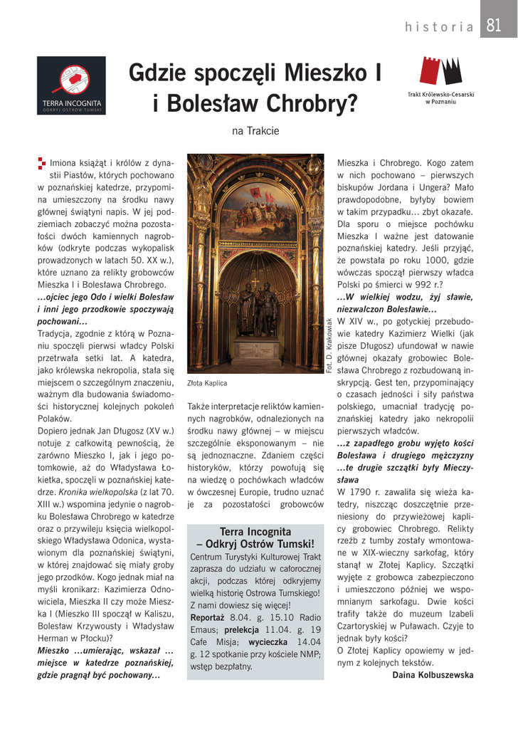 historia Gdzie spoczęli Mieszko I i Bolesław Chrobry? Imiona książąt i królów z dynastii Piastów, których pochowano w poznańskiej katedrze, przypomina umieszczony na środku nawy głównej świątyni napis. W jej podziemiach zobaczyć można pozostałości dwóch kamiennych nagrobków (odkryte podczas wykopalisk prowadzonych w latach 50. XX w.), które uznano za relikty grobowców Mieszka I i Bolesława Chrobrego. …ojciec jego Odo i wielki Bolesław i inni jego przodkowie spoczywają pochowani… Tradycja, zgodnie z którą w Poznaniu spoczęli pierwsi władcy Polski przetrwała setki lat. A katedra, jako królewska nekropolia, stała się miejscem o szczególnym znaczeniu, ważnym dla budowania świadomości historycznej kolejnych pokoleń Polaków. Dopiero jednak Jan Długosz (XV w.) notuje z całkowitą pewnością, że zarówno Mieszko I, jak i jego potomkowie, aż do Władysława Łokietka, spoczęli w poznańskiej katedrze. Kronika wielkopolska (z lat 70. XIII w.) wspomina jedynie o nagrobku Bolesława Chrobrego w katedrze oraz o przywileju księcia wielkopolskiego Władysława Odonica, wystawionym dla poznańskiej świątyni, w której znajdować się miały groby jego przodków. Kogo jednak miał na myśli kronikarz: Kazimierza Odnowiciela, Mieszka II czy może Mieszka I (Mieszko III spoczął w Kaliszu, Bolesław Krzywousty i Władysław Herman w Płocku)? Mieszko …umierając, wskazał … miejsce w katedrze poznańskiej, gdzie pragnął być pochowany… Fot. D. Krakowiak na Trakcie Złota Kaplica Także interpretacje reliktów kamiennych nagrobków, odnalezionych na środku nawy głównej – w miejscu szczególnie eksponowanym – nie są jednoznaczne. Zdaniem części historyków, którzy powołują się na wiedzę o pochówkach władców w ówczesnej Europie, trudno uznać je za pozostałości grobowców Terra Incognita – Odkryj Ostrów Tumski! Centrum Turystyki Kulturowej Trakt zaprasza do udziału w całorocznej akcji, podczas której odkryjemy wielką historię Ostrowa Tumskiego! Z nami dowiesz się więcej! Reportaż 8.04. g. 15.10 Radio Emaus; prelekcja 11.04. g. 19 Cafe Misja; wycieczka 14.04 g. 12 spotkanie przy kościele NMP; wstęp bezpłatny. Mieszka i Chrobrego. Kogo zatem w nich pochowano – pierwszych biskupów Jordana i Ungera? Mało prawdopodobne, byłyby bowiem w takim przypadku… zbyt okazałe. Dla sporu o miejsce pochówku Mieszka I ważne jest datowanie poznańskiej katedry. Jeśli przyjąć, że powstała po roku 1000, gdzie wówczas spoczął pierwszy władca Polski po śmierci w 992 r.? …W wielkiej wodzu, żyj sławie, niezwalczon Bolesławie… W XIV w., po gotyckiej przebudowie katedry Kazimierz Wielki (jak pisze Długosz) ufundował w nawie głównej okazały grobowiec Bolesława Chrobrego z rozbudowaną inskrypcją. Gest ten, przypominający o czasach jedności i siły państwa polskiego, umacniał tradycję poznańskiej katedry jako nekropolii pierwszych władców. …z zapadłego grobu wyjęto kości Bolesława i drugiego mężczyzny …te drugie szczątki były Mieczysława W 1790 r. zawaliła się wieża katedry, niszcząc doszczętnie przeniesiony do przywieżowej kaplicy grobowiec Chrobrego. Relikty rzeźb z tumby zostały wmontowane w XIX-wieczny sarkofag, który stanął w Złotej Kaplicy. Szczątki wyjęte z grobowca zabezpieczono i umieszczono później we wspomnianym sarkofagu. Dwie kości trafiły także do muzeum Izabeli Czartoryskiej w Puławach. Czyje to jednak były kości? O Złotej Kaplicy opowiemy w jednym z kolejnych tekstów. Daina Kolbuszewska 81