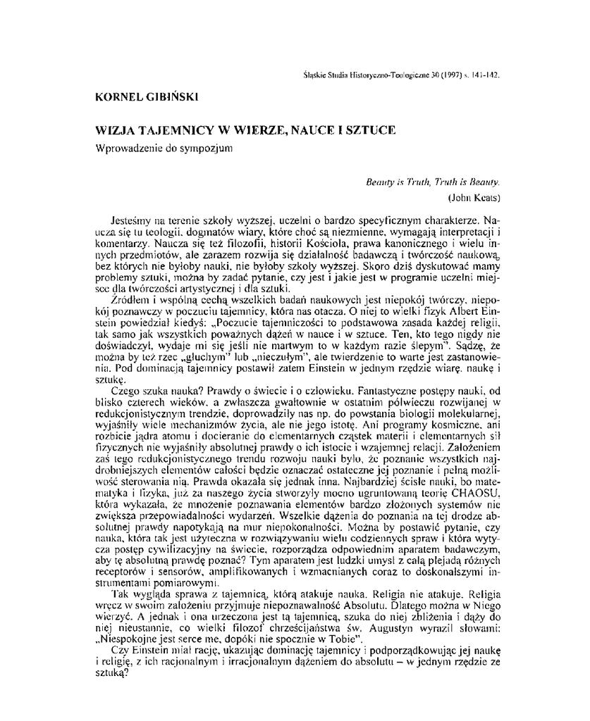 Śląskie Studia Historyc/no-Teologiczne 3 0 ( 1 9 9 7 ) s. 141-142. KORNEL GIBIŃSKI WIZJA TAJEMNICY W WIERZE, NAUCE I SZTUCE Wprowadzenie do sympozjum Be auty is Truth, Truih is Beauty. (John Keats) Jesteśmy na terenie szkoły wyższej, uczelni o bardzo specyficznym charakterze. Naucza się tu teologii, dogmatów wiary, które choć są niezmienne, wymagają interpretacji i komentarzy. Naucza się też filozofii, historii Kościoła, prawa kanonicznego i wielu innych przedmiotów, ale zarazem rozwija się działalność badawczą i twórczość naukową, bez których nie byłoby nauki, nie byłoby szkoły wyższej. Skoro dziś dyskutować mamy problemy sztuki, można by zadać pytanie, czy jest i jakie jest w programie uczelni miejsce dla twórczości artystycznej i dla sztuki. Źródłem i wspólną cechą wszelkich badań naukowych jest niepokój twórczy, niepokój poznawczy w poczuciu tajemnicy, która nas otacza. O niej to wielki fizyk Albert Einstein powiedział kiedyś: „Poczucie tajemniczości to podstawowa zasada każdej religii, tak samo jak wszystkich poważnych dążeń w nauce i w sztuce. Ten, kto tego nigdy nie doświadczył, wydaje mi się jeśli nie martwym to w każdym razie ślepym1'. Sądzę, że można by też rzec „głuchym" lub „nieczułym", ale twierdzenie to warte jest zastanowienia. Pod dominacją tajemnicy postawił zatem Einstein w jednym rzędzie wiarę, naukę i sztukę. Czego szuka nauka? Prawdy o świecie i o człowieku. Fantastyczne postępy nauki, od blisko czterech wieków, a zwłaszcza gwałtownie w ostatnim półwieczu rozwijanej w red u kej on i stycznym trendzie, doprowadziły nas np. do powstania biologii molekularnej, wyjaśniły wiele mechanizmów życia, ale nie jego istotę. Ani programy kosmiczne, ani rozbicie jądra atomu i docieranie do elementarnych cząstek materii i elementarnych sił fizycznych nie wyjaśniły absolutnej prawdy o ich istocie i wzajemnej relacji. Założeniem zaś tego redukcjonistycznego trendu rozwoju nauki było, że poznanie wszystkich najdrobniejszych elementów całości będzie oznaczać ostateczne jej poznanie i pełną możliwość sterowania nią. Prawda okazała się jednak inna. Najbardziej ścisłe nauki, bo matematyka i fizyka, już za naszego życia stworzyły mocno ugruntowaną teorię CHAOSU, która wykazała, że mnożenie poznawania elementów bardzo złożonych systemów nie zwiększa przepowiadalności wydarzeń. Wszelkie dążenia do poznania na tej drodze absolutnej prawdy napotykają na mur niepokonalności. Można by postawić pytanie, czy nauka, która tak jest użyteczna w rozwiązywaniu wielu codziennych spraw i która wytycza postęp cywilizacyjny na świecie, rozporządza odpowiednim aparatem badawczym, aby tę absolutną prawdę poznać? Tym aparatem jest ludzki umysł z całą plejadą różnych receptorów i sensorów, amplifikowanych i wzmacnianych coraz to doskonalszymi instrumentami pomiarowymi. Tak wygląda sprawa z tajemnicą, którą atakuje nauka. Religia nie atakuje. Religia wręcz w swoim założeniu przyjmuje niepoznawalność Absolutu. Dlatego można w Niego wierzyć. A jednak i ona urzeczona jest tą tajemnicą, szuka do niej zbliżenia i dąży do niej nieustannie, co wielki filozof chrześcijaństwa św. Augustyn wyraził słowami: „Niespokojne jest serce me, dopóki nie spocznie w Tobie". Czy Einstein miał rację, ukazując dominację tajemnicy i podporządkowując jej naukę i religię, z ich racjonalnym i irracjonalnym dążeniem do absolutu - w jednym rzędzie ze sztuką? 1 4 2 K O R N E L GIBIŃSKI Kto otarł się o sztukę, ten wie, że artysta też nieustannie szuka. Szuka piękna. On go nie tylko dostrzega, ale go też sam tworzy, czy to naśladując piękno tego świata, czy go przetwarzając w zmienionych kształtach, barwach, tonacjach czy też komponując wiązaną mową słowa i dźwięki, barwy i światło i wkładając w nie swoją wymowę, jakąś ekspresję. Tworzenie w sztuce to nie tylko technika lub warsztat artysty, tak samo jak twórczość naukowa to nie sarno laboratorium ani sama biblioteka. W obu musi być duch, wizja, natchnienie, inwencja, aura tworzenia i ten niepokój twórczy, który oplata umysł i nie daje spokoju, a zmusza do ciągłego podejmowania dalszych prób dla osiągania doskonałości. W tej docelowej perspektywie poeta identyfikował prawdę z pięknem, a piękno z prawdą. Oczywiście, w obu tych dziedzinach kulturowej działalności człowieka, w nauce i w sztuce, pełno jest prób i usiłowań i tego, co nazywamy pseudonauką i pseudosztuką. Tak pomysły, jak i wykonania mogą nie zawsze być udane, mogą być błędne, mogą prowadzić na manowce, a więc do antytezy prawdy i piękna, czyli do fałszu i brzydoty. Ale te się nigdy nie ostoją i choć czasem zauroczają jakimiś mirażami lub narzuconą modą, i zyskują czasowy poklask, w końcu zawsze zweryfikuje je czas. Dlatego w nauce, świadomi, że muszą się zdarzać, nigdy nie boimy się fałszów ani błędów, bo wiemy, że one się nigdy nie ostoją i prawdzie nie zagrożą, pod warunkiem, że będziemy kontynuować twórczą działalność badawczą. Można by więc z kolei postawić pytanie: Czy trzeba się bać o zagrożenie piękna, gdy rozwija się twórczość artystyczną? W historii tak nauki, jak i sztuki, na kanwie wieków zaznaczają się zawsze jakieś kamienie milowe, nieraz po wielu latach, po śmierci autorów i znaczą drogę tej ludzkiej twórczości nieustannie szukającej i dążącej do ideału. Mimo że wisi nad nami groźba, że nigdy naszymi ludzkimi narzędziami ani nie poznamy tej ostatecznej prawdy ani nie dosięgniemy tego skończonego piękna, które mogą być atrybutami tylko Absolutu. Trzeba jednak te dwie drogi rozwoju człowieka ukazywać. Świadomość tej drogi rozwojowej w twórczości naukowej i w twórczości sztuki winny towarzyszyć seminarzystom, którzy już w XXI wieku mają prowadzić ludzi, bo to właśnie one,