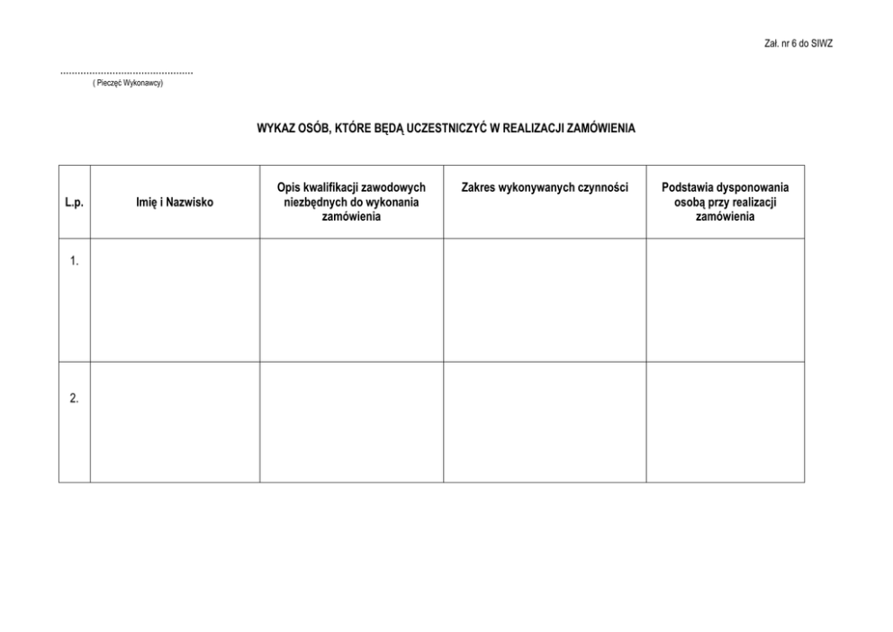 Zał. nr 6 do SIWZ .............................................. ( Pieczęć Wykonawcy) WYKAZ OSÓB, KTÓRE BĘDĄ UCZESTNICZYĆ W REALIZACJI ZAMÓWIENIA L.p. 1. 2. Imię i Nazwisko Opis kwalifikacji zawodowych niezbędnych do wykonania zamówienia Zakres wykonywanych czynności Podstawia dysponowania osobą przy realizacji zamówienia Zał. nr 6 do SIWZ 3. 4. ……………………………………… (podpis i pieczęć upoważnionego przedstawiciela wykonawcy)