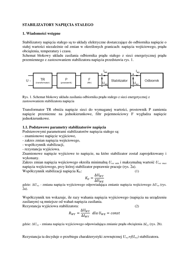 STABILIZATORY NAPIĘCIA STAŁEGO 1. Wiadomości wstępne Stabilizatory napięcia stałego są to układy elektryczne dostarczające do odbiornika napięcie o stałej wartości niezależnie od zmian w określonych granicach: napięcia wejściowego, prądu obciążenia, temperatury i czasu. Schemat blokowy układu zasilania odbiornika prądu stałego z sieci energetycznej prądu przemiennego z zastosowaniem stabilizatora napięcia przedstawia rys. 1. Rys. 1. Schemat blokowy układu zasilania odbiornika prądu stałego z sieci energetycznej z zastosowaniem stabilizatora napięcia Transformator TR obniża napięcie sieci do wymaganej wartości, prostownik P zamienia napięcie przemienne na jednokierunkowe, filtr pojemnościowy F wygładza napięcie jednokierunkowe. 1.1. Podstawowe parametry stabilizatorów napięcia Podstawowymi parametrami stabilizatorów napięcia stałego są: - znamionowe napięcie wyjściowe, - zakres zmian napięcia wejściowego, - współczynnik stabilizacji, - rezystancja wyjściowa. Znamionowe napięcie wyjściowe to napięcie, na które stabilizator został zaprojektowany i wykonany. Zakres zmian napięcia wejściowego określa minimalną Uwe min i maksymalną wartość Uwe max napięcia wejściowego, przy której stabilizator poprawnie pracuje (rys. 2a). Współczynnik stabilizacji napięcia KU: (1) ∆ ∆ gdzie: ∆Uwy - zmiana napięcia wyjściowego odpowiadająca zmianie napięcia wejściowego ∆Uwe (rys. 2a). Współczynnik ten wskazuje, ile razy wahania napięcia wyjściowego (napięcia na urządzeniu zasilanym) są mniejsze od wahań napięcia zasilania. Rezystancja wyjściowa stabilizatora: (2) ∆ ∆ gdzie: ∆Uwy - zmiana napięcia wyjściowego odpowiadająca zmianie prądu obciążenia ∆Iwy (rys. 2b). Rezystancja ta decyduje o przebiegu charakterystyki zewnętrznej Uwy=f(Iwy) stabilizatora. 1.2. Podstawowe charakterystyki stabilizatorów napięcia Podstawowymi charakterystykami stabilizatorów napięcia stałego są: - charakterystyka napięciowa Uwy=f(Uwe) przy Iwy=const, - charakterystyka zewnętrzna Uwy=f(Iwy) przy Uwe=const. Rys. 2. Podstawowe charakterystyki stabilizatorów napięcia stałego: a) charakterystyka napięciowa Uwy=f(Uwe) przy Iwy=const, b) charakterystyka zewnętrzna Uwy=f(Iwy) przy Uwe=const. 1.3. Klasyfikacja stabilizatorów Pod względem zasady działania stabilizatory można podzielić na dwa podstawowe rodzaje: - stabilizatory parametryczne, - stabilizatory kompensacyjne. Stabilizatory parametryczne Stabilizatory parametryczne wykorzystują nieliniowe charakterystyki napięciowo-prądowe elementów użytych do budowy stabilizatora. Najczęściej wykorzystywanym elementem stabilizującym w stabilizatorze parametrycznym jest dioda Zenera. Rys. 3. Stabilizator napięcia stałego z diodą Zenera: a) schemat elektryczny, b) charakterystyka napięciowo-prądowa diody Dioda Zenera jest to specjalna dioda krzemowa pracująca przy polaryzacji zaporowej przy napięciu nieznacznie wyższym od napięcia przebicia Uz (rys. 3b) nazywanego napięciem Zenera. Napięcie na pracującej diodzie, a tym samym na odbiorniku Ro, jest praktycznie stałe w szerokim przedziale zmian prądu Iz przepływającego przez diodę (rys. 3b - obszar pracy diody). Przy zmianach napięcia wejściowego U1, przy Ro=const, ulega zmianie natężenie prądu I1, ale w zasadzie tylko kosztem zmiany natężenia prądu Iz. W efekcie na rezystorze szeregowym R1 odkłada się praktycznie całkowity przyrost napięcia wejściowego, a napięcie wyjściowe pozostaje na tym samym poziomie. Jeżeli natomiast wzrośnie Ro przy U1=const, to zmienia się rozdział prądu I1 pomiędzy diodę a odbiornik w ten sposób, że prąd diody Iz wzrośnie tak, iż: (3) 4 5 6 7 W tym przypadku napięcie U2 na odbiorniku Ro również zostanie praktycznie na poprzednim poziomie. Jak wynika z charakterystyki napięciowo-prądowej diody (rys. 3b), stabilizator będzie poprawnie pracować, jeżeli będą spełnione następujące kryteria: - wynikające z zasilania: (4) 5 8 9 - wynikające z obciążenia: (5) 5 9 : 9;<= 5 > 5;<= gdzie: Uz - napięcie znamionowe diody, Iz - prąd znamionowy diody, Iz min - minimalna wartość prądu diody w czasie pracy stabilizatora (Iz min = 0,1 Iz). Należy zauważyć, że w układzie jak na rys. 3a, dioda jest najbardziej obciążona w stanie jałowym stabilizatora tj. kiedy odbiornik Ro jest odłączony. Z powyższego uwarunkowania wynika dobór odbiornika R1: - wartość rezystancji R1: (6) 4;?@ > 5 4 5 moc rezystora R1: (7) AB 5 7 gdzie: U1max - największa wartość napięcia wejściowego, jakie może wystąpić w czasie pracy stabilizatora. Przebieg charakterystyk zewnętrznych takiego stabilizatora jest zależny od położenia punktu pracy na charakterystyce napięciowo-prądowej w stanie jałowym, uzależnionym od wartości napięcia wejściowego U1: (8) 5 C 4 C 4;?@ Diody Zenera są wykonywane dla zakresu stabilizacji 2÷200 V przy prądach od kilkunastu do kilkuset miliamperów. Stabilizatory kompensacyjne Stabilizatory kompensacyjne w procesie stabilizacji porównują napięcie stabilizowane z wzorcowym i w przypadku ich różnicy tak działają na element sterujący, że kompensuje on zmiany napięcia wyjściowego. Na rys. 4 przedstawiony jest schemat blokowy stabilizatora kompensacyjnego. Rys. 4. Schemat blokowy stabilizatora kompensacyjnego Jeżeli wskutek zmiany np. napięcia U1 zmieni się napięcie stabilizowane U2, to wówczas układ porównująco-wzmacniający przekaże różnicę między napięciem odniesienia Us i napięciem U2 do sterownika, który powodować będzie kompensację zmiany napięcia U2. Obecnie stabilizatory kompensacyjne budowane są jako układy monolityczne, w których skład wchodzi wiele elementów połączonych w oparciu o złożony schemat wewnętrzny. Podstawowymi parametrami takich stabilizatorów są: - Uwe max - największa wartość napięcia wejściowego, - Uwy - znamionowe napięcie wyjściowe, - Iwy max - najwi
