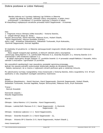 olimpia Dobra postawa w Lidze Halowej Bardzo dobrze na I turnieju Halowej Ligi Orlików w Sławnie spisali się piłkarze Olimpii. Odnieśli cztery zwycięstwa, a jeden mecz zremisowali i z dorobkiem 13 punktów zajmują 2 miejsce w tabeli. W klasyfikacji najlepszych strzelców prowadzi Karol Saganowski - 8 bramek. foto 1- fragment meczu Olimpia (żółte koszulki) - Victoria Sianów, 2 - zespół Olimpii stoją od lewej : Kacper Stroczyński, Kamil Herman, Mateusz Kunc, Hubert Stasik, Karol Saganowski, Henryk Kowalski (trener), dolny rząd : Arkadiusz Staszkiewicz, Sebastian Turkowski, Eryk Kokoszko, Dominik Saganowski, Konrad Jagódka W niedzielę 16 grudnia br. w Sławnie zainaugurowali rozgrywki młodzi piłkarze w ramach Halowej Ligi Orlików. Nasz zespół rozegrał pięć spotkań, w których odniósł cztery zwycięstwa pokonując Iskrę Kłanino 1:0, Leśnik/Zefir Manowo 5:2, Gwardię Koszalin 2:1, Victorię Sianów 2:0 i zremisował z UKS Grabowa Lejkowo 1:1. W tabeli zajmujemy drugie miejsce 13 punktów bramki 11-4 prowadzi zespół Bałtyku I Koszalin, który odniósł 5 zwyciestw i zgromadził 15 punktów. We wszystkich spotkaniach nasi zawodnicy posiadali ogromną przewagę, jednak nie zawsze potrafili wykorzystać doskonałe okazje do strzelenia bramki. Należy zaznaczyć, że w meczu z Lejkowem stracili pechowo gola w ostatniej minucie. Po zakończeniu turnieju rozegraliśmy mecz towarzyski z Victorią Sianów, który wygraliśmy 3:0. W tym spotkaniu w obu zespołach wystąpili zawodnicy rezerwowi. Skład : Arkadiusz Staszkiewicz - Kamil Herman, Karol Saganowski, Dominik Saganowski, Hubert Stasik, Sebastian Turkowski, Konrad Jagódka, Kacper Stroczyński, Mateusz Kunc, Eryk Kokoszko Trener : Henryk Kowalski Kierownik zespołu : Klaudia Saganowska Wyniki : Olimpia - Iskra Kłanino 1:0 ( bramka : Karol Saganowski), Olimpia - Leśnik/Zefir Manowo 5:2 ( Karol Saganowski - 3, Dominik Saganowski - 2), Olimpia - Grabowa Lejkowo 1:1 ( Karol Saganowski), Olimpia - Gwardia Koszalin 2:1 ( Karol Saganowski - 2), Olimpia - Victoria SP-2 Sianów 2:0 ( Karol Saganowski, Hubert Stasik ), mecz towarzyski : http://olimpia.bobolice.org/starawersja Kreator PDF Utworzono 8 March, 2017, 05:36 olimpia Olimpia II - Victoria SP - 2 II Sianów 3:0 ( Kacper Stroczyński, Konrad Jagódka) Zdjęcia dostępne tutaj. http://olimpia.bobolice.org/starawersja Kreator PDF Utworzono 8 March, 2017, 05:36