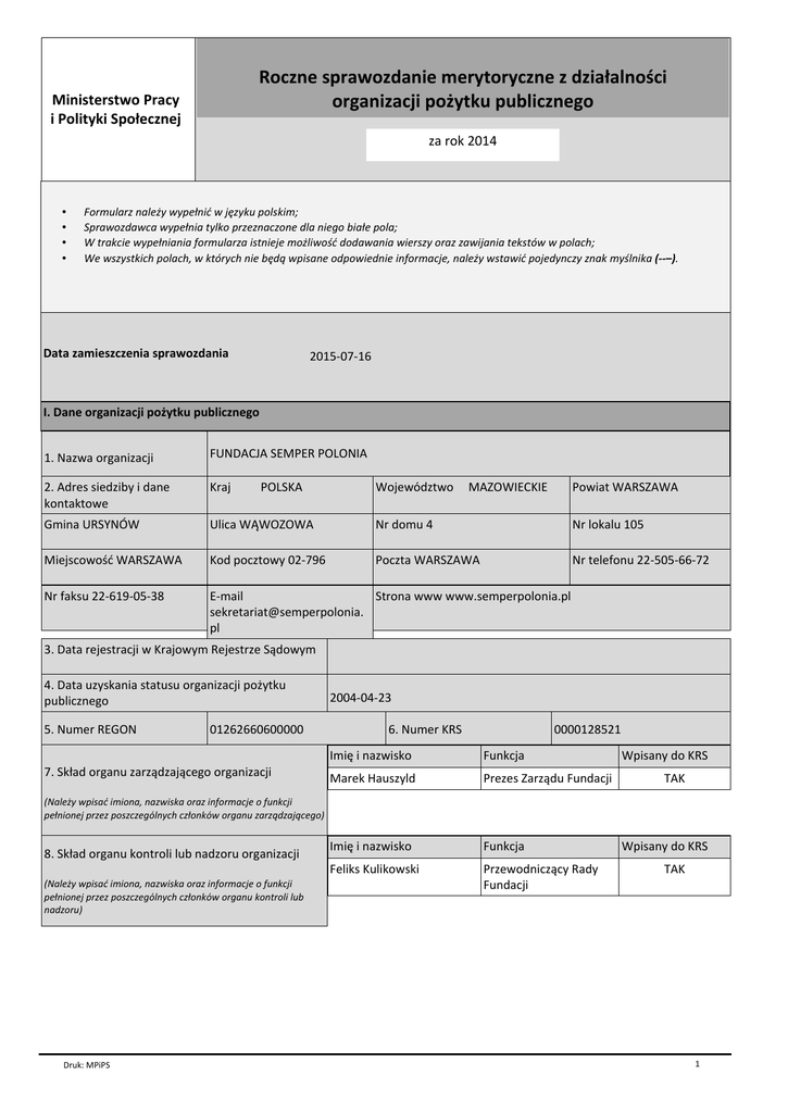 ZŽĐnjŶĞƐƉƌĂǁŽnjĚĂŶŝĞŵĞƌLJƚŽƌLJĐnjŶĞnjĚnjŝĂųĂůŶŽƑĐŝ ŽƌŐĂŶŝnjĂĐũŝƉŽǏLJƚŬƵƉƵďůŝĐnjŶĞŐŽ Ministerstwo Pracy ŝWŽůŝƚLJŬŝ^ƉŽųĞĐnjŶĞũ za rok 2014 • • • • &ŽƌŵƵůĂƌnjŶĂůĞǏLJǁLJƉĞųŶŝđǁũħnjLJŬƵƉŽůƐŬŝŵ͖ ^ƉƌĂǁŽnjĚĂǁĐĂǁLJƉĞųŶŝĂƚLJůŬŽƉƌnjĞnjŶĂĐnjŽŶĞĚůĂŶŝĞŐŽďŝĂųĞƉŽůĂ͖ tƚƌĂŬĐŝĞǁLJƉĞųŶŝĂŶŝĂĨŽƌŵƵůĂƌnjĂŝƐƚŶŝĞũĞŵŽǏůŝǁŽƑđĚŽĚĂǁĂŶŝĂǁŝĞƌƐnjLJŽƌĂnjnjĂǁŝũĂŶŝĂƚĞŬƐƚſǁǁƉŽůĂĐŚ͖ tĞǁƐnjLJƐƚŬŝĐŚƉŽůĂĐŚ͕ǁŬƚſƌLJĐŚŶŝĞďħĚČǁƉŝƐĂŶĞŽĚƉŽǁŝĞĚŶŝĞŝŶĨŽƌŵĂĐũĞ͕ŶĂůĞǏLJǁƐƚĂǁŝđƉŽũĞĚLJŶĐnjLJnjŶĂŬŵLJƑůŶŝŬĂ (--–). Data zamieszczenia sprawozdania 2015-07-16 /͘ĂŶĞŽƌŐĂŶŝnjĂĐũŝƉŽǏLJƚŬƵƉƵďůŝĐnjŶĞŐŽ 1. Nazwa organizacji FUNDACJA SEMPER POLONIA 2. Adres siedziby i dane kontaktowe Kraj Gmina URSYNÓW hůŝĐĂttKKt Nr domu 4 Nr lokalu 105 DŝĞũƐĐŽǁŽƑđtZ^t Kod pocztowy 02-796 Poczta WARSZAWA Nr telefonu 22-505-66-72 Nr faksu 22-619-05-38 E-mail Strona www www.semperpolonia.pl sekretariat@semperpolonia. pl POLSKA Województwo MAZOWIECKIE Powiat WARSZAWA ϯ͘ĂƚĂƌĞũĞƐƚƌĂĐũŝǁ<ƌĂũŽǁLJŵZĞũĞƐƚƌnjĞ^ČĚŽǁLJŵ ϰ͘ĂƚĂƵnjLJƐŬĂŶŝĂƐƚĂƚƵƐƵŽƌŐĂŶŝnjĂĐũŝƉŽǏLJƚŬƵ publicznego 5. Numer REGON 01262660600000 ϳ͘^ŬųĂĚŽƌŐĂŶƵnjĂƌnjČĚnjĂũČĐĞŐŽŽƌŐĂŶŝnjĂĐũŝ 2004-04-23 6. Numer KRS 0000128521 /ŵŝħŝŶĂnjǁŝƐŬŽ Funkcja Marek Hauszyld WƌĞnjĞƐĂƌnjČĚƵ&ƵŶĚĂĐũŝ /ŵŝħŝŶĂnjǁŝƐŬŽ Funkcja Feliks Kulikowski WƌnjĞǁŽĚŶŝĐnjČĐLJZĂĚLJ Fundacji Wpisany do KRS TAK ;EĂůĞǏLJǁƉŝƐĂđŝŵŝŽŶĂ͕ŶĂnjǁŝƐŬĂŽƌĂnjŝŶĨŽƌŵĂĐũĞŽĨƵŶŬĐũŝ ƉĞųŶŝŽŶĞũƉƌnjĞnjƉŽƐnjĐnjĞŐſůŶLJĐŚĐnjųŽŶŬſǁŽƌŐĂŶƵnjĂƌnjČĚnjĂũČĐĞŐŽͿ ϴ͘^ŬųĂĚŽƌŐĂŶƵŬŽŶƚƌŽůŝůƵďŶĂĚnjŽƌƵŽƌŐĂŶŝnjĂĐũŝ ;EĂůĞǏLJǁƉŝƐĂđŝŵŝŽŶĂ͕ŶĂnjǁŝƐŬĂŽƌĂnjŝŶĨŽƌŵĂĐũĞŽĨƵŶŬĐũŝ ƉĞųŶŝŽŶĞũƉƌnjĞnjƉŽƐnjĐnjĞŐſůŶLJĐŚĐnjųŽŶŬſǁŽƌŐĂŶƵŬŽŶƚƌŽůŝůƵď nadzoru) Druk: MPiPS Wpisany do KRS TAK 1 9. Cele statutowe organizacji ;EĂůĞǏLJŽƉŝƐĂđĐĞůĞŶĂƉŽĚƐƚĂǁŝĞƐƚĂƚƵƚƵŽƌŐĂŶŝnjĂĐũŝͿ ĞůĞŵĨƵŶĚĂĐũŝũĞƐƚƉŽŵŽĐƑƌŽĚŽǁŝƐŬŽŵƉŽůŽŶŝũŶLJŵŶĂƑǁŝĞĐŝĞ͕ ďƵĚŽǁĂŶŝĞƉŽůƐŬŝĞŐŽůŽďďLJŶĂĂƌĞŶŝĞŵŝħĚnjLJŶĂƌŽĚŽǁĞũ͕ƉƌŽŵŽǁĂŶŝĞ ƉŽůƐŬŝĐŚŝƉŽůŽŶŝũŶLJĐŚŽƐŝČŐŶŝħđ͕ǁƚLJŵŐŽƐƉŽĚĂƌĐnjLJĐŚ͕ŶĂƵŬŽǁLJĐŚŝ ŬƵůƚƵƌĂůŶLJĐŚŽƌĂnjƉŽĚĞũŵŽǁĂŶŝĞĚnjŝĂųĂŷŶĂƌnjĞĐnjnjĂĐŚŽǁĂŶŝĂƉŽůƐŬŝĞŐŽ ĚnjŝĞĚnjŝĐƚǁĂŬƵůƚƵƌŽǁĞŐŽŝŶĂƵŬŽǁĞŐŽǁWŽůƐĐĞŝŶĂƑǁŝĞĐŝĞ Fundacja realizuje swoje cele poprzez: 1͘tƐƉŝĞƌĂŶŝĞĂŬƚLJǁŝnjĂĐũŝŽƑǁŝĂƚŽǁŽʹnjĂǁŽĚŽǁĞũWŽůĂŬſǁŽƌĂnjŽƐſď 10. Sposób realizacji celów statutowych organizacji ƉŽĐŚŽĚnjĞŶŝĂƉŽůƐŬŝĞŐŽǁŬƌĂũĂĐŚŝĐŚnjĂŵŝĞƐnjŬĂŶŝĂ͕njǁųĂƐnjĐnjĂŵųŽĚnjŝĞǏLJ͖ ;EĂůĞǏLJŽƉŝƐĂđƐƉŽƐſďƌĞĂůŝnjĂĐũŝĐĞůſǁƐƚĂƚƵƚŽǁLJĐŚŽƌŐĂŶŝnjĂĐũŝŶĂ podstawie statutu organizacji) 2͘tƐƉſųƉƌĂĐħnjƉƌnjĞĚƐƚĂǁŝĐŝĞůĂŵŝǏLJĐŝĂŐŽƐƉŽĚĂƌĐnjĞŐŽnjĞƑƌŽĚŽǁŝƐŬ ƉŽůŽŶŝũŶLJĐŚŽƌĂnjƚǁŽƌnjĞŶŝĞǁƐƉſůŶLJĐŚƉƌnjĞĚƐŝħǁnjŝħđŐŽƐƉŽĚĂƌĐnjLJĐŚnj ŽƌŐĂŶŝnjĂĐũĂŵŝƉŽůŽŶŝũŶLJŵŝŽƌĂnjWŽůĂŬĂŵŝnjĂŵŝĞƐnjŬĂųLJŵŝnjĂŐƌĂŶŝĐČ͖ 3͘KƌŐĂŶŝnjŽǁĂŶŝĞƌſǏŶLJĐŚĨŽƌŵƉƌŽŵŽǁĂŶŝĂǁƑǁŝĞĐŝĞƉŽůƐŬŝĐŚŝ ƉŽůŽŶŝũŶLJĐŚŽƐŝČŐŶŝħđ͕ǁƚLJŵŐŽƐƉŽĚĂƌĐnjLJĐŚ͕ŶĂƵŬŽǁLJĐŚŝŬƵůƚƵƌĂůŶLJĐŚ͖ 4͘KƌŐĂŶŝnjŽǁĂŶŝĞĚnjŝĂųĂŷŝƉƌnjĞĚƐŝħǁnjŝħđǁŬŽųĂĐŚŐŽƐƉŽĚĂƌĐnjLJĐŚǁŬƌĂũƵ ŝnjĂŐƌĂŶŝĐČŶĂƌnjĞĐnjŬƵůƚLJǁŽǁĂŶŝĂƉŽůƐŬŝĞŐŽĚnjŝĞĚnjŝĐƚǁĂŬƵůƚƵƌŽǁĞŐŽŝ ŶĂƵŬŽǁĞŐŽǁWŽůƐĐĞŝŶĂƑǁŝĞĐŝĞ͖ 5͘KƌŐĂŶŝnjŽǁĂŶŝĞƉŽŵŽĐLJŚƵŵĂŶŝƚĂƌŶĞũƉŽƚƌnjĞďƵũČĐLJŵũĞũƑƌŽĚŽǁŝƐŬŽŵ polonijnym. //͘ŚĂƌĂŬƚĞƌLJƐƚLJŬĂĚnjŝĂųĂůŶŽƑĐŝŽƌŐĂŶŝnjĂĐũŝƉŽǏLJƚŬƵƉƵďůŝĐnjŶĞŐŽǁŽŬƌĞƐŝĞƐƉƌĂǁŽnjĚĂǁĐnjLJŵ ϭ͘KƉŝƐĚnjŝĂųĂůŶŽƑĐŝƉŽǏLJƚŬƵƉƵďůŝĐnjŶĞŐŽ ĞůĞƐƚĂƚƵƚŽǁĞ&ƵŶĚĂĐũĂƌĞĂůŝnjƵũĞǁŶĂƐƚħƉƵũČĐLJĐŚĨŽƌŵĂĐŚ͗ ϭ͘ϭ͘KƉŝƐŐųſǁŶLJĐŚ ĚnjŝĂųĂŷƉŽĚũħƚLJĐŚ ƉƌnjĞnjŽƌŐĂŶŝnjĂĐũħ 1͘&ƵŶĚŽǁĂŶŝĞƐƚLJƉĞŶĚŝſǁĞĚƵŬĂĐLJũŶLJĐŚŝŶĂƵŬŽǁLJĐŚĚůĂŶĂũnjĚŽůŶŝĞũƐnjĞũŵųŽĚnjŝĞǏLJŝŽƐſďƉŽĐŚŽĚnjĞŶŝĂ polskiego, 2͘ŽƌŐĂŶŝnjŽǁĂŶŝĞƐƚĂǏLJŝƉƌĂŬƚLJŬnjĂǁŽĚŽǁLJĐŚĚůĂŵųŽĚnjŝĞǏLJƉŽůŽŶŝũŶĞũ͖ 3͘ǁLJƉŽƐĂǏĂŶŝĞƐnjŬſų͕ƉůĂĐſǁĞŬŬƵůƚƵƌĂůŶLJĐŚŝŽƌŐĂŶŝnjĂĐũŝƉŽůŽŶŝũŶLJĐŚǁŬƐŝČǏŬŝ͕ƉŽĚƌħĐnjŶŝŬŝ͕ƐƉƌnjħƚ audiowizualny i pomoce naukowe W 2014 r. Fundacja SEMPER POLONIA, na podstawie umów z Ministerstwem Spraw Zagranicznych RP, njƌĞĂůŝnjŽǁĂųĂŶĂƐƚħƉƵũČĐĞƉƌŽũĞŬƚLJ͗ 1ͣ͘^njĂŶƐĂĚůĂŵĂƚƵƌnjLJƐƚſǁͲŬƵƌƐLJƉƌnjLJŐŽƚŽǁĂǁĐnjĞĚŽĞŐnjĂŵŝŶſǁ͟ͲnjĂũħĐŝĂĚŽĚĂƚŬŽǁĞĚůĂ maturzystów polskiego pochodzenia; 2ͣ͘DĞĚŝĂǁƐųƵǏďŝĞWŽůŽŶŝŝ͟ͲǁƐƉĂƌĐŝĞĨŝŶĂŶƐŽǁĞĚůĂŵĞĚŝſǁƉŽůŽŶŝũŶLJĐŚƉƌnjĞnjŶĂĐnjŽŶĞŶĂďŝĞǏČĐČ ĚnjŝĂųĂůŶŽƑđƌĞĚĂŬ