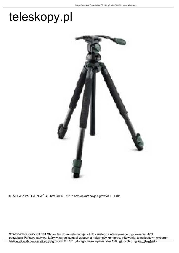 Statyw Swarovski Optik Carbon CT 101 g³owica DH 101 - oferta teleskopy.pl teleskopy.pl STATYW Z W£ÓKIEN WÊGLOWYCH CT 101 z bezkonkurencyjn± g³owic± DH 101 STATYW POLOWY CT 101 Statyw ten doskonale nadaje siê do czêstego i intensywnego u¿ytkowania. Je¶li potrzebuj± Pañstwo statywu, który w ka¿dej sytuacji zapewnia najwy¿szy komfort u¿ytkowania, to najlepszym wyborem bêdzie lekki statyw z w³ókien wêglowych CT 101 (którego masa wynosi tylko 1500 g), cechuj±cy siê ³atwo¶ci± http://teleskopy.pl/product_info.php?products_id=815 23 February, 2014, 22:37 i Statyw Swarovski Optik Carbon CT 101 g³owica DH 101 - oferta teleskopy.pl szybko¶ci± obs³ugi oraz pozwalaj±cy u¿ytkownikowi na prowadzenie wygodnej obserwacji z wysoko¶ci ok. 170 cm. • bardzo lekki i solidny statyw, Batwy w transporcie • idealny na dBu|sze wycieczki i podró|e oraz digiscoping z lekkim sprztem fotograficznym • dwusekcyjne rozsuwane nogi z wBókien wglowych • elementy metalowe wykonane z nierdzewnych stopów, m.in. anodyzowanego aluminium klasy lotniczej • wysoko[: 180cm G£OWICA DH 101 STABILNO¦Æ I FUNKCJONALNO¦Æ Stabilno¶æ nowej g³owicy statywu DH 101 zapewnia optymalne warunki do digiskopingu i prowadzenia obserwacji. SZYBKO I BEZPROBLEMOWO System Fast Mount (FMS) umo¿liwia szybki monta¿ lunety na g³owicy statywu przy u¿yciu jednej rêki. BEZPIECZNIE I STABILNIE Automatyczny uk³ad zabezpieczaj±cy lunetê na g³owicy statywu doskonale chroni j± przed przypadkowym obluzowaniem siê. £ATWO I ZGODNIE Z WYMAGANIAMI Obie osie mo¿na zablokowaæ jednym ruchem rêki. Ponadto u¿ytkownik mo¿e regulowaæ i ustalaæ zakres ruchu wychylnego i obrotowego zgodnie z w³asnymi potrzebami aby obs³uga by³a nieskomplikowana i wygodna. http://teleskopy.pl/product_info.php?products_id=815 23 February, 2014, 22:37 Statyw Swarovski Optik Carbon CT 101 g³owica DH 101 - oferta teleskopy.pl PRAKTYCZNIE I PRECYZYJNIE Zintegrowana poziomica u³atwia w³a¶ciwe ustawienie statywu. Doskona³a stabilno¶æ wyklucza nawet najmniejsze niepo¿±dane ruchy podczas obserwacji i digiscopingu. http://teleskopy.pl/product_info.php?products_id=815 23 February, 2014, 22:37