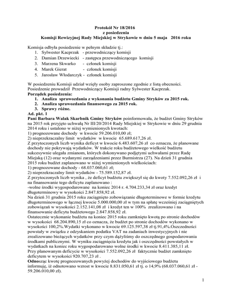 Protokół Nr 18/2016 z posiedzenia Komisji Rewizyjnej Rady Miejskiej w Strykowie w dniu 5 maja 2016 roku Komisja odbyła posiedzenie w pełnym składzie tj.: 1. Sylwester Kacprzak - przewodniczący komisji 2. Damian Drzewiecki - zastępca przewodniczącego komisji 3. Marzena Skwarko - członek komisji 4. Marek Gierat - członek komisji 5. Jarosław Włodarczyk - członek komisji W posiedzeniu Komisji udział wzięły osoby zaproszone zgodnie z listą obecności. Posiedzenie prowadził Przewodniczący Komisji radny Sylwester Kacprzak. Porządek posiedzenia: 1. Analiza sprawozdania z wykonania budżetu Gminy Stryków za 2015 rok. 2. Analiza sprawozdania finansowego za 2015 rok. 3. Sprawy różne. Ad. pkt. 1 Pani Barbara Walak Skarbnik Gminy Stryków poinformowała, że budżet Gminy Stryków na 2015 rok przyjęto uchwałą Nr III/20/2014 Rady Miejskiej w Strykowie w dniu 29 grudnia 2014 roku i ustalono w niżej wymienionych kwotach: 1) prognozowane dochody w kwocie 59.206.010,00 zł; 2) nieprzekraczalny limit wydatków w kwocie 65.689.617,26 zł. Z przytoczonych liczb wynika deficyt w kwocie 6.483.607,26 zł co oznacza, że planowane dochody nie pokrywają wydatków. W trakcie roku budżetowego wielkość budżetu sukcesywnie ulegała zmianom, których dokonywano podjętymi uchwałami przez Radę Miejską (12) oraz wydanymi zarządzeniami przez Burmistrza (27). Na dzień 31 grudnia 2015 roku budżet zaplanowano w niżej wymienionych wielkościach: 1) prognozowane dochody - 68.037.060,61 zł; 2) nieprzekraczalny limit wydatków - 75.589.152,87 zł. Z przytoczonych liczb wynika , że deficyt budżetu zwiększył się do kwoty 7.552.092,26 zł i na finansowanie tego deficytu zaplanowano : -wolne środki wygospodarowane na koniec 2014 r. 4.704.233,34 zł oraz kredyt długoterminowy w wysokości 2.847.858,92 zł. Na dzień 31 grudnia 2015 roku zaciągnięto zobowiązanie długoterminowe w formie kredytu długoterminowego w łącznej kwocie 5.000.000,00 zł w tym na spłatę wcześniej zaciągniętych zobowiązań w wysokości 2.152.141,08 zł i kredyt ten w 100% zrealizowano i na finansowanie deficytu budżetowego 2.847.858,92 zł. Ostatecznie wykonanie budżetu na koniec 2015 roku zamknięto kwotą po stronie dochodów w wysokości 68.204.890,15 zł co oznacza, że budżet po stronie dochodów wykonano w wysokości 100,2%.Wydatki wykonano w kwocie 69.125.597,38 zł tj.91,4%.Oszczedności powstały w związku z odzyskaniem podatku VAT na zadaniach inwestycyjnych i nie zrealizowano bieżących wydatków przy czym dążyliśmy do oszczędnego gospodarowania środkami publicznymi. W wyniku zaciągnięcia kredytu jak i oszczędności powstałych w wydatkach na koniec roku wygospodarowano wolne środki w kwocie 8.411.385,11 zł. Przy planowanym deficycie w wysokości 7.552.092,26 zł faktycznie budżet zamknięto deficytem w wysokości 920.707,23 zł . Odnosząc kwotę prognozowanych powyżej dochodów do wyjściowego budżetu informuję, iż odnotowano wzrost w kwocie 8.831.050,61 zł tj. o 14,9% (68.037.060,61 zł 59.206.010,00 zł). 1 Uwzględniając zaplanowane dochody w kwocie 68.037.060,61 zł i zestawiając z kwotą planowanych wydatków w wysokości 75.589.152,87 zł informuję, że budżet na dzień 31 grudnia 2015 roku wykazuje deficyt w kwocie 7.552.092,26 zł. Na finansowanie wykazanego deficytu wskazano bezkosztowe źródło finansowania tj. wolne środki w wysokości 4.704.233,34 zł oraz kredyt długoterminowy w kwocie 2.847.858,92 zł. Dług publiczny na dzień 31 grudnia 2015 roku wynosi 13.754.576,95 zł, co stanowi 20,2 % wykonanych dochodów omawianego okresu sprawozdawczego. Uwzględniając plan dochodów w kwocie 68.037.060,61 zł wykonanie zamknięto kwotą 68.204.890,15 zł - 100,2%. Wydatki natomiast na ustalony plan w wysokości 75.589.152,87 zł zrealizowano na kwotę 69.125.597,38 zł - 91,4%. Radny Damian Drzewiecki pytał m.in.: co jest zawarte w określeniu ,, ochrona odbiorcy wrażliwego energii elektrycznej ʼʼ ? na czym polega wprowadzanie wód opadowych do kanalizacji sanitarnej? czego dotyczy sformułowanie ,, sfinansowanie kosztów usunięcia i parkowania porzuconych pojazdów za okres od 03.07.2010r. - 22.07.2015r. - 97.335,00 zł ʼʼ ?. co to są najaśnice? mamy najwyższe zaległości w dz.756 w podatku od nieruchomości? Pani Skarbnik wyjaśniła, że dotyczy to osób o niskich dochodach o trudnej sytuacji finansowej i wypłatę dla nich dodatku mieszkaniowego za zużycie energii elektrycznej. Wody opadowe z terenu miasta Strykowa są odprowadzane do kanalizacji sanitarnej i oczyszczalni ścieków i my finansujemy koszty odprowadzania tych wód. Miesięcznie ŁODR podaje nam wielkości tych wód. Odbyła się sprawa sądowa i w związku z rozstrzygnięciem na naszą niekorzyść zobowiązani byliśmy uregulować tą należność do Starostwa Powiatowego w Zgierzu, przede wszystkim SA to koszty parkingu pojazdów porzuconych. Udzielona została dotacja dla PSP w Zgierzu poprzez Fundusz Wsparcia na zakup lamp oświetleniowych używanych w porze nocnej przy zdarzeniach, wypadkach. Zaległości w podatku od nieruchomości : Na dzień 31 grudnia 2015 r. łączne zaległości w dziale 756 wynoszą kwotę 2.544.792,68 zł, z tego najwyższą kwotę stanowią zaległości z podatku od nieruchomości - jgu - 1.633.627,83 zł. Odnosząc tą kwotę do danych na koniec 2014 roku, informuję iż w 2015 roku zwiększyła się zaległość o 68.509,83 zł i stanowi 0,3% ogółem zainkasowanych kwot z omawianego tytułu (1.565.118,00 zł; 1.633.627,83 zł).Większość tych zaległości jest z lat wcześniejszych i jest to należność trudna do odzyskania. Mamy również informację , że od trzech podatników nie uda się wyegzekwować należności z uwagi na brak majątku. Toczą się postępowania w stosunku do pozostałych podatników. Wykonanie budżetu po stronie wydatków zamknięto kwotą 69.125.597,38 zł tj. 91,4%. Dominującą pozycją są wydatki majątkowe 