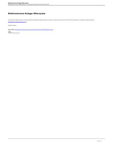 Elektroniczna Księga Wieczysta Opublikowane przez: Sąd Okręgowy w Tarnobrzegu (http://www.tarnobrzeg.so.gov.pl) Elektroniczna Księga Wieczysta Przeglądarka ksiąg wieczystych umożliwia bezpośredni wgląd do ksiąg wieczystych w sądach w których wdrożono system informatyczny zakładania i prowadzenia ksiąg wieczystych. Przeglądarka Ksiąg Wieczystych [1] Radosław Skwara Source URL: http://www.tarnobrzeg.so.gov.pl/content/elektroniczna-ksi%C4%99ga-wieczysta Links: [1] http://ekw.ms.gov.pl Page 1 of 1 Powered by TCPDF (www.tcpdf.org)