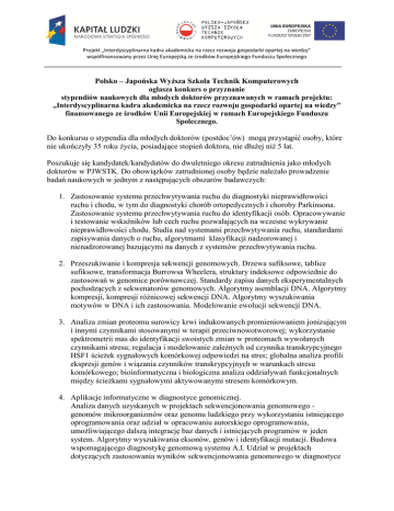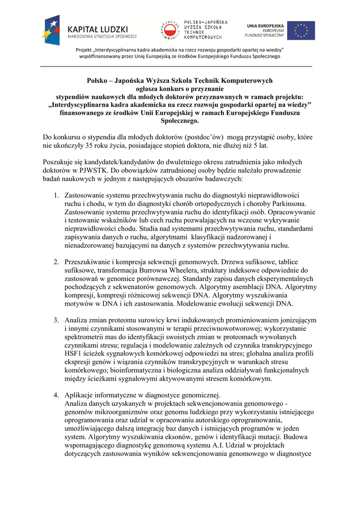 Projekt „Interdyscyplinarna kadra akademicka na rzecz rozwoju gospodarki opartej na wiedzy” współfinansowany przez Unię Europejską ze środków Europejskiego Funduszu Społecznego Polsko – Japońska Wyższa Szkoła Technik Komputerowych ogłasza konkurs o przyznanie stypendiów naukowych dla młodych doktorów przyznawanych w ramach projektu: „Interdyscyplinarna kadra akademicka na rzecz rozwoju gospodarki opartej na wiedzy” finansowanego ze środków Unii Europejskiej w ramach Europejskiego Funduszu Społecznego. Do konkursu o stypendia dla młodych doktorów (postdoc’ów) mogą przystąpić osoby, które nie ukończyły 35 roku życia, posiadające stopień doktora, nie dłużej niż 5 lat. Poszukuje się kandydatek/kandydatów do dwuletniego okresu zatrudnienia jako młodych doktorów w PJWSTK. Do obowiązków zatrudnionej osoby będzie należało prowadzenie badań naukowych w jednym z następujących obszarów badawczych: 1. Zastosowanie systemu przechwytywania ruchu do diagnostyki nieprawidłowości ruchu i chodu, w tym do diagnostyki chorób ortopedycznych i choroby Parkinsona. Zastosowanie systemu przechwytywania ruchu do identyfikacji osób. Opracowywanie i testowanie wskaźników lub cech ruchu pozwalających na wczesne wykrywanie nieprawidłowości chodu. Studia nad systemami przechwytywania ruchu, standardami zapisywania danych o ruchu, algorytmami klasyfikacji nadzorowanej i nienadzorowanej bazującymi na danych z systemów przechwytywania ruchu. 2. Przeszukiwanie i kompresja sekwencji genomowych. Drzewa sufiksowe, tablice sufiksowe, transformacja Burrowsa Wheelera, struktury indeksowe odpowiednie do zastosowań w genomice porównawczej. Standardy zapisu danych eksperymentalnych pochodzących z sekwenatorów genomowych. Algorytmy asemblacji DNA. Algorytmy kompresji, kompresji różnicowej sekwencji DNA. Algorytmy wyszukiwania motywów w DNA i ich zastosowania. Modelowanie ewolucji sekwencji DNA. 3. Analiza zmian proteomu surowicy krwi indukowanych promieniowaniem jonizującym i innymi czynnikami stosowanymi w terapii przeciwnowotworowej; wykorzystanie spektrometrii mas do identyfikacji swoistych zmian w proteomach wywołanych czynnikami stresu; regulacja i modelowanie zależnych od czynnika transkrypcyjnego HSF1 ścieżek sygnałowych komórkowej odpowiedzi na stres; globalna analiza profili ekspresji genów i wiązania czynników transkrypcyjnych w warunkach stresu komórkowego; bioinformatyczna i biologiczna analiza oddziaływań funkcjonalnych między ścieżkami sygnałowymi aktywowanymi stresem komórkowym. 4. Aplikacje informatyczne w diagnostyce genomicznej. Analiza danych uzyskanych w projektach sekwencjonowania genomowego genomów mikroorganizmów oraz genomu ludzkiego przy wykorzystaniu istniejącego oprogramowania oraz udział w opracowaniu autorskiego oprogramowania, umożliwiającego dalszą integrację baz danych i istniejących programów w jeden system. Algorytmy wyszukiwania eksonów, genów i identyfikacji mutacji. Budowa wspomagającego diagnostykę genomową systemu A.I. Udział w projektach dotyczących zastosowania wyników sekwencjonowania genomowego w diagnostyce Projekt „Interdyscyplinarna kadra akademicka na rzecz rozwoju gospodarki opartej na wiedzy” współfinansowany przez Unię Europejską ze środków Europejskiego Funduszu Społecznego genetycznej i medycynie spersonalizowanej i obejmujących analizę, archiwizację, (budowę genomowych baz danych), zabezpieczenie i udostępnianie danych genomowych poprzez interfejs internetowy. 5. Automatyczne rozpoznawanie mowy. Wykorzystanie warunkowych pól losowych (segmental CRF) oraz sieci „deep belief” (DBN) w modelowaniu akustycznym i statystycznym modelowaniu języka. Dobór parametryzacji sygnału mowy – ortogonalizacja i redukcja danych, segmentacja strumienia audio. Algorytmy maszynowego uczenia i kryteria ich doboru. Wyszukiwanie słów kluczowych w strumieniu audio. 6. Automatyczne tłumaczenie z mowy na mowę. Metody statystycznego tłumaczenia, połączenie tłumaczenia i rozpoznawania mowy. Tworzenie korpusów równoległych. Ocena jakości tłumaczeń. Zaawansowana synteza mowy. 7. Ekstrakcja informacji muzycznej. Analiza emocji w muzyce. Automatyczne wykrywanie instrumentów w dźwiękach polifonicznych. Metryki podobieństwa i doboru utworów muzycznych. 8. Metody symulacji i analizy przepływów krwi w układzie krwionośnym z wykorzystaniem narzędzi sztucznej inteligencji prowadzące do polepszenia jakości i szybkości diagnozowania o stanie narządów wewnętrznych. Wnioski o przyznanie stypendium należy składać na formularzu wniosku stanowiącym załącznik do niniejszego ogłoszenia. Szczegółowe kryteria konkursowe, na podstawie których oceniane będą wnioski przedstawione są w Protokole z posiedzenia Rady Naukowej Projektu, który stanowi załącznik do Regulaminu przyznawania stypendiów naukowych dla młodych doktorów. Wnioski wraz z dokumentacją poświadczającą dorobek naukowy oraz oświadczeniem o zapoznaniu się z Regulaminem przyznawania stypendiów prosimy składać osobiście w Komórce ds. projektów PJWSTK w Warszawie, kod 02-008, ul. Koszykowa 86, pokój A2 (Antresola) lub przesłać pocztą, za potwierdzeniem odbioru, zamieszczając na kopercie napis: „Konkurs o przyznanie stypendiów naukowych dla młodych doktorów przyznawanych w ramach projektu: „Interdyscyplinarna kadra akademicka na rzecz rozwoju gospodarki opartej na wiedzy” finansowanego ze środków Unii Europejskiej w ramach Europejskiego Funduszu Społecznego”. Termin składania wniosków: 15 września 2011 r. do godz. 15.00 Terminy rozmów kwalifikacyjnych: 19 września – Bytom; 21 września - Warszawa Kontakt: Polsko-Japońska Wyższa Szkoła Technik Komputerowych Komórka ds. Projektów pokój A2 (Antresola) ul. Koszykowa 86; 02-008 Warszawa Osobą uprawnioną do kontaktu z osobami zainteresowanymi jest pani Justyna Żurawska, e-mail [email protected]; tel. (