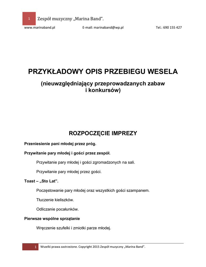 Zespół muzyczny „Marina Band”. 1 www.marinaband.pl E-mail: [email protected] Tel.: 690 155 427 PRZYKŁADOWY OPIS PRZEBIEGU WESELA (nieuwzględniający przeprowadzanych zabaw i konkursów) ROZPOCZĘCIE IMPREZY Przeniesienie pani młodej przez próg. Przywitanie pary młodej i gości przez zespół. Przywitanie pary młodej i gości zgromadzonych na sali. Przywitanie pary młodej przez gości. Toast – „Sto Lat”. Poczęstowanie pary młodej oraz wszystkich gości szampanem. Tłuczenie kieliszków. Odliczanie pocałunków. Pierwsze wspólne sprzątanie Wręczenie szufelki i zmiotki parze młodej. 1 Wszelki prawa zastrzeżone. Copyright 2015 Zespół muzyczny „Marina Band”. Zespół muzyczny „Marina Band”. 2 www.marinaband.pl E-mail: [email protected] Tel.: 690 155 427 Prośba o doping. Pomoc pań z obsługi w sprzątaniu. Zaproszenie gości na uroczysty obiad. Poinformowanie gości o istnieniu tablicy z oznaczeniami miejsc siedzących (jeżeli takowa istnieje). UROCZYSTY OBIAD Przywitanie wybranych osób, uczestniczących w imprezie. W tle dyskretnie puszczona muzyka - następujące utwory: „Celebration”, „Sweet Home Alabama”, „Wicke game”. Witamy gości: rodziców państwa młodych, chrzestnych, świadków i dziadków. Zespół dysponuje najważniejszymi informacjami o wymienionych osobach. Krótki blok piosenek, wykonanych przez zespół. Zespół wykonuje utwory instrumentalne, towarzyszące gościom podczas obiadu. Przerwa na zjedzenie posiłku. Przesyłka z Włoch Pan młody otrzymuje list od kolegów z Włoch... PIERWSZY TANIEC I ZABAWA INTEGRACYJNA 2 Wszelki prawa zastrzeżone. Copyright 2015 Zespół muzyczny „Marina Band”. Zespół muzyczny „Marina Band”. 3 www.marinaband.pl E-mail: [email protected] Tel.: 690 155 427 Para młoda wykonuje pierwszy taniec. Państwo młodzi sa proszeni na środek sali. Goście ustawiają się wokół, w taki sposób, aby zrobić tańczącym jak najwięcej miejsca. Kółeczka zapoznawcze Goście zapoznają się poprzez taniec w dwóch kółkach. /Zabawy i bloki muzyczne/ TORT Niespodzianka od pary młodej – uroczysty tort. Gasną światła, wykonane zostają fanfary. Państwo młodzi są proszeni o pokrojenie tortu oraz poczęstowanie się. Zostaje przewidziana chwila na zrobienie parze młodej zdjęć. Nastepuje rozdanie tortu gościom. /Zabawy i bloki muzyczne/ 3 Wszelki prawa zastrzeżone. Copyright 2015 Zespół muzyczny „Marina Band”. Zespół muzyczny „Marina Band”. 4 www.marinaband.pl E-mail: [email protected] Tel.: 690 155 427 PODZIĘKOWANIA DLA RODZICÓW Para młoda dziękuje rodzicom. Zaproszeni na parkiet zostają rodzice oraz para młoda. Państwo młodzi w uroczysty sposób dziękują rodzicom. Blok muzyczny Po podziękowaniach rozpoczynamy blok muzyczny, pierwsza piosenka jest dedykowana rodzicom pary młodej. /Zabawy i bloki muzyczne/ OCZEPINY Rzucanie welonem. Na środku parkietu przygotowane zostaje miejsce siedzące. Pani młoda siada, a panny tworzą kółko. Panny tańczą wokół pani młodej. Gdy muzyka przestaje grać, pani młoda rzuca welonem. Osoba, która schwyci welon zostaje mianowana nowo-wybraną panią młodą. Rzucanie krawatem lub muszką Pan młody zajmuje miejsce. Krawat lub muszka zostaje złapany przez jednego z kawalerów, tańczących wokół pana młodego. 4 Wszelki prawa zastrzeżone. Copyright 2015 Zespół muzyczny „Marina Band”. Zespół muzyczny „Marina Band”. 5 www.marinaband.pl E-mail: [email protected] Tel.: 690 155 427 Taniec nowo-wybranej pary młodej Para, która schwytała welon i krawat / muszkę „w nagrodę” musi zatańczyć tango. Blok zabaw i konkursów „oczepinowych". Po oczepinach następuje blok zabaw. /Zabawy i bloki muzyczne/ 5 Wszelki prawa zastrzeżone. Copyright 2015 Zespół muzyczny „Marina Band”.