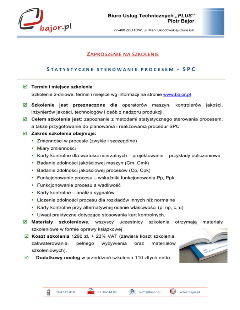 Biuro Usług Technicznych „PLUS” Piotr Bajor 77-400 ZŁOTÓW, ul. Marii Skłodowskiej-Curie 6/6 ZAPROSZENIE NA SZKOLENIE S T A T Y S T Y C Z N E S T E R O W A N I E P R O C E S E M -‐ S P C þ Termin i miejsce szkolenia: Szkolenie 2-dniowe: termin i miejsce wg informacji na stronie www.bajor.pl þ Szkolenie jest przeznaczone dla operatorów maszyn, kontrolerów jakości, inżynierów jakości, technologów i osób z nadzoru produkcji. þ Celem szkolenia jest: zapoznanie z metodami statystycznego sterowania procesem, a także przygotowanie do planowania i realizowania procedur SPC þ Zakres szkolenia obejmuje: • Zmienności w procesie (zwykłe i szczególne) • Miary zmienności • Karty kontrolne dla wartości mierzalnych – projektowanie – przykłady obliczeniowe • Badanie zdolności jakościowej maszyn (Cm, Cmk) • Badanie zdolności jakościowej procesów (Cp, Cpk) • Funkcjonowanie procesu – wskaźniki funkcjonowania Pp, Ppk • Funkcjonowanie procesu a wadliwość • Karty kontrolne – analiza sygnałów • Liczenie zdolności procesu dla rozkładów innych niż normalne • Karty kontrolne przy alternatywnej ocenie właściwości (p, np, c, u) • Uwagi praktyczne dotyczące stosowania kart kontrolnych. þ Materiały szkoleniowe, wszyscy uczestnicy szkolenia otrzymają szkoleniowe w formie oprawy książkowej þ Koszt szkolenia 1290 zł. + 23% VAT (zawiera koszt szkolenia, zakwaterowania, pełnego wyżywienia oraz materiałów szkoleniowych). þ Dodatkowy nocleg w przeddzień szkolenia 110 złtych netto. 604 110 410 67 342 44 89 [email protected] www.bajor.pl materiały