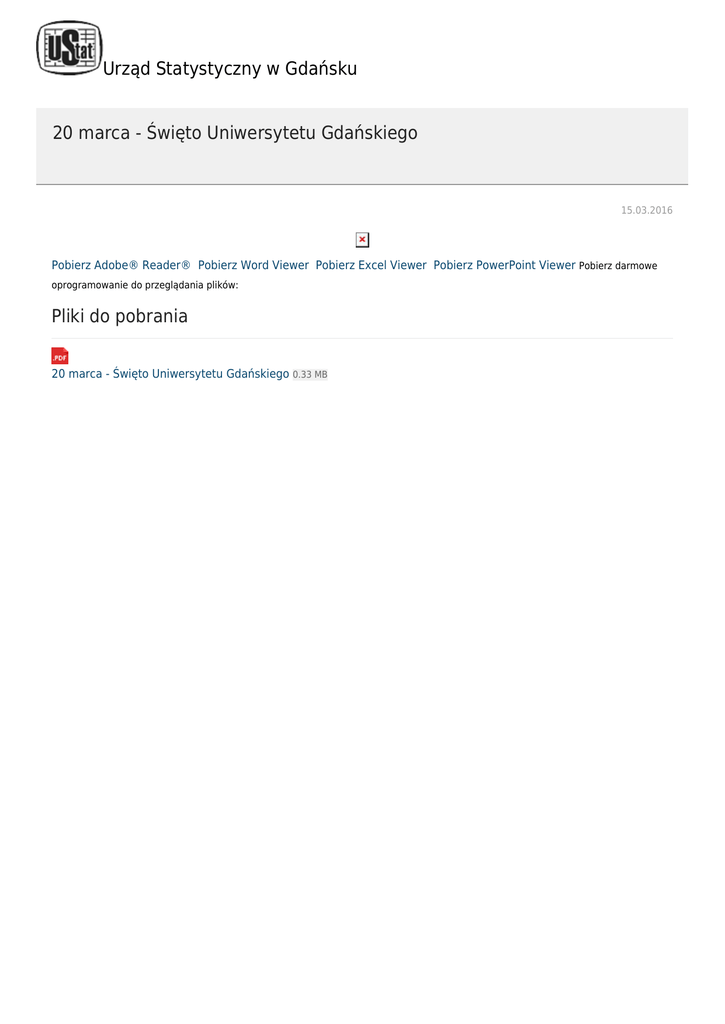 Urząd Statystyczny w Gdańsku 20 marca - Święto Uniwersytetu Gdańskiego 15.03.2016 Pobierz Adobe® Reader® Pobierz Word Viewer Pobierz Excel Viewer Pobierz PowerPoint Viewer Pobierz darmowe oprogramowanie do przeglądania plików: Pliki do pobrania 20 marca - Święto Uniwersytetu Gdańskiego 0.33 MB